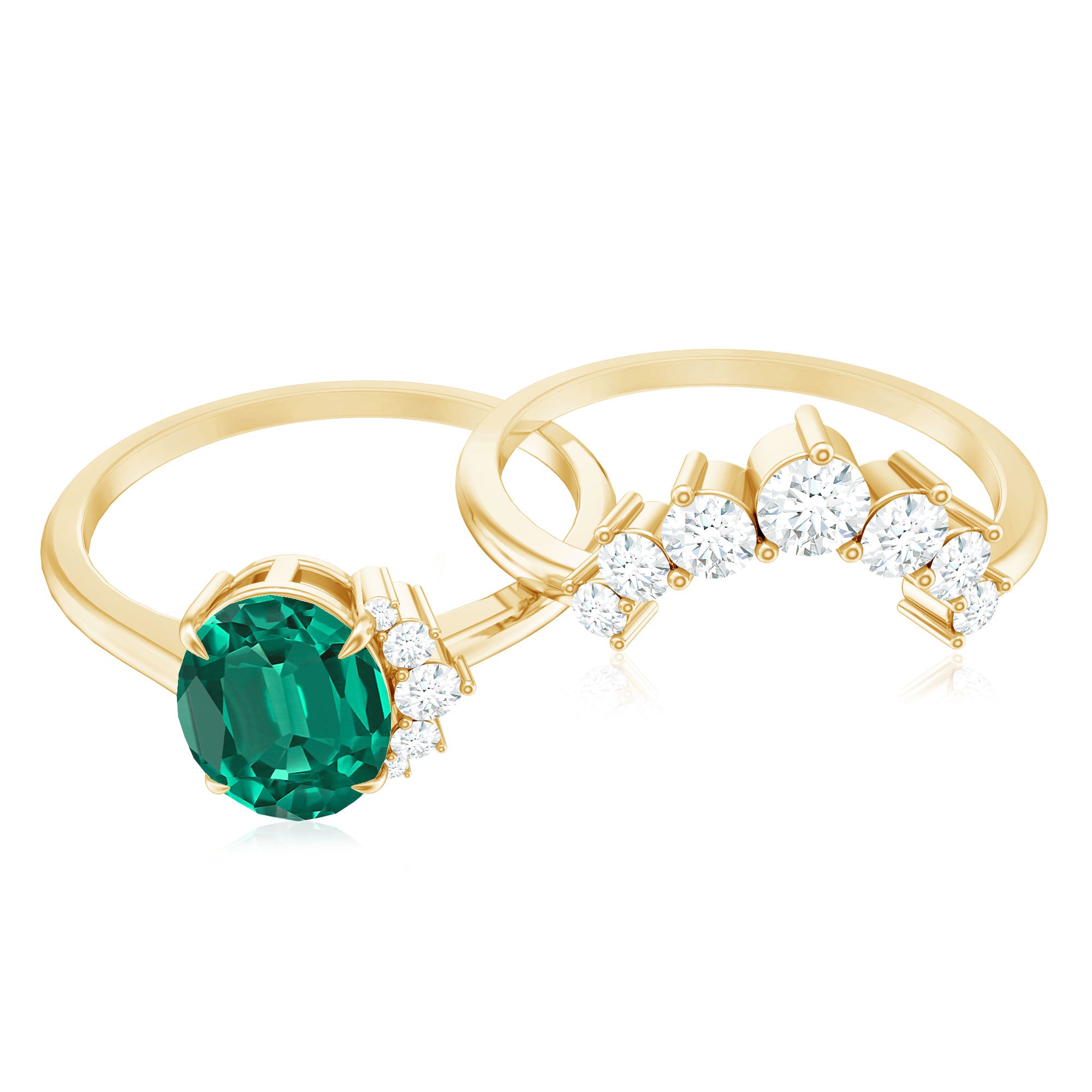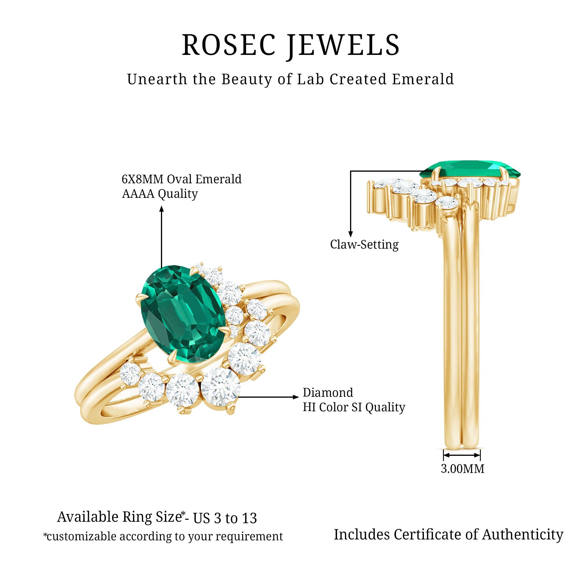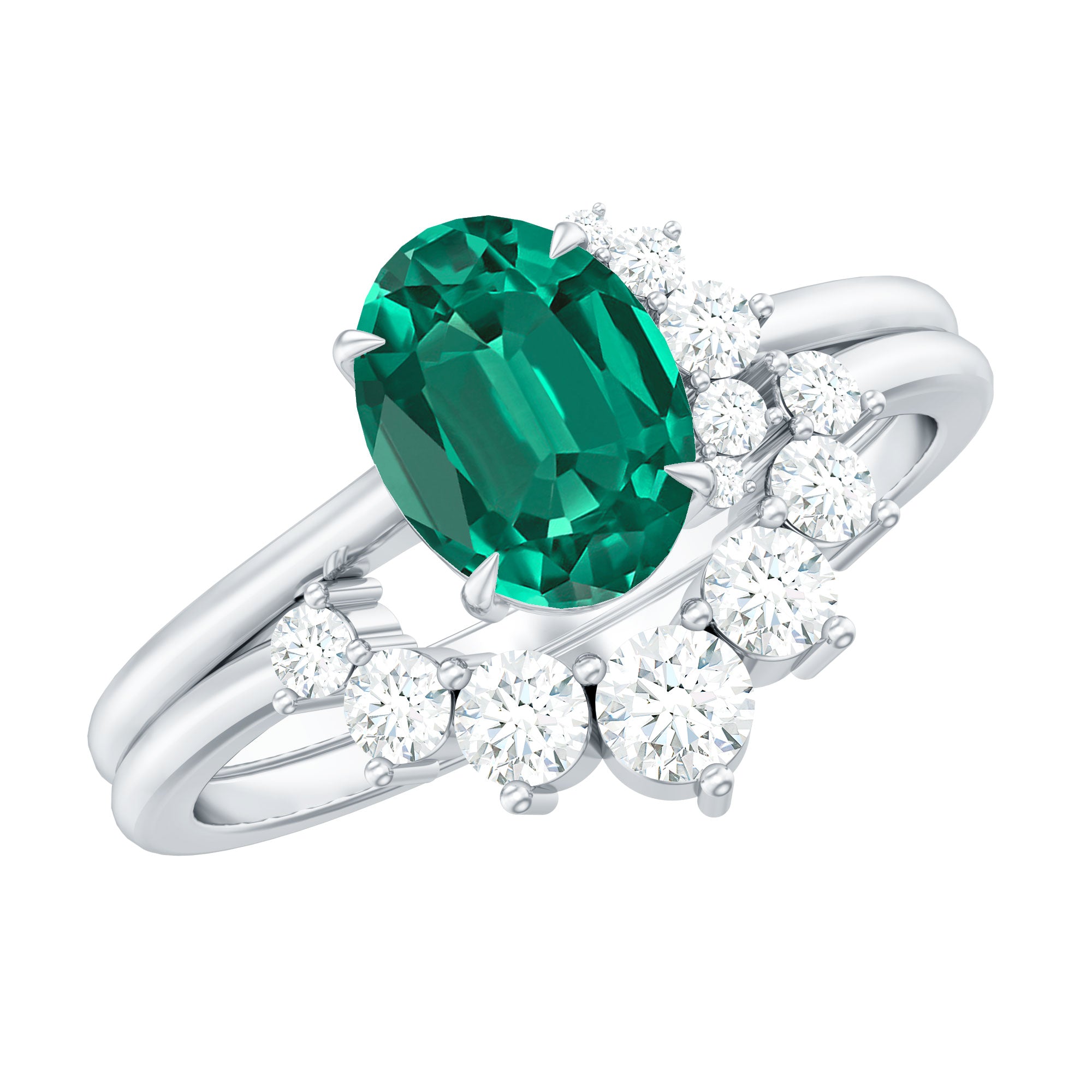 Let your love story sparkle with this scintillating Wedding Bridal Ring Set, a testament to love, devotion and lifelong promise. Thoughtfully crafted, this Ring Set of 2 includes an Engagement Ring and Wedding Band. The Solitaire Engagement Ring is adorned with a vibrant green 6X8 mm Oval Shape Lab Created Emerald set as a centerpiece in Claw Setting, well-known for its color and meaning. The AAAA Quality Lab Emerald stone is accentuated by shimmering, dainty Diamond stones, arranged on one side of the centerpiece, adding a pop of sparkle to the design. Perfectly pairing the engagement ring is a Curved Enhancer Band, adorned with HI-SI Diamond stones. Together, they create a mesmerizing Wedding Engagement Ring Set that amplifies the sparkle of each other. Timeless and effortlessly modern, this Oval Emerald Engagement Ring with Wedding Band created a look that is thoughtful and elegant. Presented in a stunning jewelry box and available in various ring sizes from 3 to 13, this Wedding Ring Set for Women celebrates the bond you share and the future you are building together.