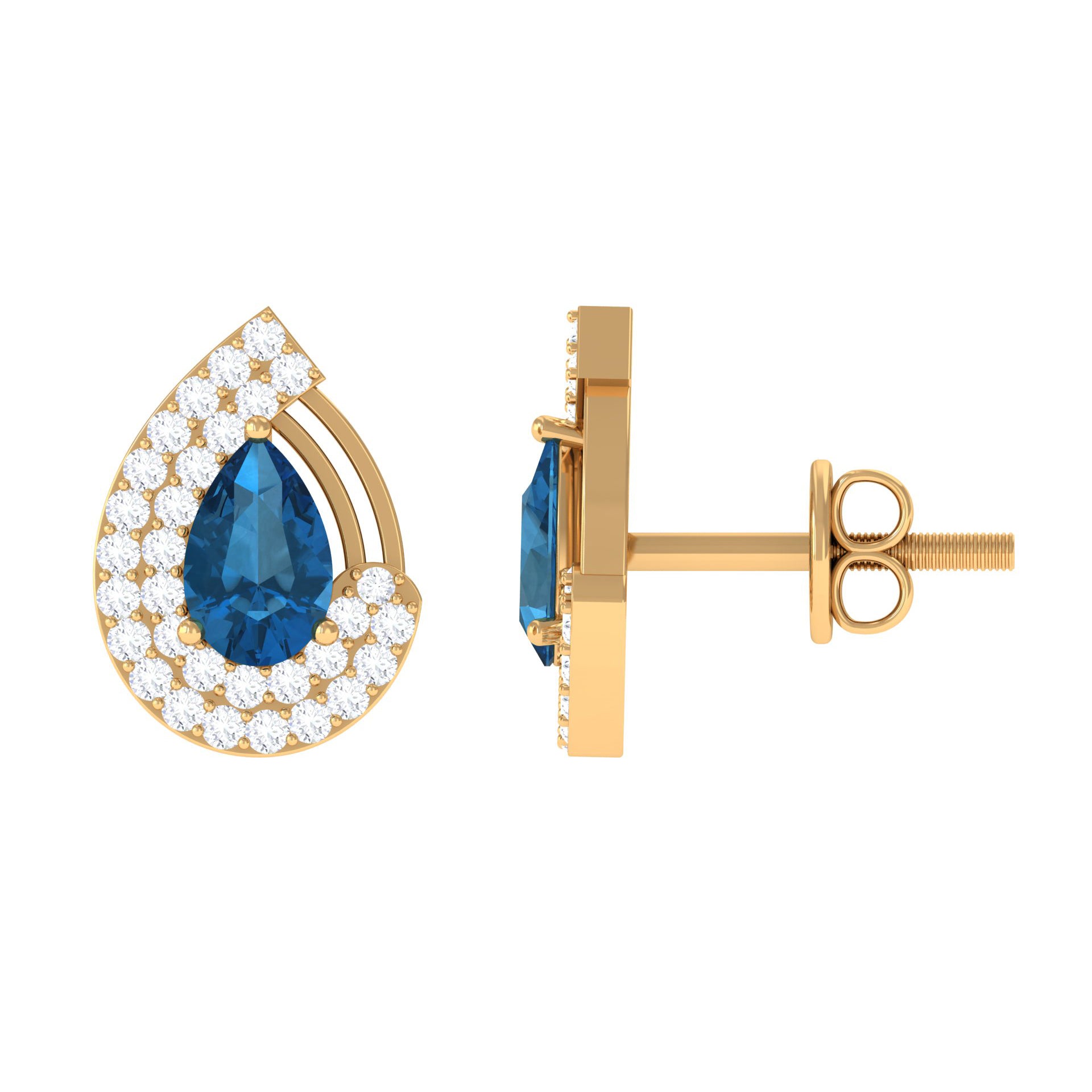 Radiating timeless elegance, these London Blue Topaz Stud Earrings bring a sophisticated touch to any outfit. These Teardrop Earrings feature 5X7 MM pear cut London Blue Topaz, set in secure prong setting. Flanking each topaz are delicately placed round cut diamonds that enhance the rich blue tones and add a sparkling contrast. The combination of the vivid topaz and shimmering diamonds creates a look that is both striking and refined, making these Pear Stud Earrings a versatile choice for everyday wear or special occasions. Crafted with attention to detail, the AAA quality London blue topaz and HI-SI quality diamonds ensure exceptional clarity, durability, and sparkle. The Topaz and Diamond Earrings are designed with secure screw-back closures, providing comfort and stability so they can be worn confidently throughout the day. These London Blue Topaz Earrings offer a balanced design that feels modern yet timeless, perfect for someone who appreciates jewelry that makes a statement without being overpowering. Their elegant shape and thoughtful arrangement of stones make them suitable for professional settings, casual outings, or evening events, blending seamlessly with any style.