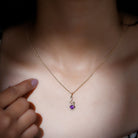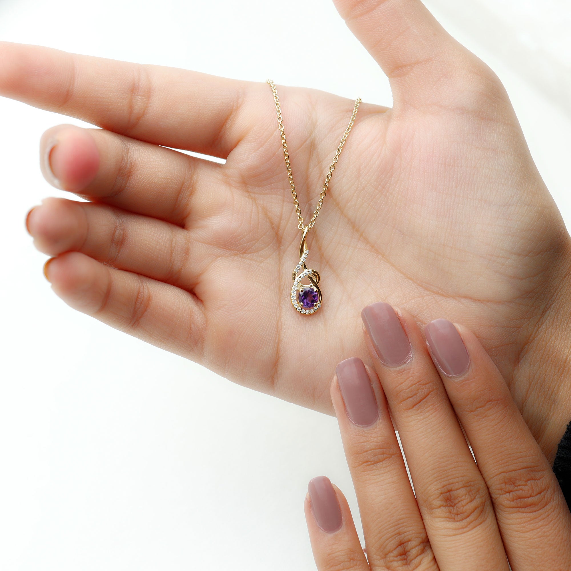 Adorn yourself with this stunning twisted drop pendant crafted in solid gold, featuring a beautiful round Amethyst and dazzling Diamond stones. The intricate gold design adds a touch of elegance to any outfit and makes for a perfect gift to that special someone.