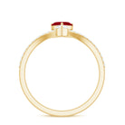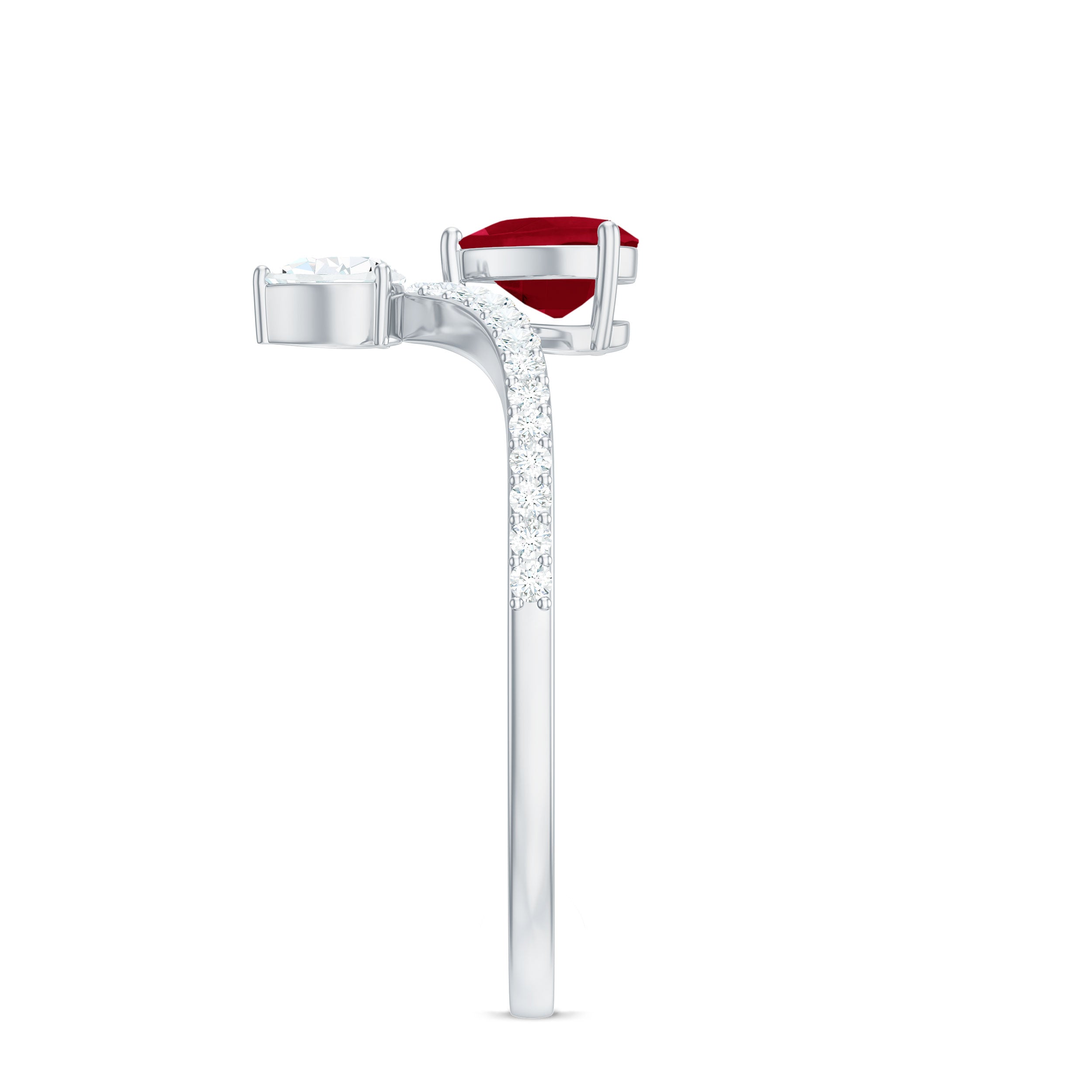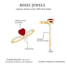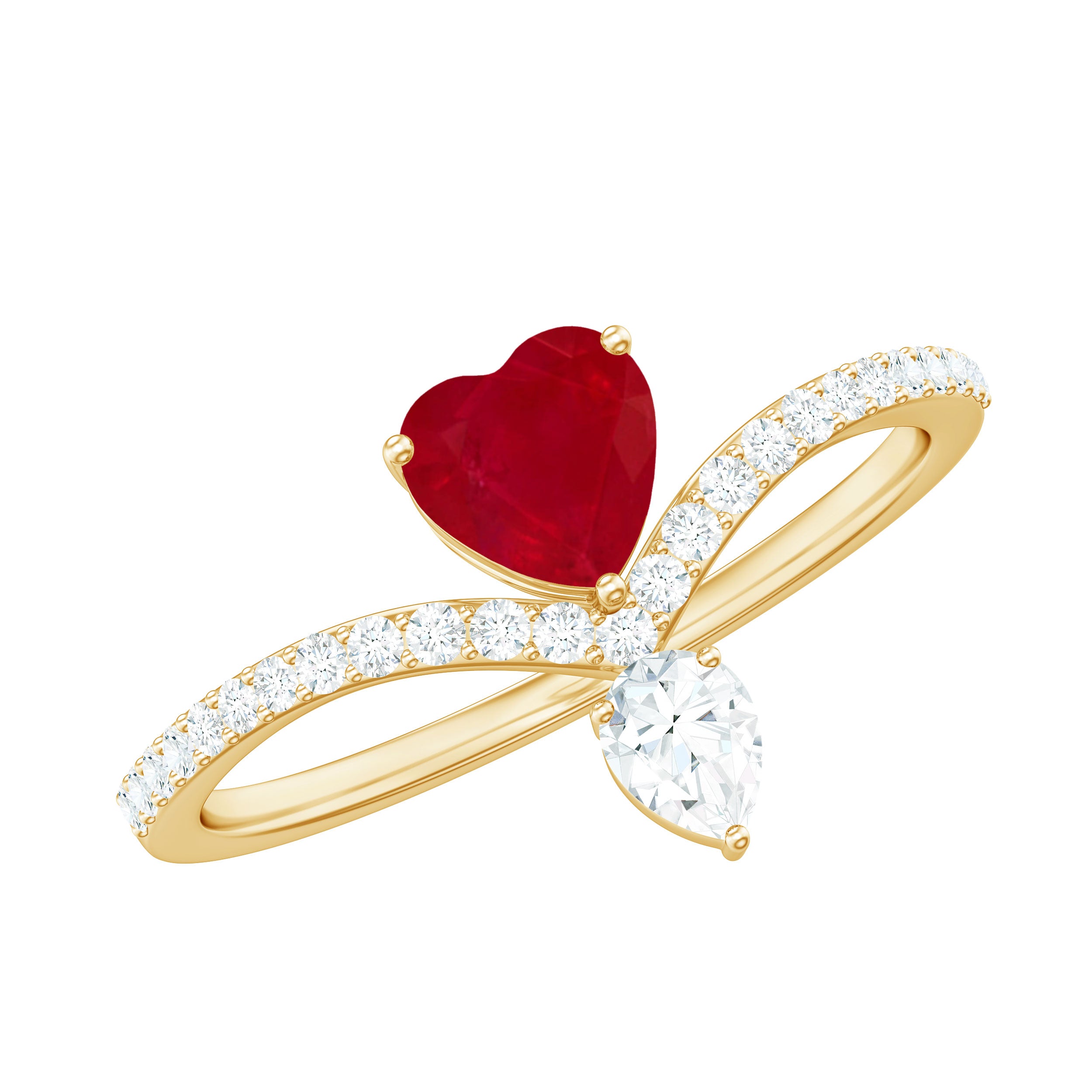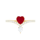 Make your better half smile by giving her this stunning Designer Heart Engagement Ring. This Heart Engagement Ring is adorned with a Heart Shape Ruby set in a prong setting with a round and pear cut Diamond set in a prong setting. Featuring gold metal construction, this Heart Ruby Engagement Ring is exquisite.