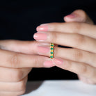 Add a splash of color and elegance to your special day with this beautiful Alternative Eternity Band. Designed to reflect harmony and style, this Wedding Band Ring captures attention with its unique mix of gemstones and shapes. It features a stunning combination of marquise cut emeralds and princess cut yellow sapphires, each held securely in prong setting. The graceful green of the emeralds blends perfectly with the bright golden tones of the yellow sapphires, creating an eye-catching pattern that flows all around the band. The alternating design gives this Stackable Eternity Ring a modern look while keeping its timeless charm. Every detail is thoughtfully crafted to bring out the beauty of each gemstone, making this piece a perfect choice for those who appreciate color, creativity, and meaning in their jewelry. The continuous line of stones symbolizes everlasting love and connection, making it an ideal piece to mark a special occasion or milestone. Whether you wear it alone for a refined statement or pair it with other rings for a layered look, this Yellow Sapphire and Emerald Eternity Band adds sophistication to any outfit.