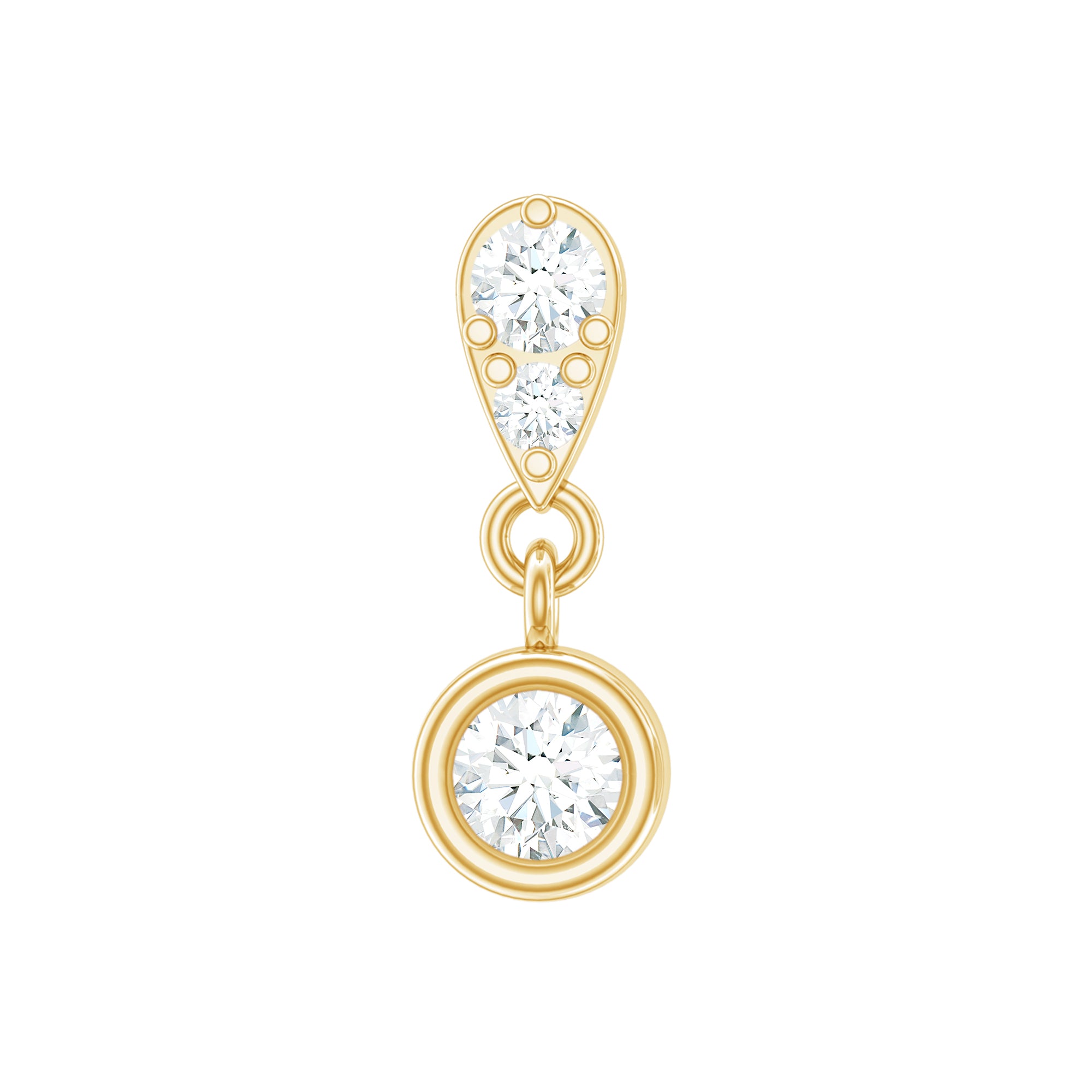 Here is something special for you! This Cartilage Drop Earring showcases Round Diamonds on top studded on a unique design while a dainty Round Diamond hangs as a drop, creating a dangly effect.This exquisite piece redefines the art of cartilage styling, marrying classic style with modern flair. Fitting in lobe, forward helix & helix piercings, this Diamond Earring means you can customize your stack and achieve an asymmetrical look.Elevate your curated ear with a touch of sparkle and a dash of uniqueness because your style deserves to shine. Happy curating!