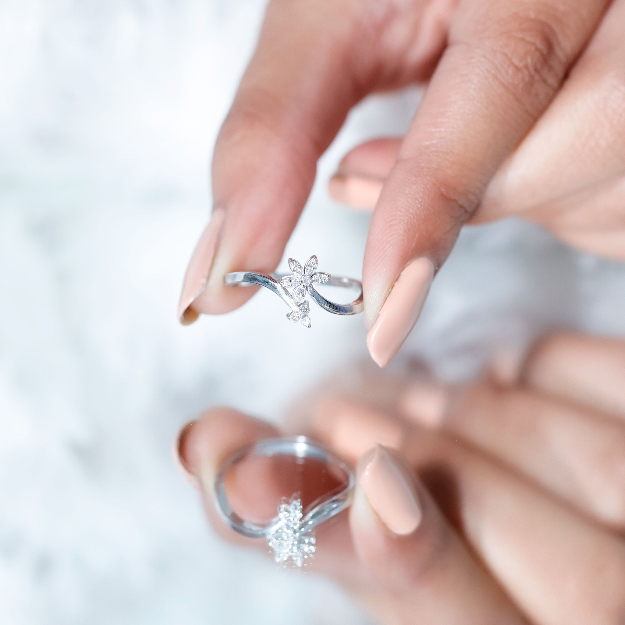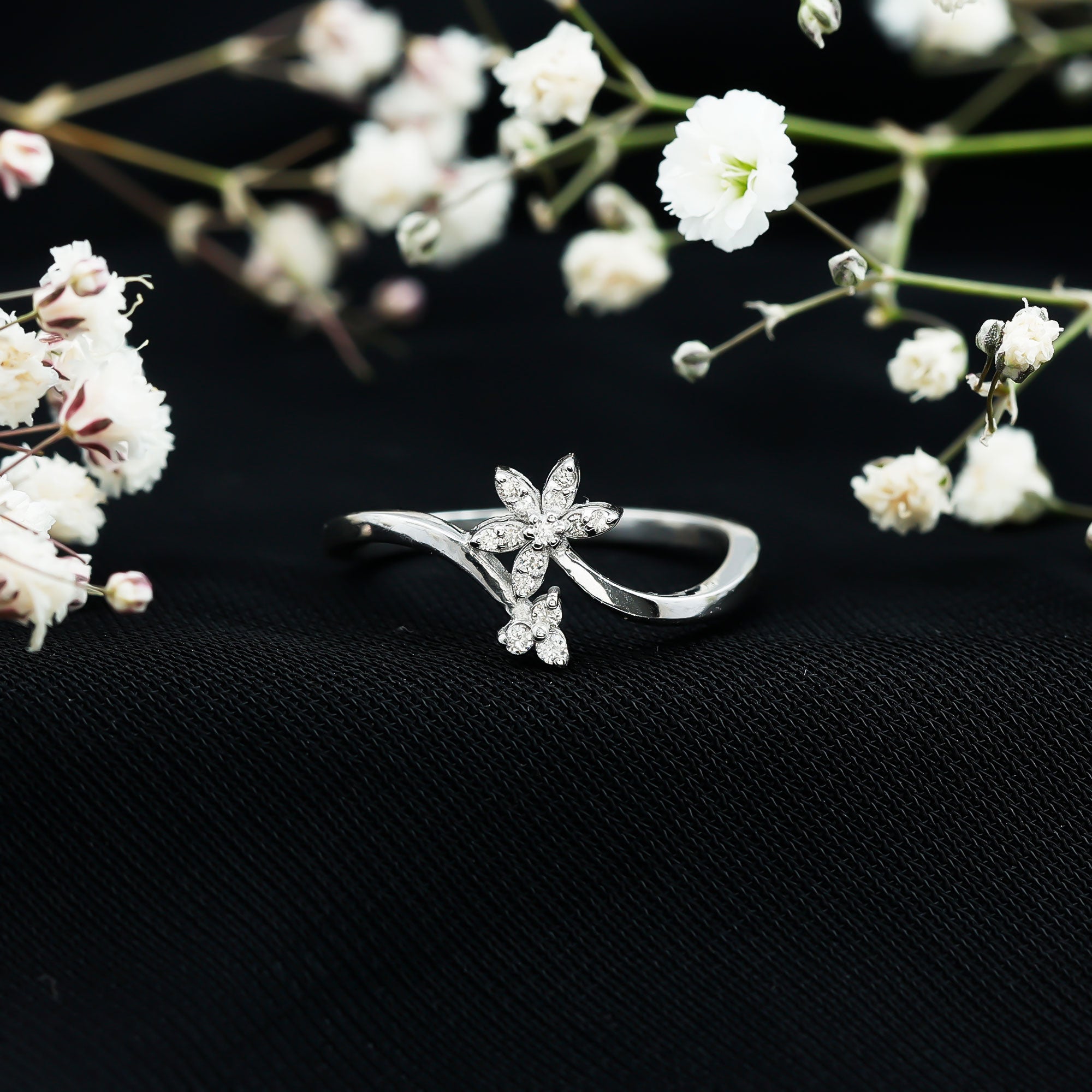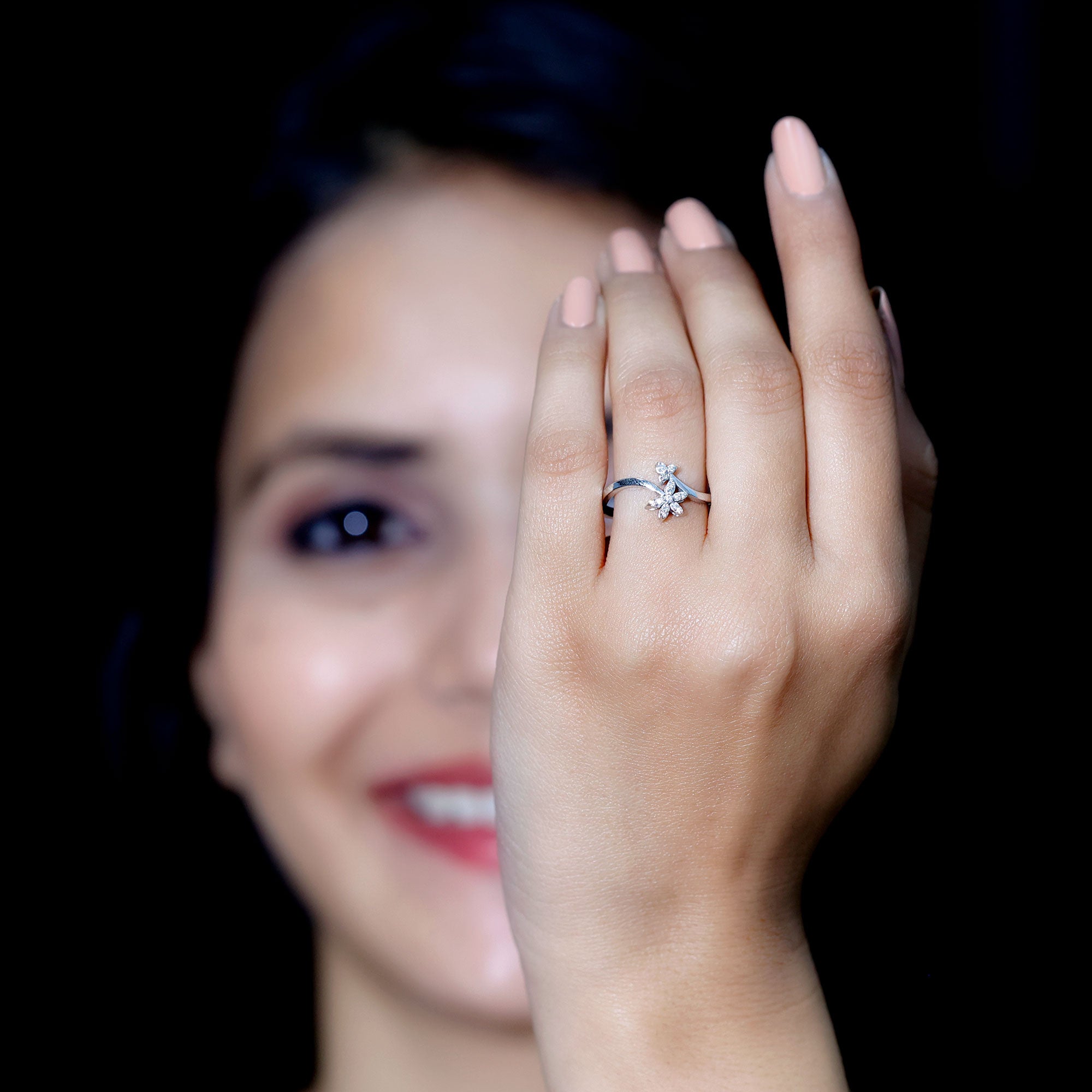 A promise wrapped in petals - this Diamond Flower Ring is a delicate symbol of love that blossoms endlessly. The Diamond Promise Ring for Her features a pretty flower design in the center, decorated with dainty round cut diamonds that sparkle gently when the light hits them. Below the flower, there is a trio of round cut diamonds that look like a tiny bud. The stones are carefully set in prong setting to stay secure while giving the Diamond Proposal Ring a graceful look. What makes this Floral Promise Ring extra special is its curved band. Instead of a straight line, the band has a smooth wave-like shape that wraps beautifully around your finger. It is simple yet stylish, and very comfortable to wear every day. This Curved Diamond Ring for Women is a perfect choice if you want to gift something meaningful - whether it is for a promise, a special memory, or just to show how much someone means to you.