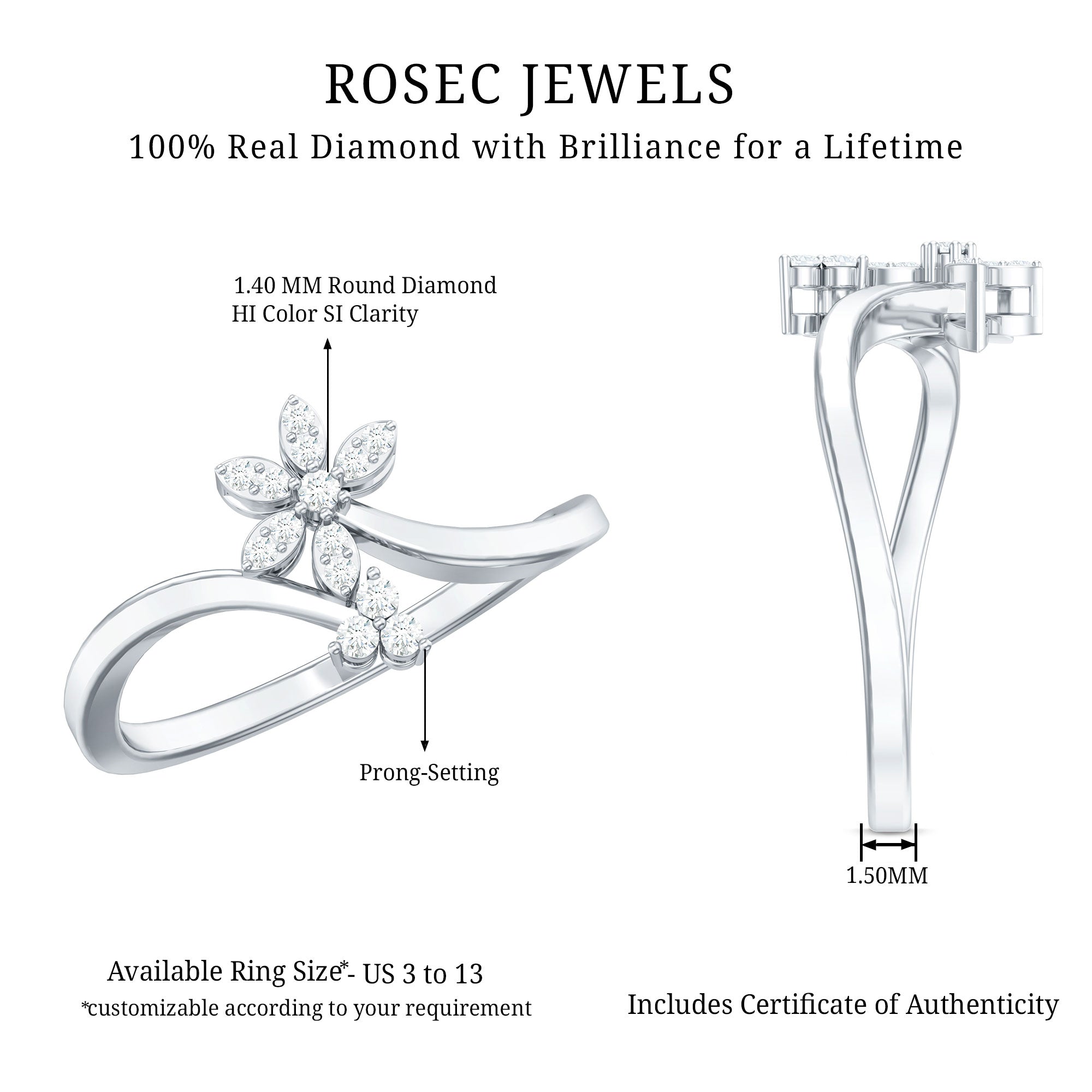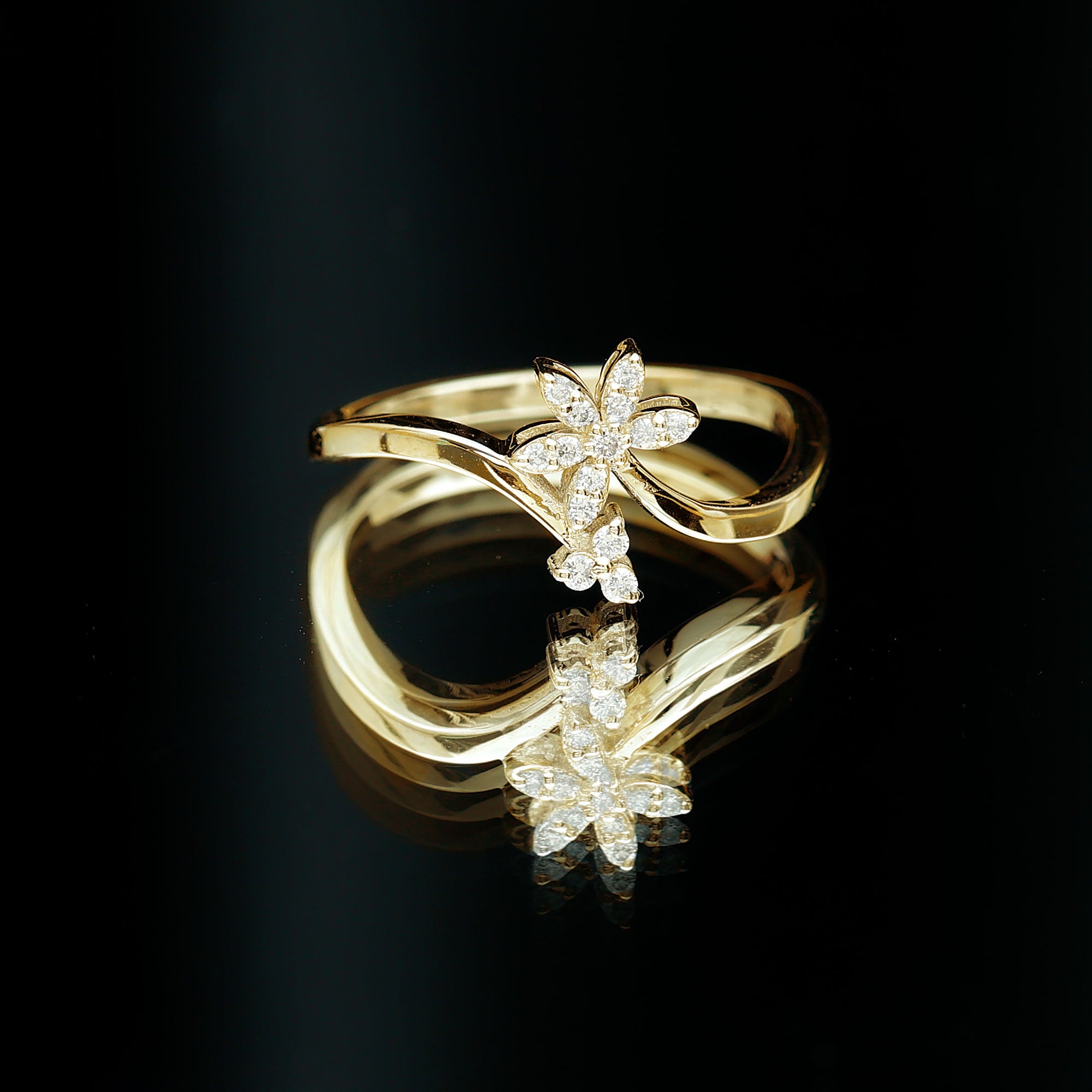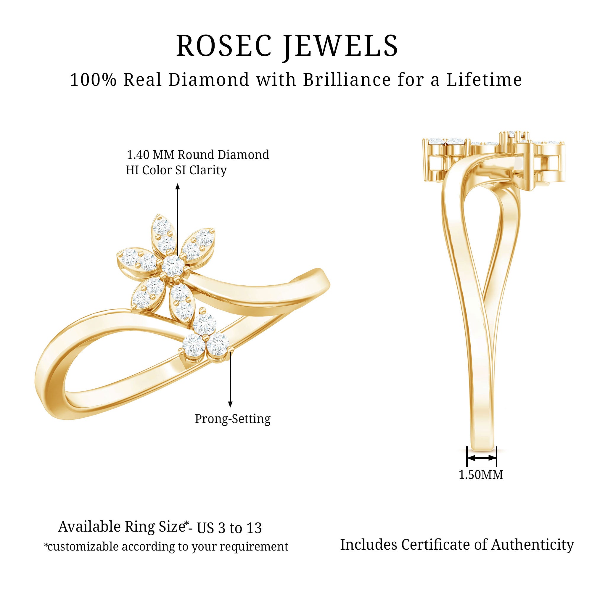 A promise wrapped in petals - this Diamond Flower Ring is a delicate symbol of love that blossoms endlessly. The Diamond Promise Ring for Her features a pretty flower design in the center, decorated with dainty round cut diamonds that sparkle gently when the light hits them. Below the flower, there is a trio of round cut diamonds that look like a tiny bud. The stones are carefully set in prong setting to stay secure while giving the Diamond Proposal Ring a graceful look. What makes this Floral Promise Ring extra special is its curved band. Instead of a straight line, the band has a smooth wave-like shape that wraps beautifully around your finger. It is simple yet stylish, and very comfortable to wear every day. This Curved Diamond Ring for Women is a perfect choice if you want to gift something meaningful - whether it is for a promise, a special memory, or just to show how much someone means to you.