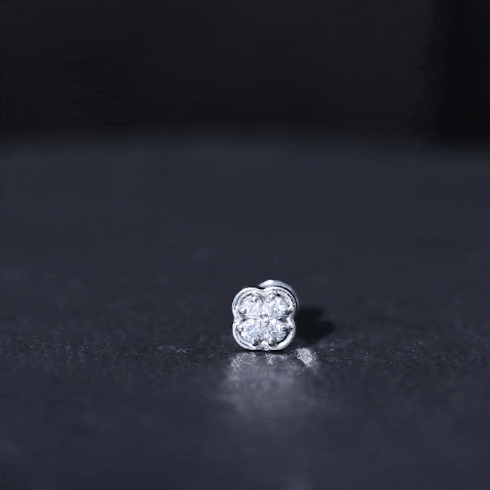 Let your cartilage piercing step out of the shadows and blossom into a star! Enhance your look with our Diamond Floral Earring, which radiates the perfect sparkle. This earring features a cluster of four Round Diamonds set in prongs and surrounded by a floral design frame made of solid metal, ensuring durability. You can elevate your earring stack by adding this Flower Stud Earring to your helix, cartilage, conch, tragus, or upper lobe piercing. With so many possibilities, this Flower Cartilage Stud is sure to be the highlight of your body jewelry collection. Treat your special someone to this Diamond Cartilage Earring for any occasion, be it a birthday, graduation, anniversary, or just because. Whether worn alone as a standout piece or combined with other earrings for a curated ear look, it effortlessly adapts to both minimalistic and bold styles. A true tribute to natures beauty, enhanced by the everlasting sparkle of diamonds.