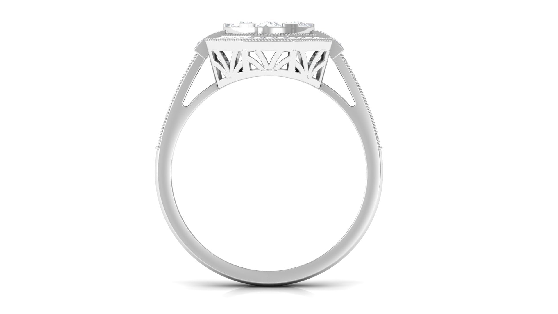 Symbolize the beauty and growth of love with this diamond flower engagement ring. This exquisite ring features a 3 MM diamond in the center supported by a prong setting along with princess-cut diamond side stones. The center stone is flanked by small sparkling diamonds encrusted in a flower style, making this piece more unique and appealing. This is perfect for those who admire beauty with elegance in their style.