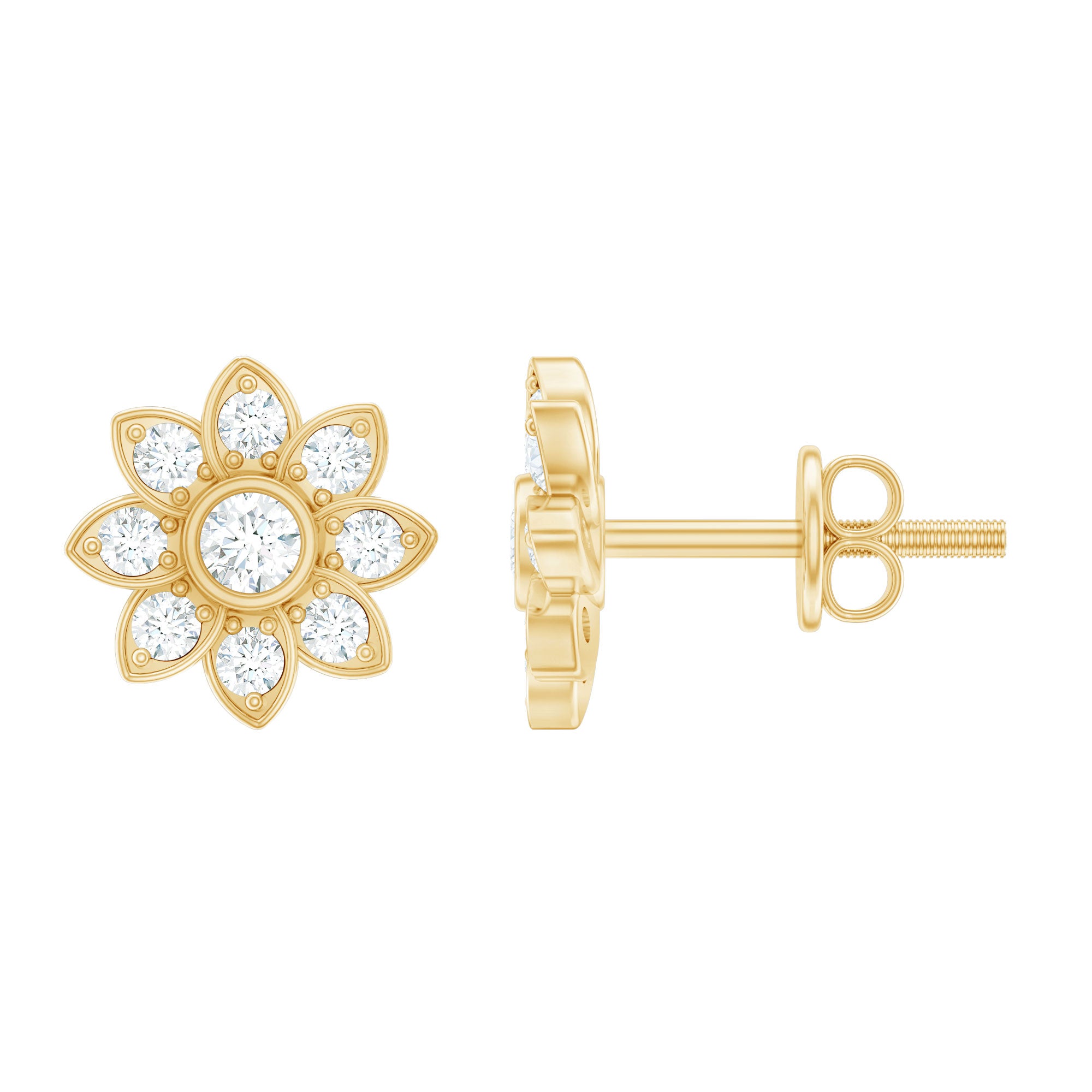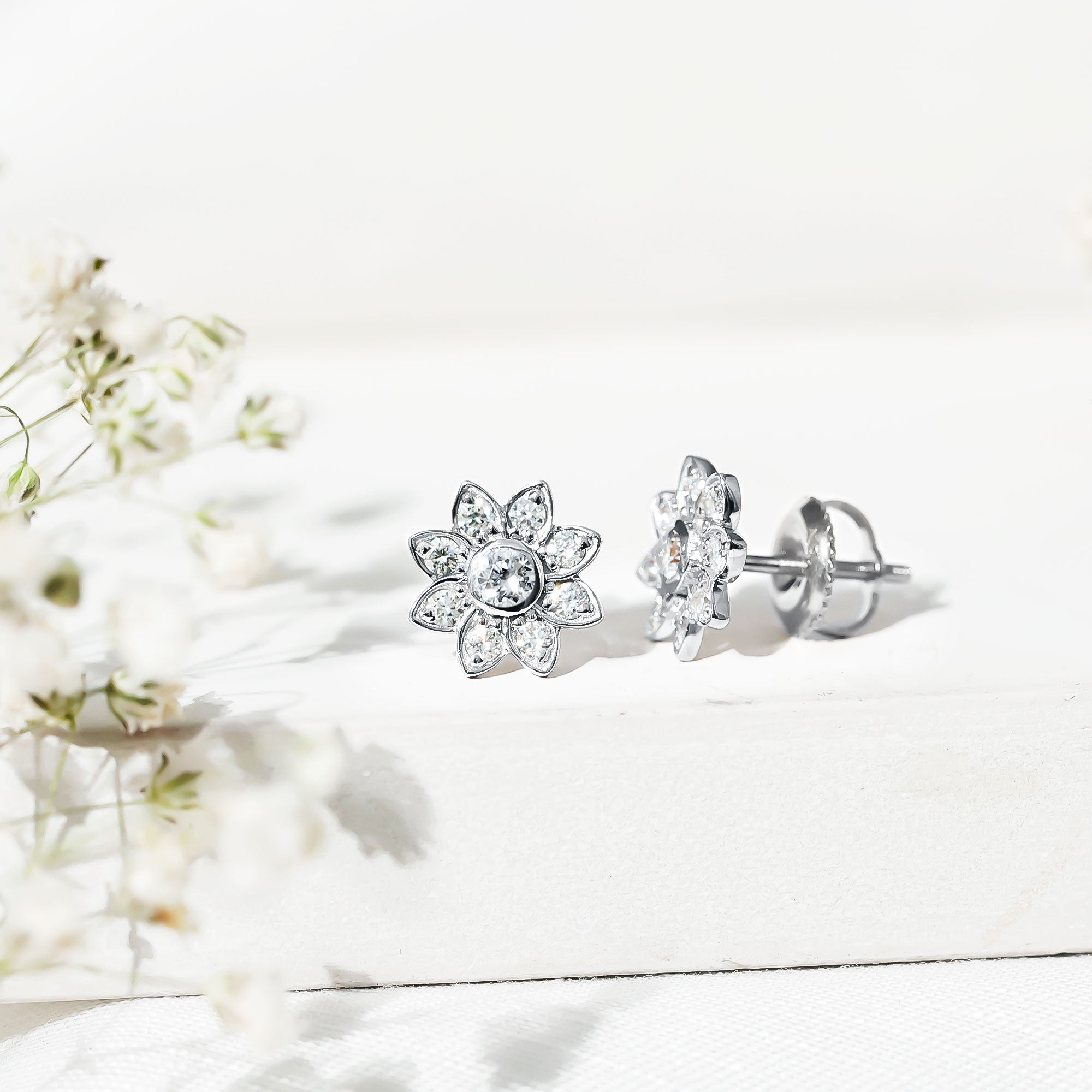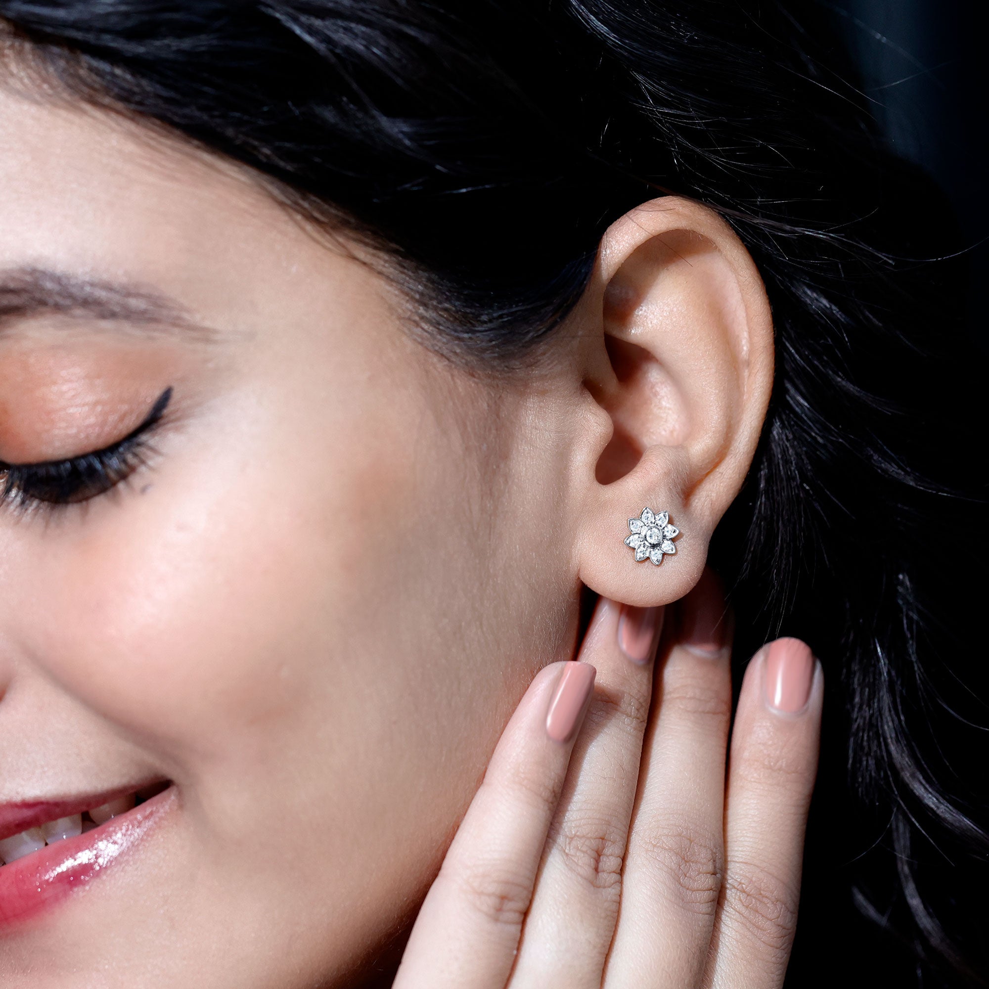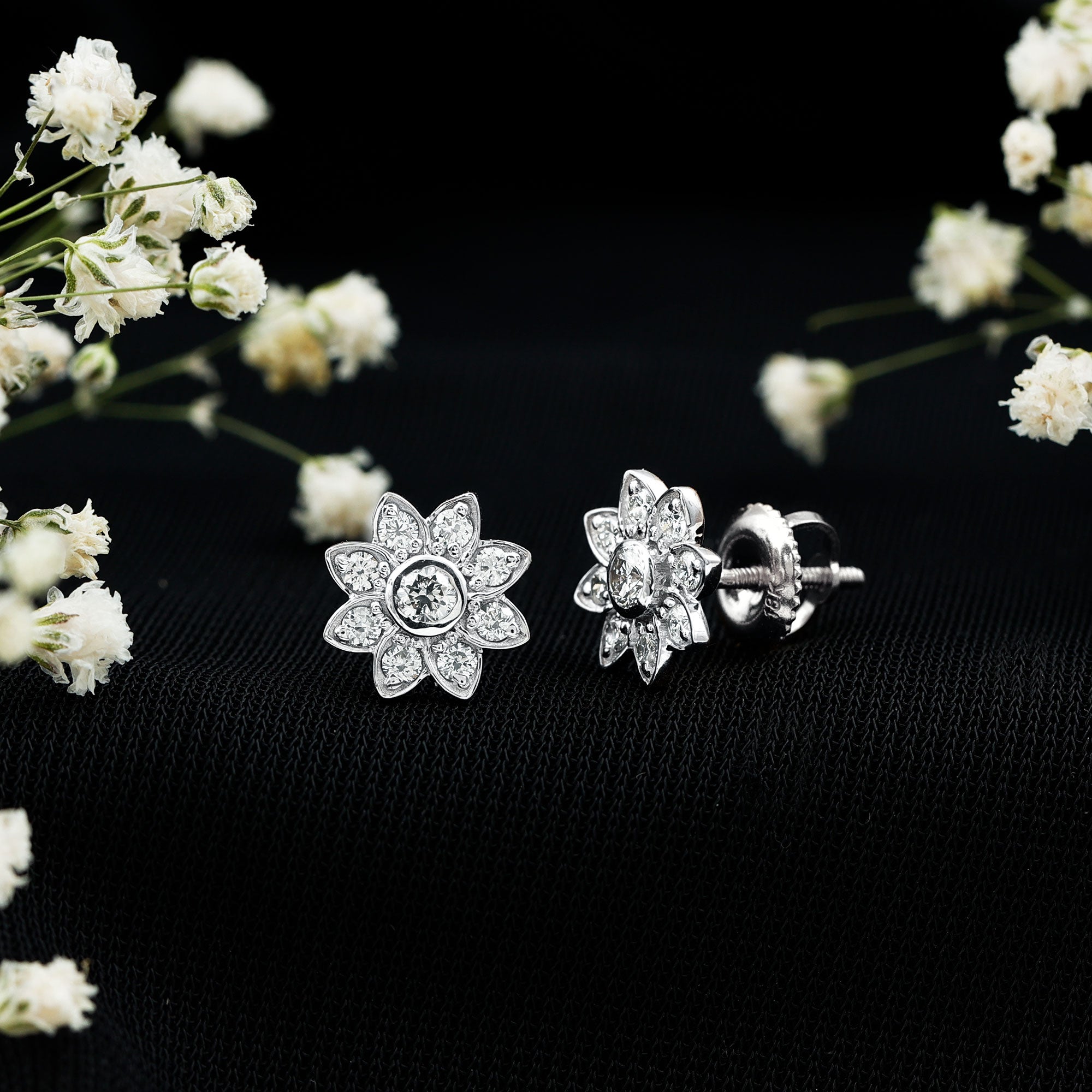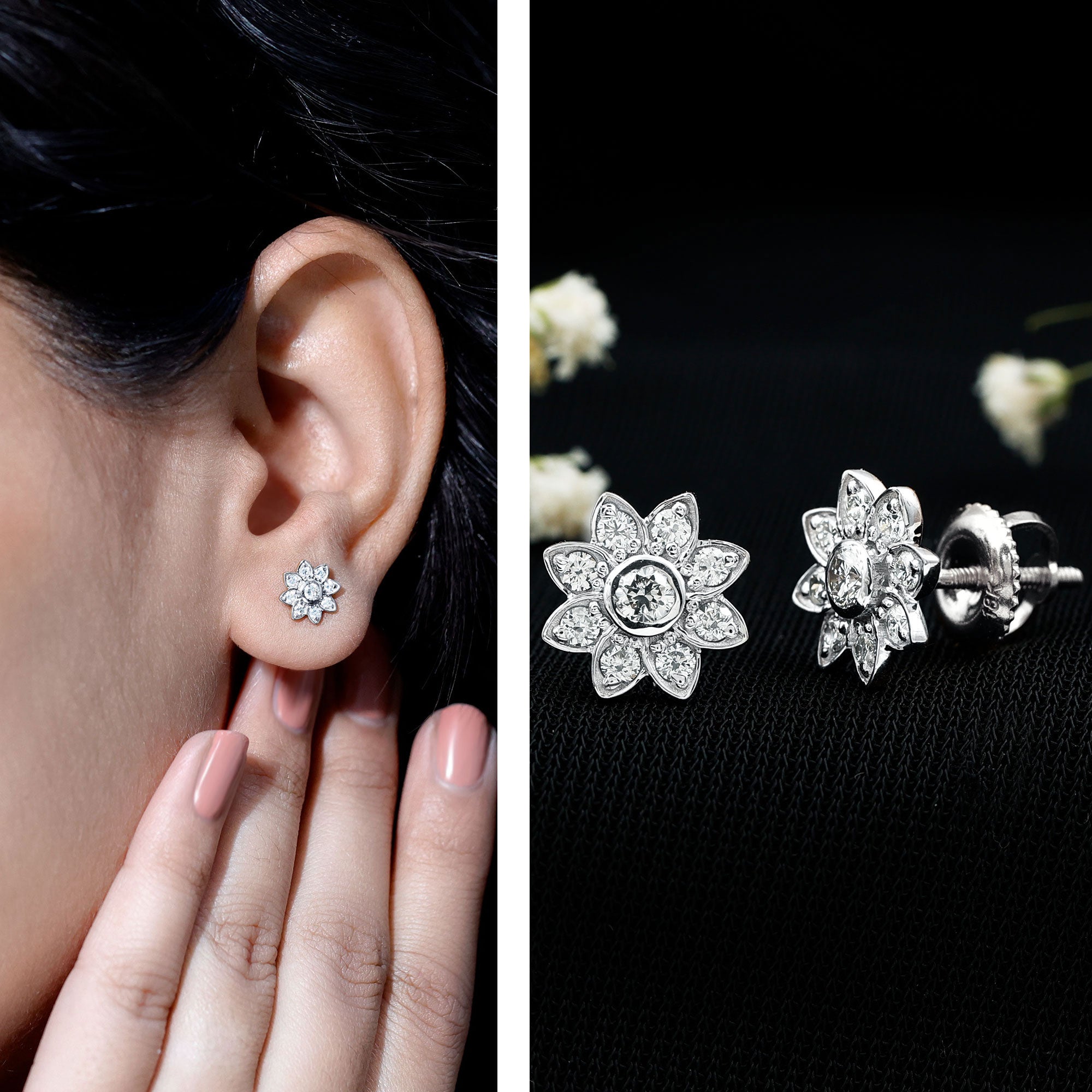 Sparkle the grace of your style with these Diamond Flower Earrings. These Stud Earrings feature Round Shaped Diamond in the center in Bezel Setting along with the Petals that are adorned with Diamond. Known for natural radiance and timeless elegance, these Flower Stud Earrings make a stunning addition to the jewelry collection. Having the perfect combination of luxury and subtle beauty, these Floral Earrings have a luminous sheen and delicate hues, having unique iridescence reflecting light beautifully. The feminine twist with the flower design enhances the style that would let you feel fresh. The timeless flower motif exudes a refined charm that complements any style. So, embrace the beauty with style and design, bloom with shining petals paved with glistening round diamonds. In a nod to Mother Earth, these charming Floral Stud Earrings add a pop of sunshine to your signature look that effortlessly enchants, pairing to bring natures most timeless beauty to your radiant style, every day.
