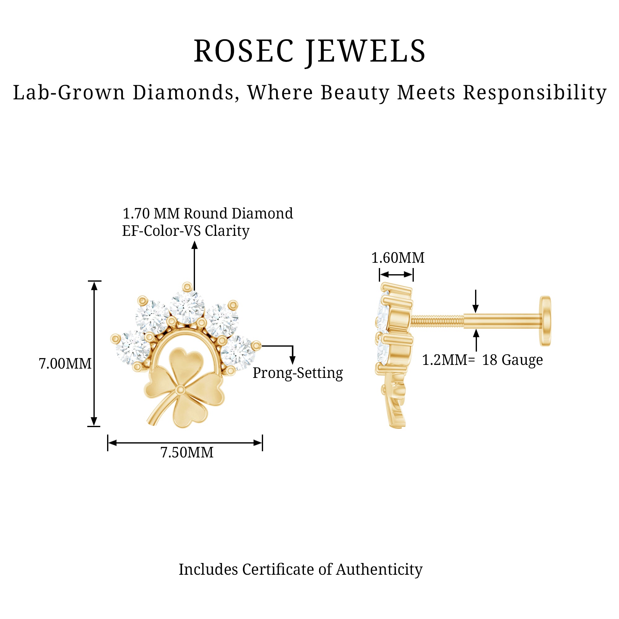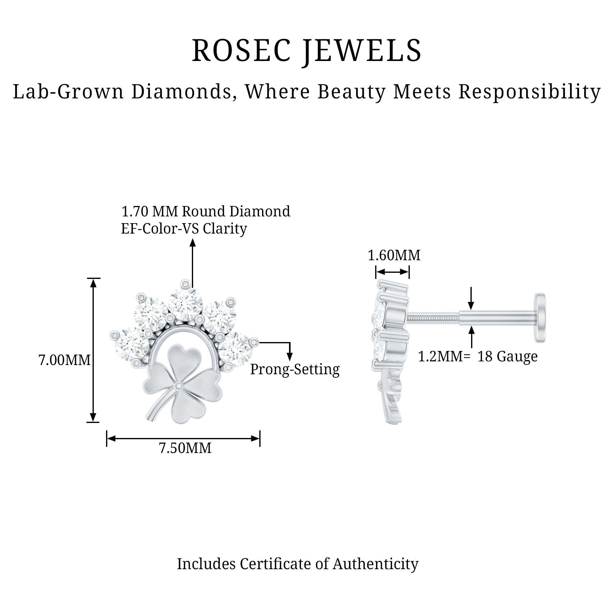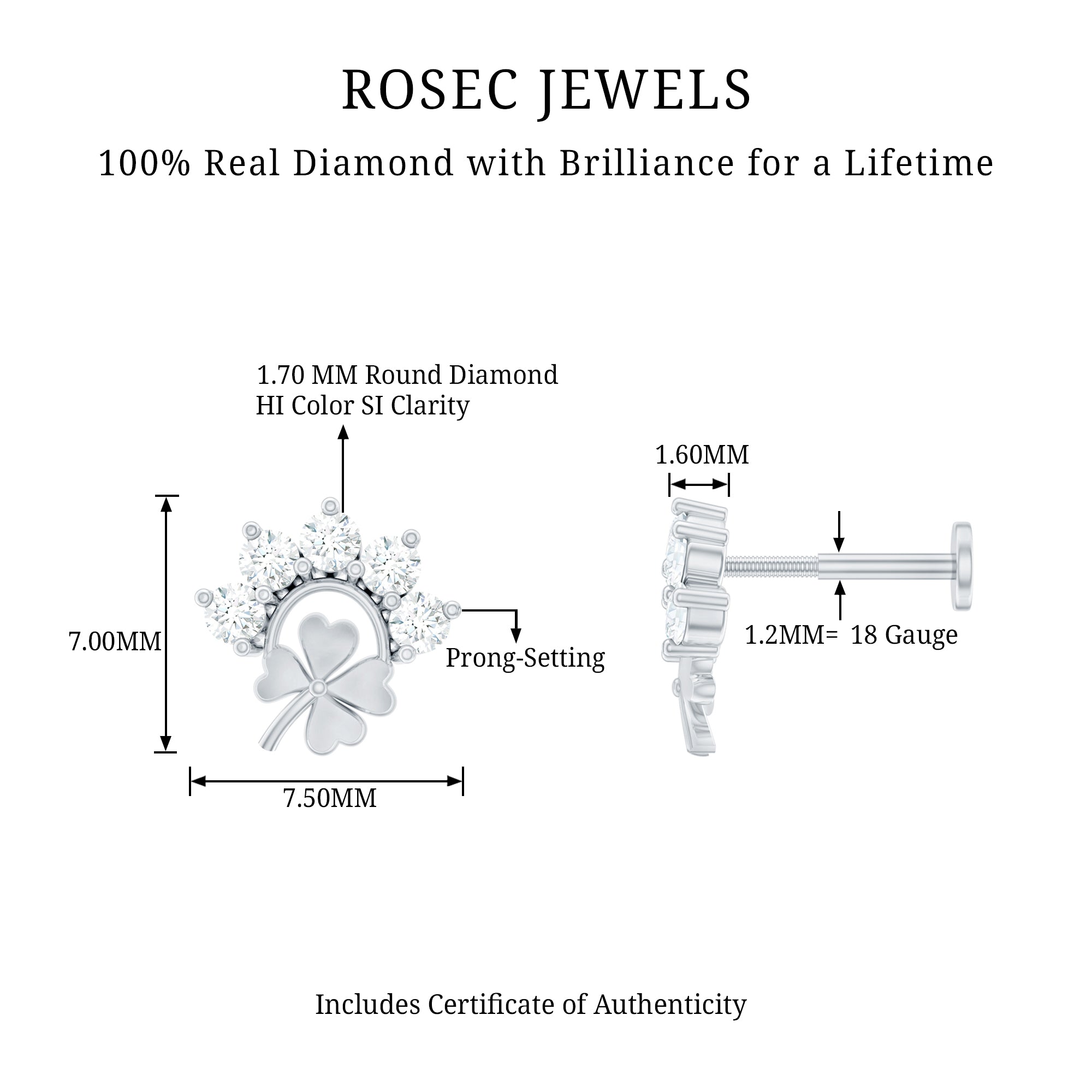 Boost your style with a dash of luck! Adorn yourself with these enchanting Diamond four-leaf clover earring. Embellished with Round Shape Diamonds set in Prong Setting on a curved design, the clover leaf design adds a whimsical touch of look. Want to turn heads? Wear this Diamond Earring as a standalone piece or stack it with other studs of ear jewelry and create mesmerizing looks. Piercing Jewelry is currently the hottest trend, so did not hesitate—seize this Clover Earring for your loved one. Its a breathtaking beauty guaranteed to make her feel truly special and loved!