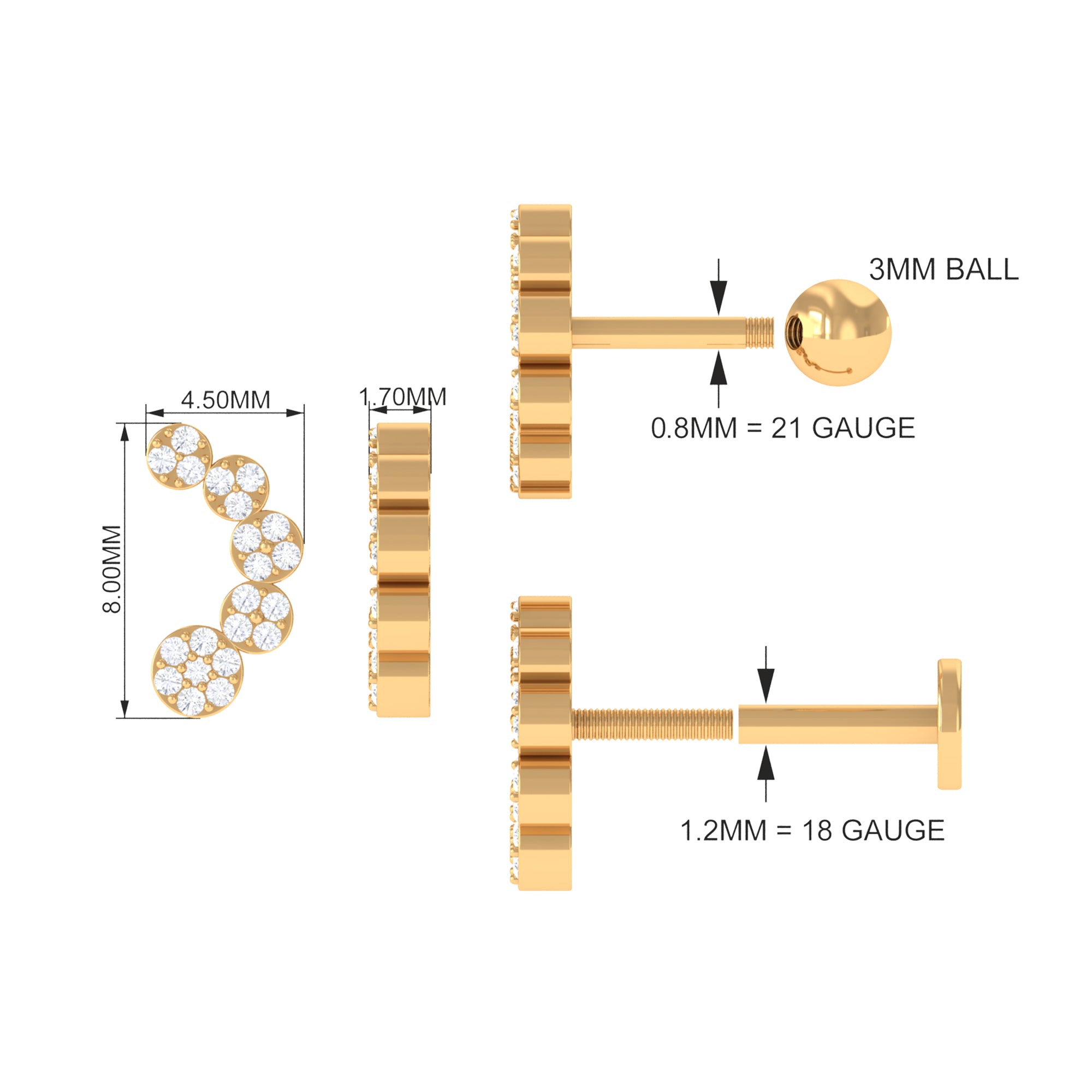The Diamond Gold Curved Crawler Earring features Round Cut Diamonds on a curved gold frame, composed of Hallmarked Gold Metal. You can wear it on your Helix, Cartilage, or Upper Lobe Piercing. The unique design of this earring, makes it perfect for both casual and formal occasions.