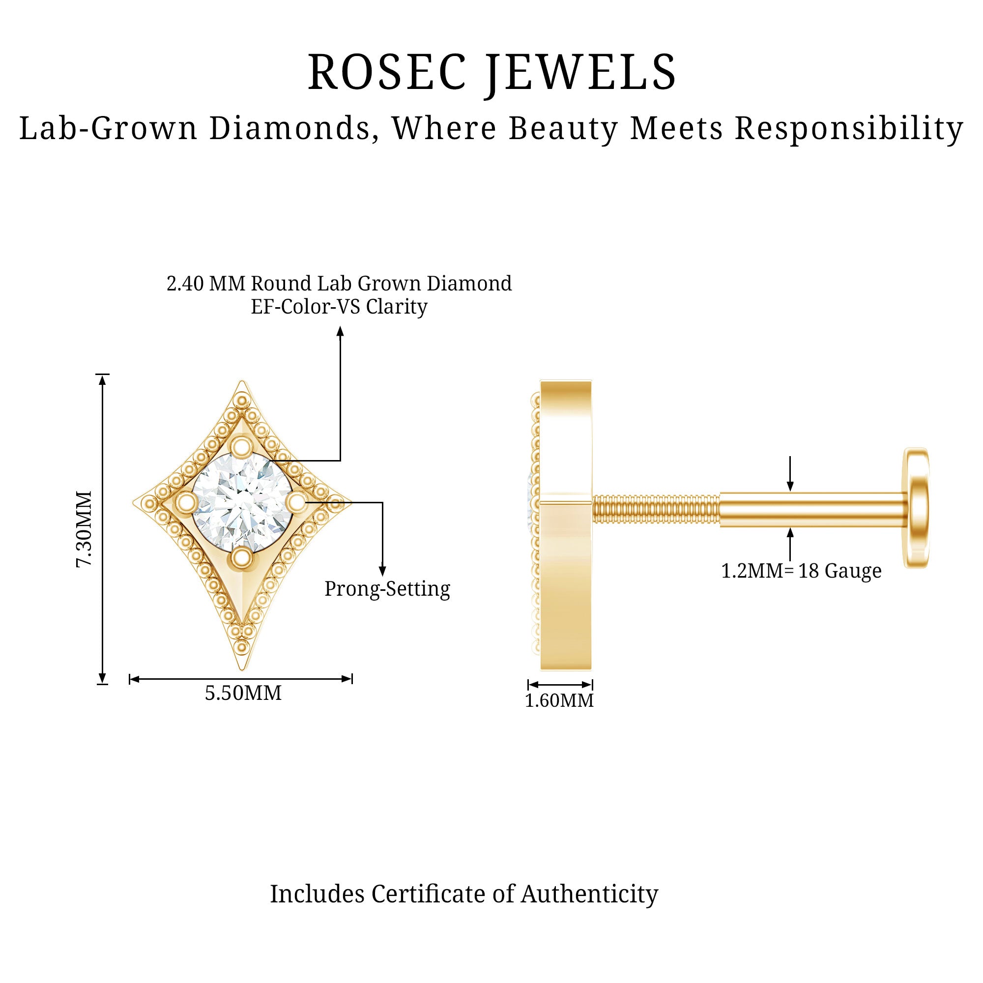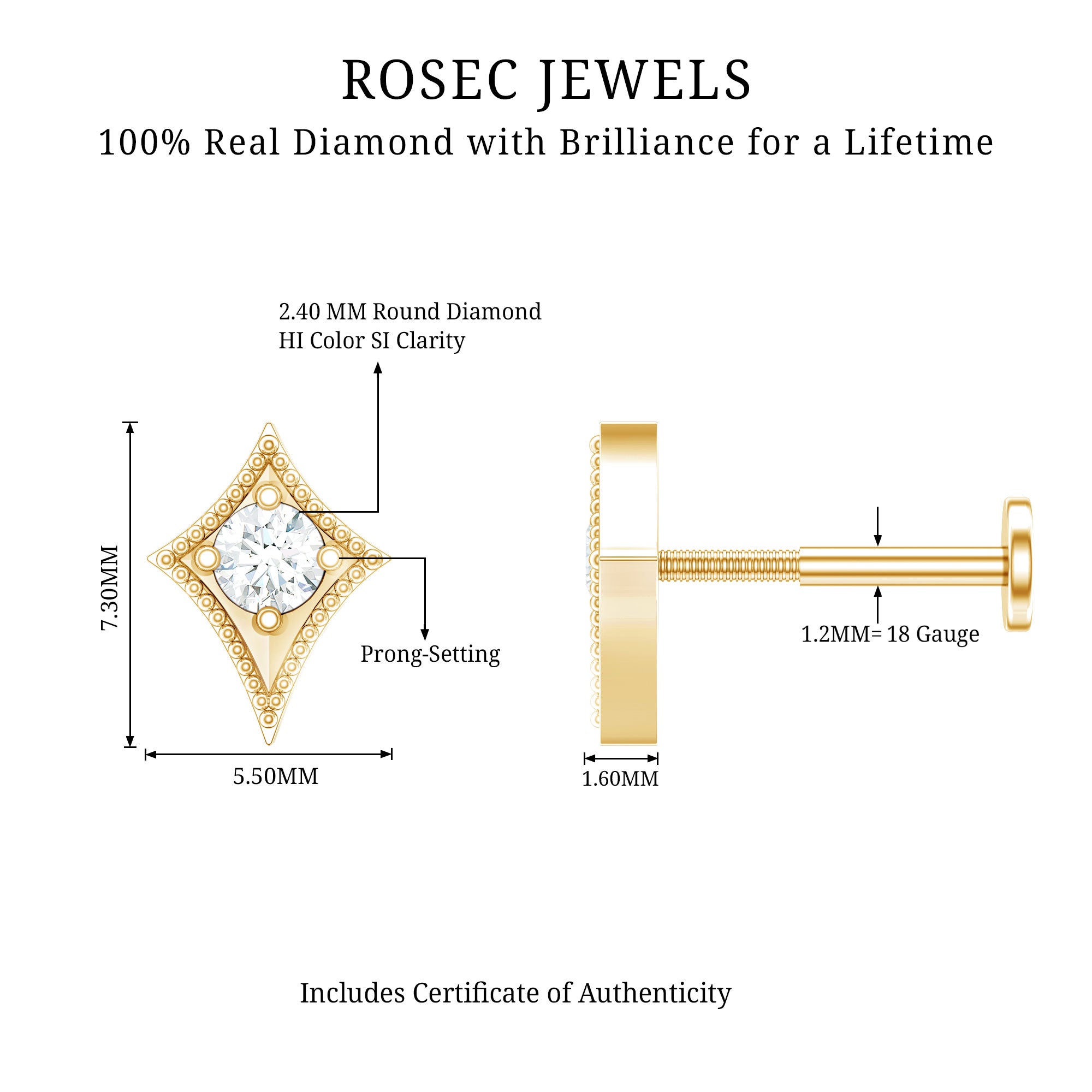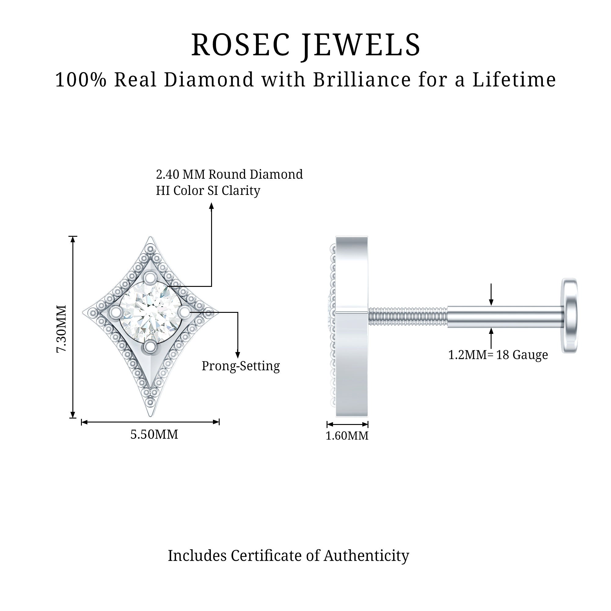 Get this mesmerizing Diamond Tragus Earring, a perfect addition to your ear stack. Adorned sparkling Diamonds, this Tragus Piercing radiates a dazzling, eye-catching brilliance. Its distinctive kite-shaped design adds a touch of individuality to your piercing collection, setting you apart from the ordinary.This earring can be worn in various ways including Tragus, Conch, Cartilage, Helix, and Upper lobe offering you the freedom to express your style effortlessly.A perfect unforgettable gift token of affection to surprise your loved ones.