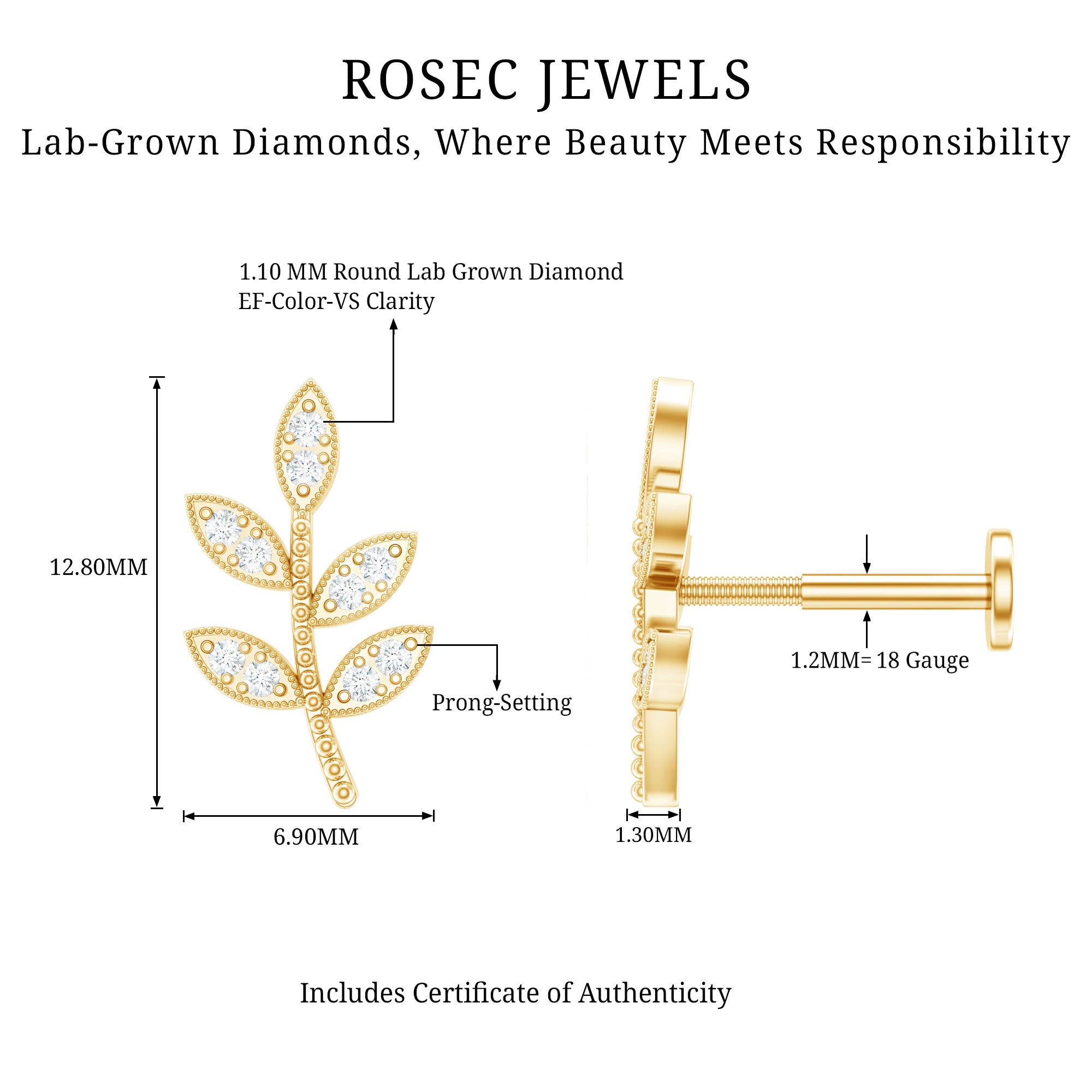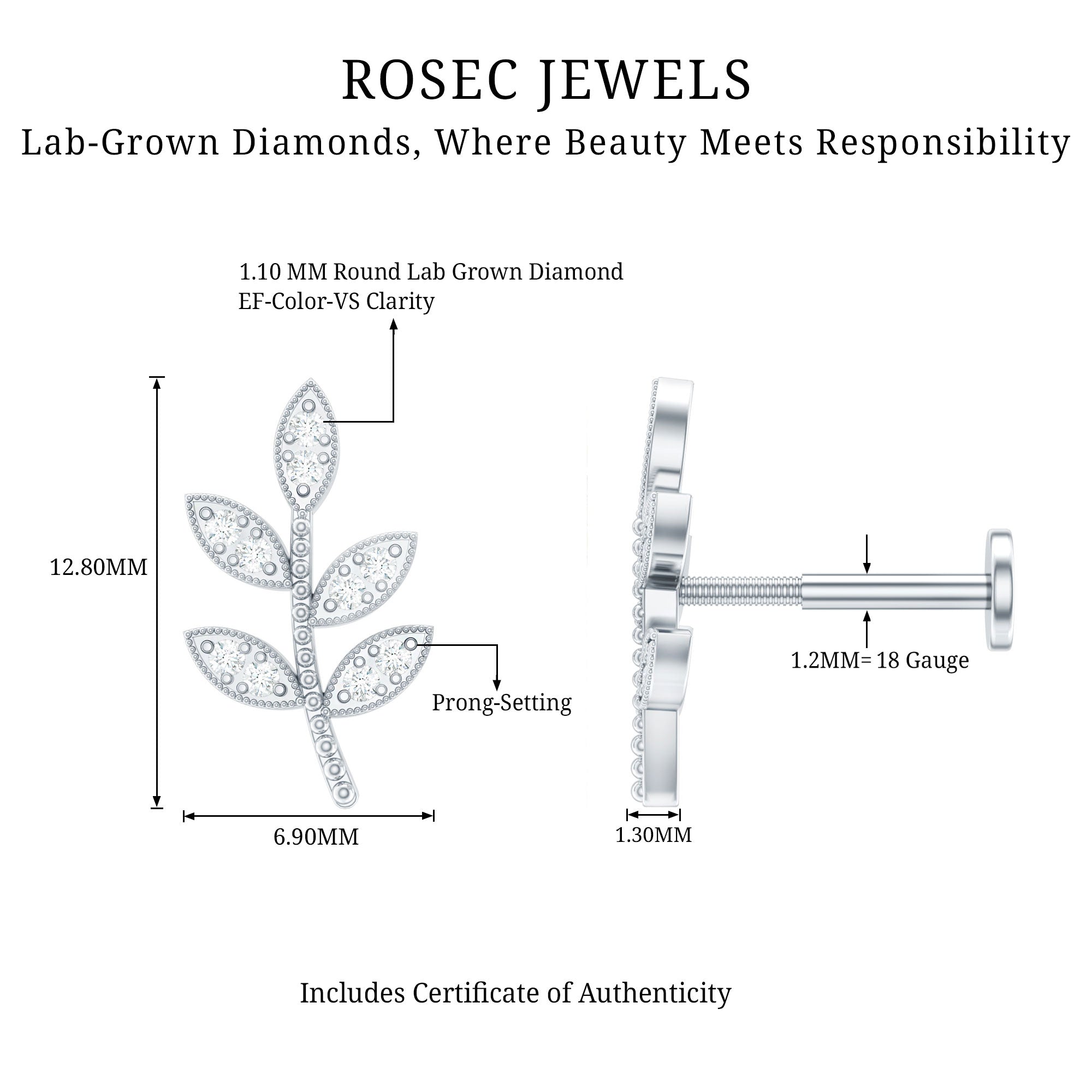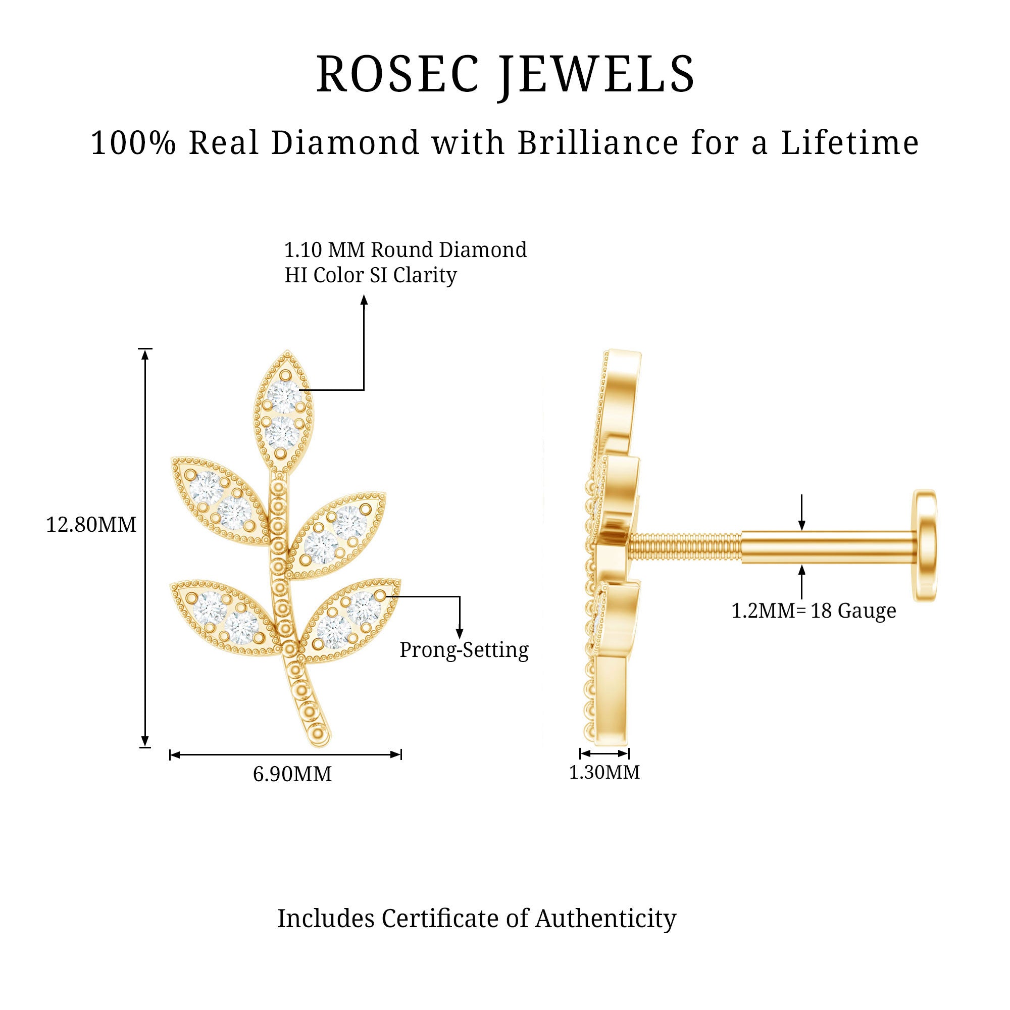 Inspired by nature – introducing the Diamond Leaf Earring! Showcasing sparkling Round Diamonds studded on the leaf design. This bling is all about that snug fit in your Cartilage, Helix, or Upper Lobe Piercing, the simple flat back closure will keep it locked in place.Whether you are brunching with the crew or spicing up date night, our Leaf Earring is your ride-or-die accessory. Get ready to slay, and let the leaves do the talking!Make your special ones day extra-lit with this stunning Piercing Earring. Its the ultimate gift for birthdays or anniversaries.