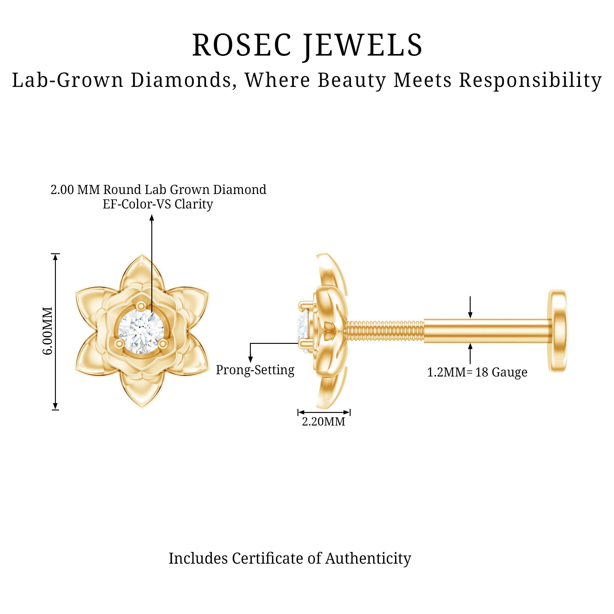 This Diamond Lotus Flower Earring makes every piercing sparkle. Featuring a Round Shape Diamond (Authentically Certified) secured by 3 Prong Setting in the center of a floral design. You can slide this Diamond Floral Earring into your Helix, Cartilage, Conch, or High Lobe Piercing. This earring is crafted with Hallmarked Metal for a shiny look. Here is a tip - You can effortlessly ace any look by stacking this Floral Earring with your other piercing earrings. Want to treat yourself then Grab this Diamond Piercing Earring and shine bright (you know to want to).