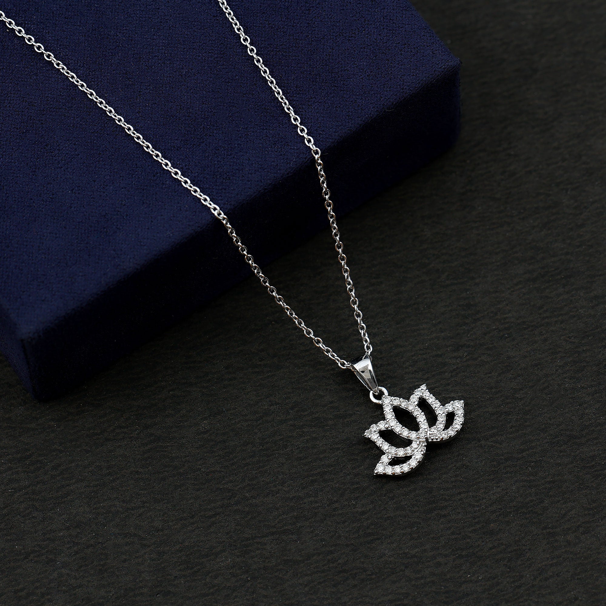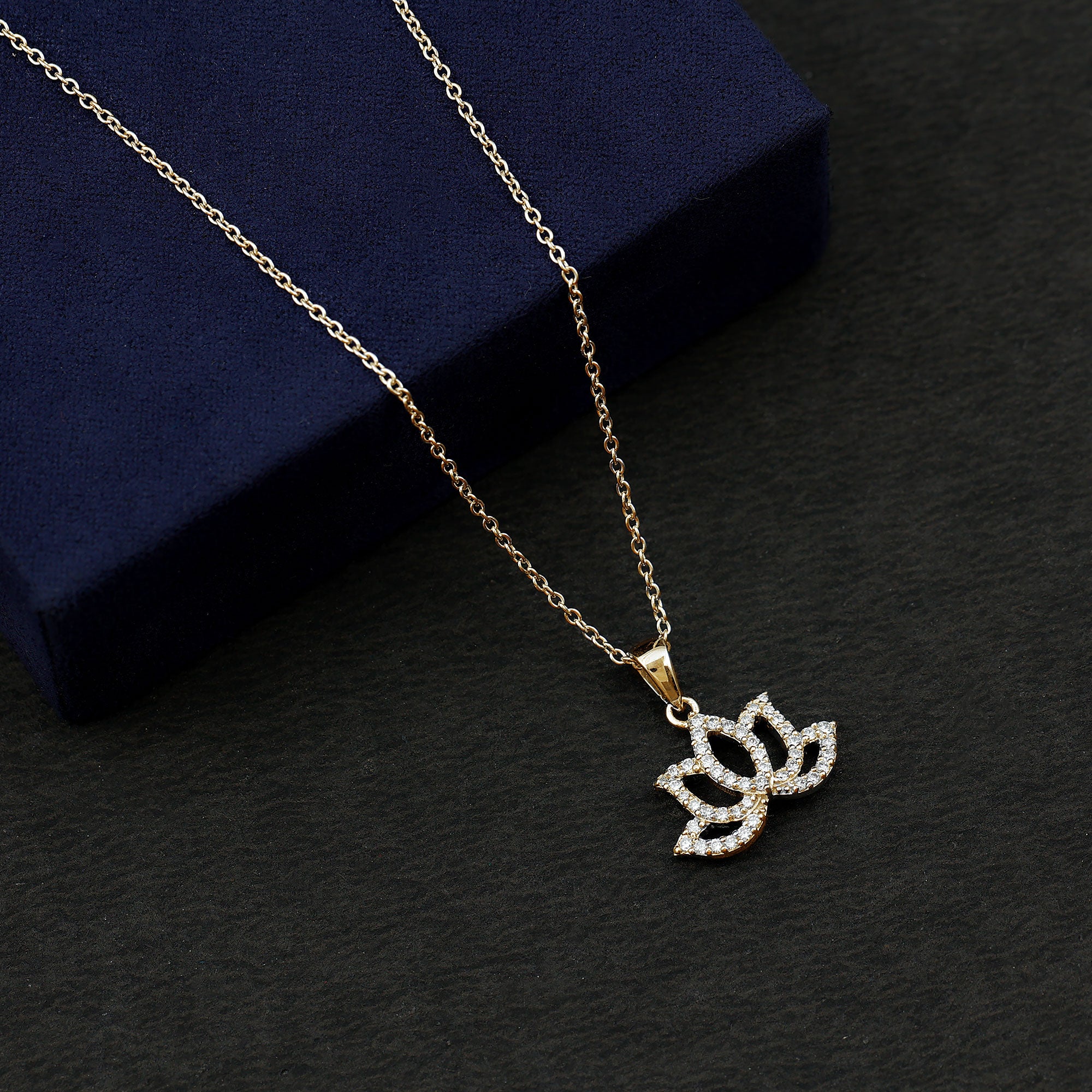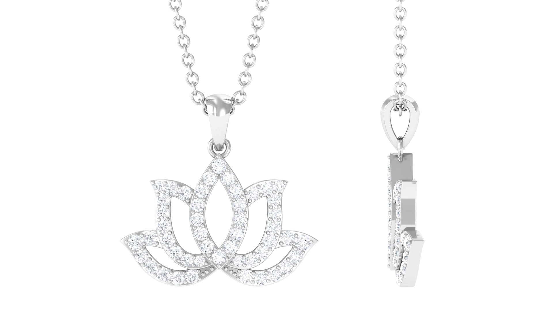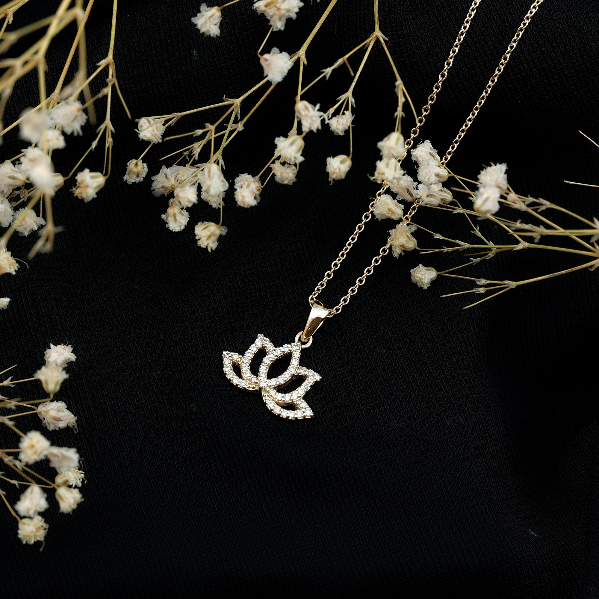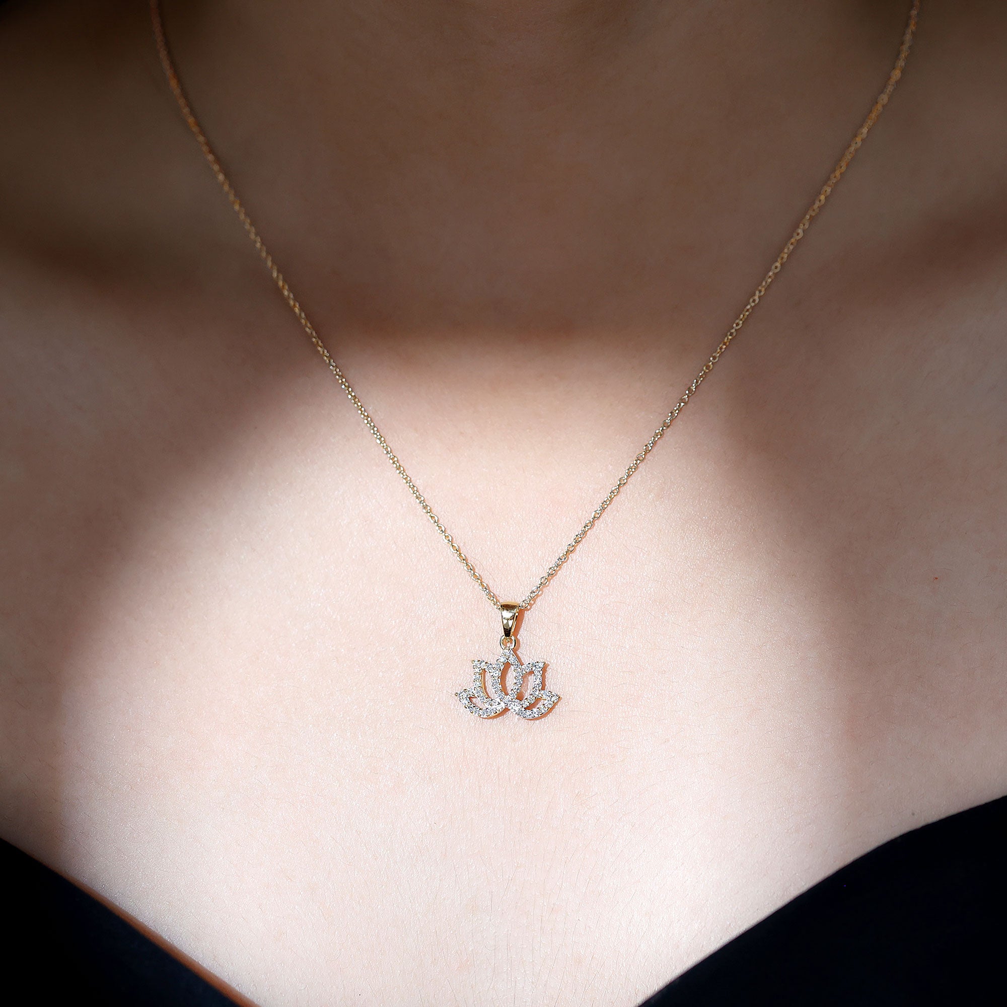 Add a touch of nature-inspired elegance to your look with this stunning Diamond Lotus Necklace. The pendant features a delicate lotus flower design, expertly crafted in gleaming metal and encrusted with a sparkling Round Diamond in Pave Setting. This elegant Lotus Flower Necklace is perfect for adding a touch of sophistication and glamour to any outfit, and makes an ideal gift for someone special. This Diamond Lotus Floral Pendant Necklace is sure to captivate with its intricate design and timeless beauty. Let its shimmering diamonds and delicate floral motif elevate your style and make you feel like a true natural beauty. The simplicity of the Diamond Necklace for Women is punctuated with charm and serenity that radiates wherever you go. The luxury, drama and mystery of this Diamond Pendant Necklace is designed to evoke the spirit of the show in a fun and playful way. So, shimmer and sparkle just as the lotus comes up from the bud, which is pure when it opens. Symbolizing enlightenment and determination, this Real Diamond Necklace combines the timeless beauty of the lotus flower with the captivating beauty of Natural Diamond.
