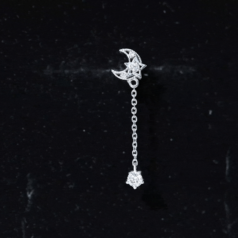 Inspired by the celestial bodies, this Diamond Moon and Star Earring brings a hint of enchantment to your appearance. This earring features certified diamonds set in a moon and star design that glimmer and shine, while a delicate round diamond hangs as a drop, secured in prong setting, drawing attention wherever you go. The moon is bordered with beaded accents, adding a vintage allure to the piece. This Celestial Earring is crafted to be worn in various piercings such as Cartilage, Helix, or Upper Lobe, giving your ear stack a unique and edgy flair. This beautiful Star and Moon Earring is both versatile and sophisticated, making it ideal for any event. This charming, small Dangle Chain Earring is a playful way to introduce interest and texture to your ear stack. Our Chain Cartilage Earring comes in a wide variety of metal colors and types, allowing you to choose your personal favorite, perfect for daily wear as well as on special occasions.