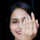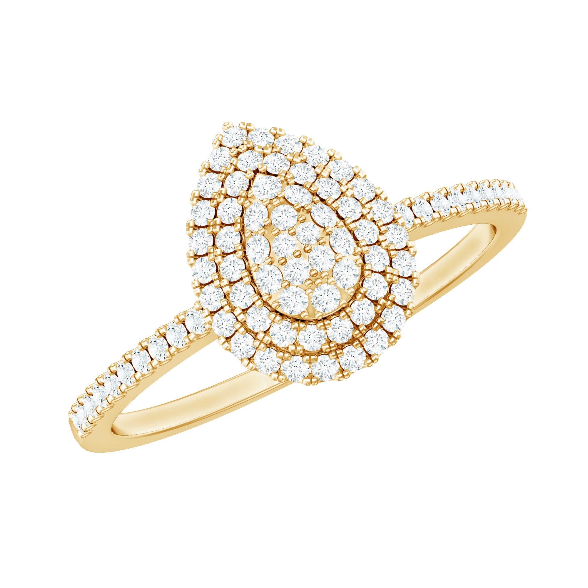 Steal the spotlight with this enchanting Diamond Engagement Ring that showcases the charm with elegance and grace. The epitome of exquisite, stunning beauty has a charming and delicate appeal. This Ring is adorned with Round Shape Diamond in Pave Setting on a Teardrop frame as a Double Halo. To accentuate the shank are the Side stones embedded with Round brilliant cut Diamond accent. Representing tears and joy, it symbolizes the journey of love and the emotions that come with it. Capture hearts with a unique style and deliver a dramatic presence. This Classic Diamond Ring is adorned with Round Shaped Diamond in a cluster form, and the double halo creates a dazzling appeal. As a statement of your love, this Teardrop Engagement Ring optimizes sparkle to shine without distraction. Despite being elegant and eye-catching, it manages to create an aura of excellence as the form gives an elongated appearance to your finger, for a more feminine appearance.