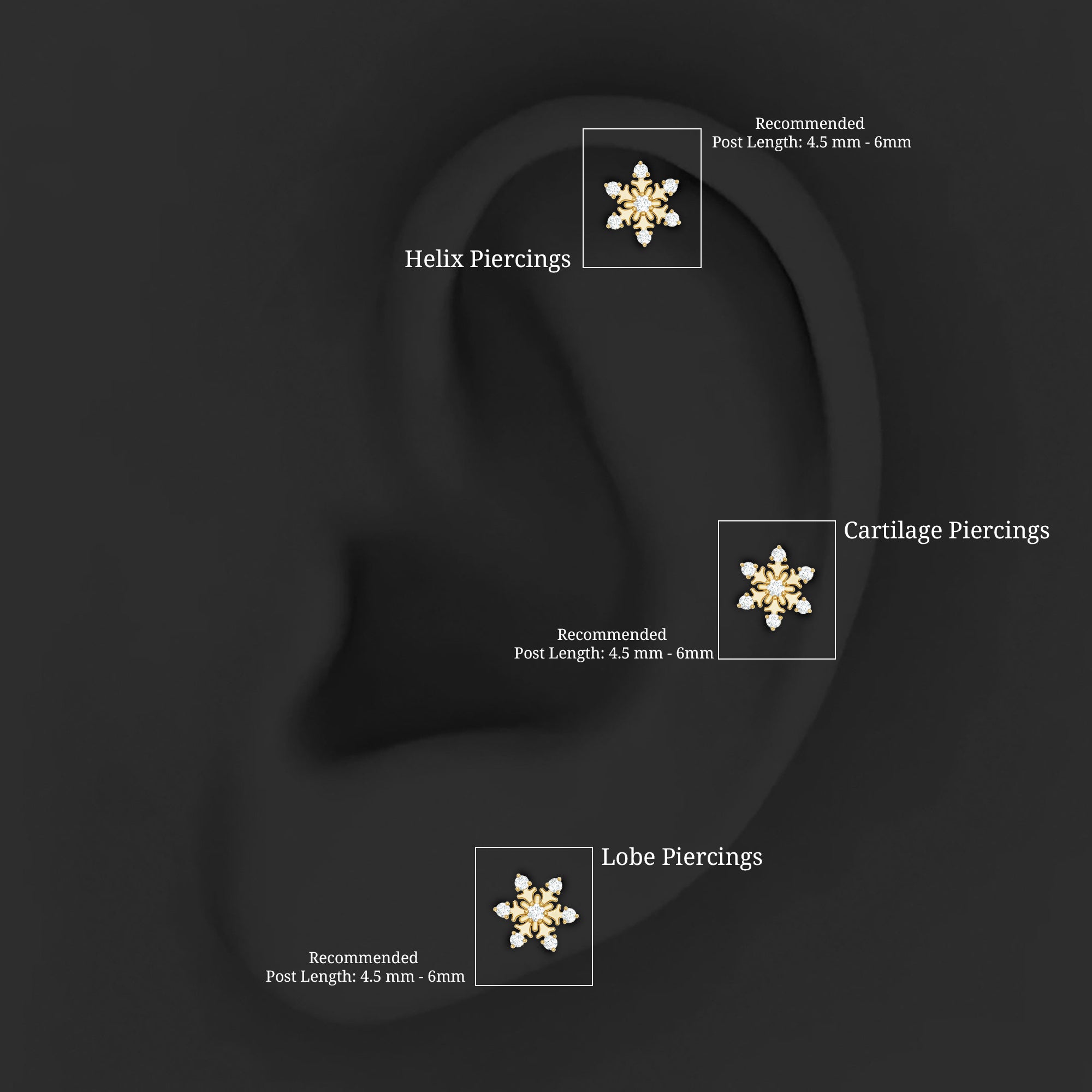 Embrace the unique beauty of snowflakes with this exquisite Diamond Snowflake Earring. This earpiece features a stunning snowflake design encrusted with dazzling round Diamonds in prong setting. This Snowflake Earring is uniquely designed to match your persona. You can wear this earring on your multiple piercings like Upper Lobe, Conch, Cartilage, or Helix Piercing to add a sparkling effect to your look.Surprise your loved one with this amazing earring, a thoughtful and stylish gesture to celebrate any special moment.