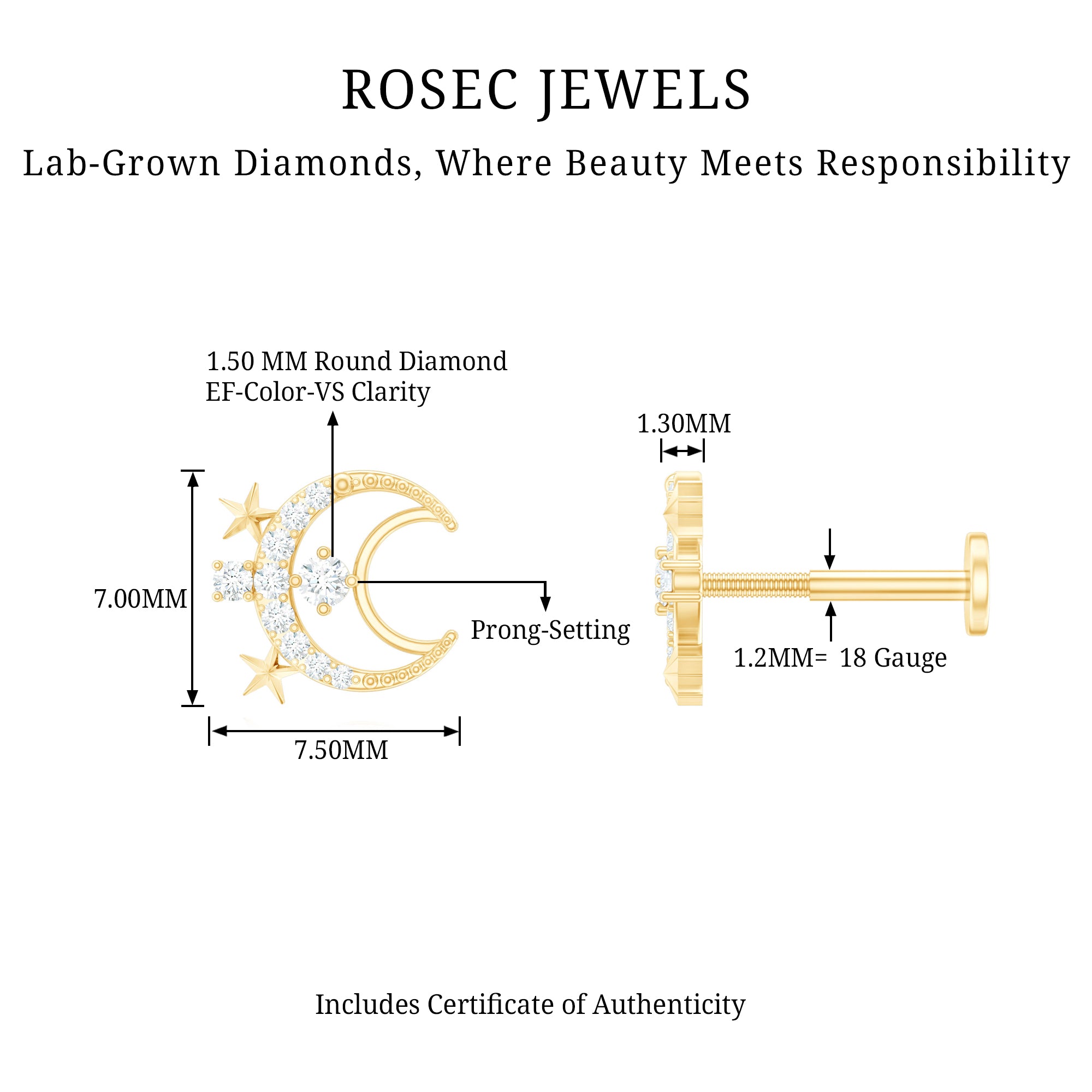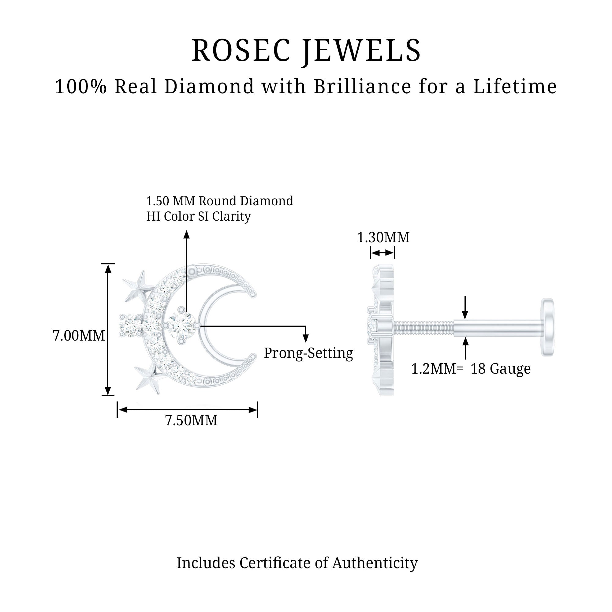 Inspired by the celestial bodies, this Diamond Star and Moon Earring add a touch of magic to your look.The earring features Diamonds in prong setting that sparkle and shine, catching the eye wherever you go.The earring is designed for the Helix Piercing, but can also be worn on multiple piercings like Cartilage, or Upper Lobe, adding a unique and edgy touch to your ear stack.This stunning Star and Moon Earring is versatile and elegant, making them perfect for any occasion.
