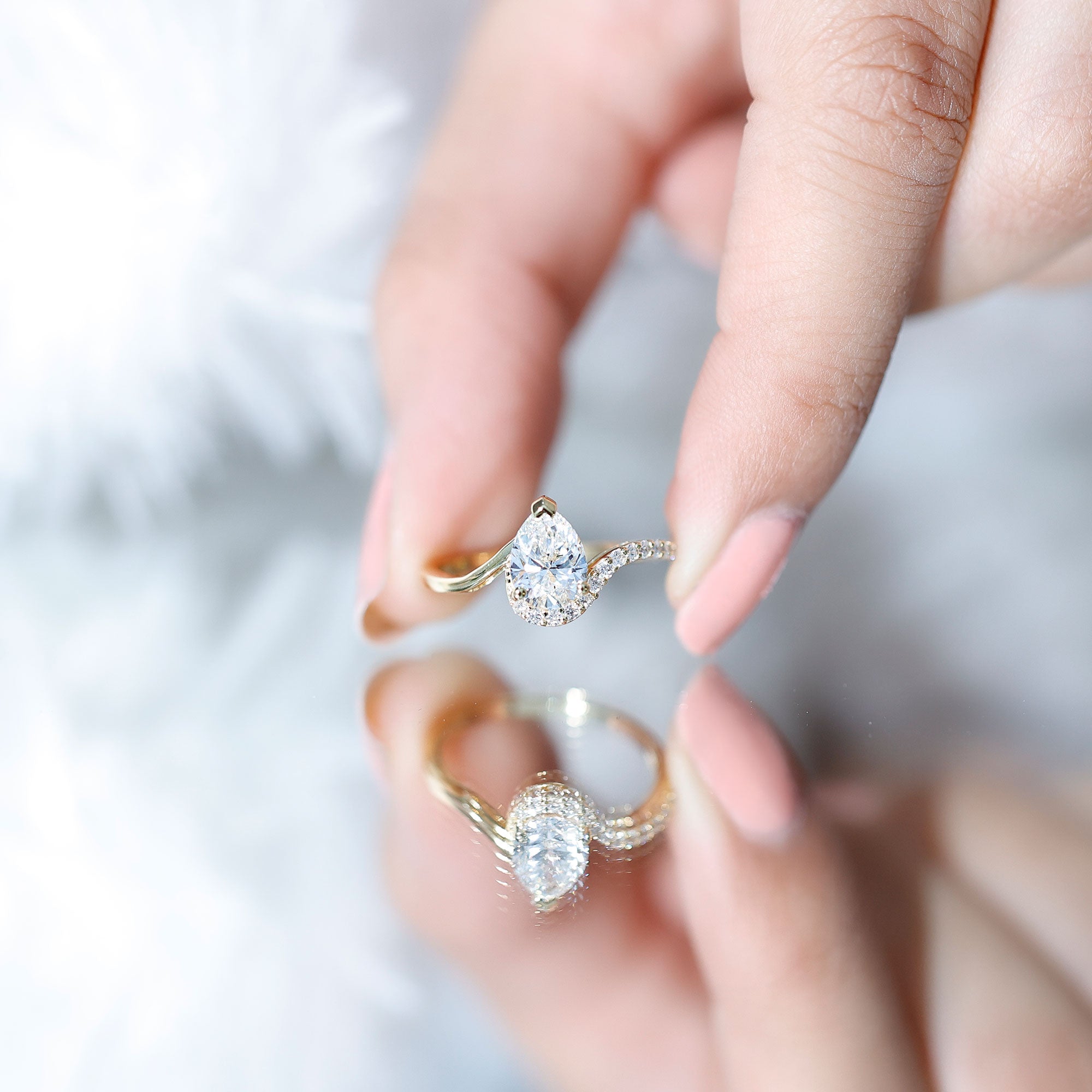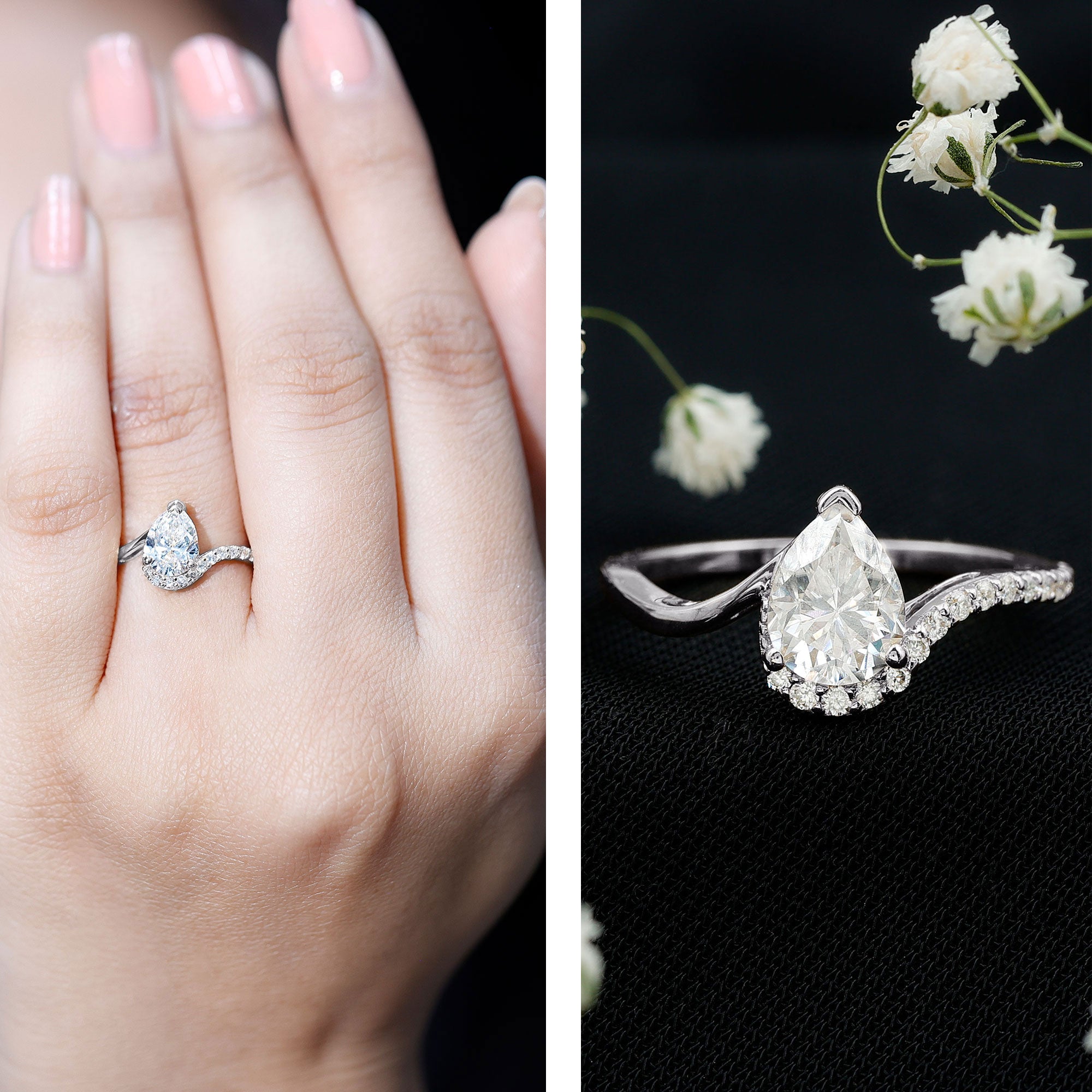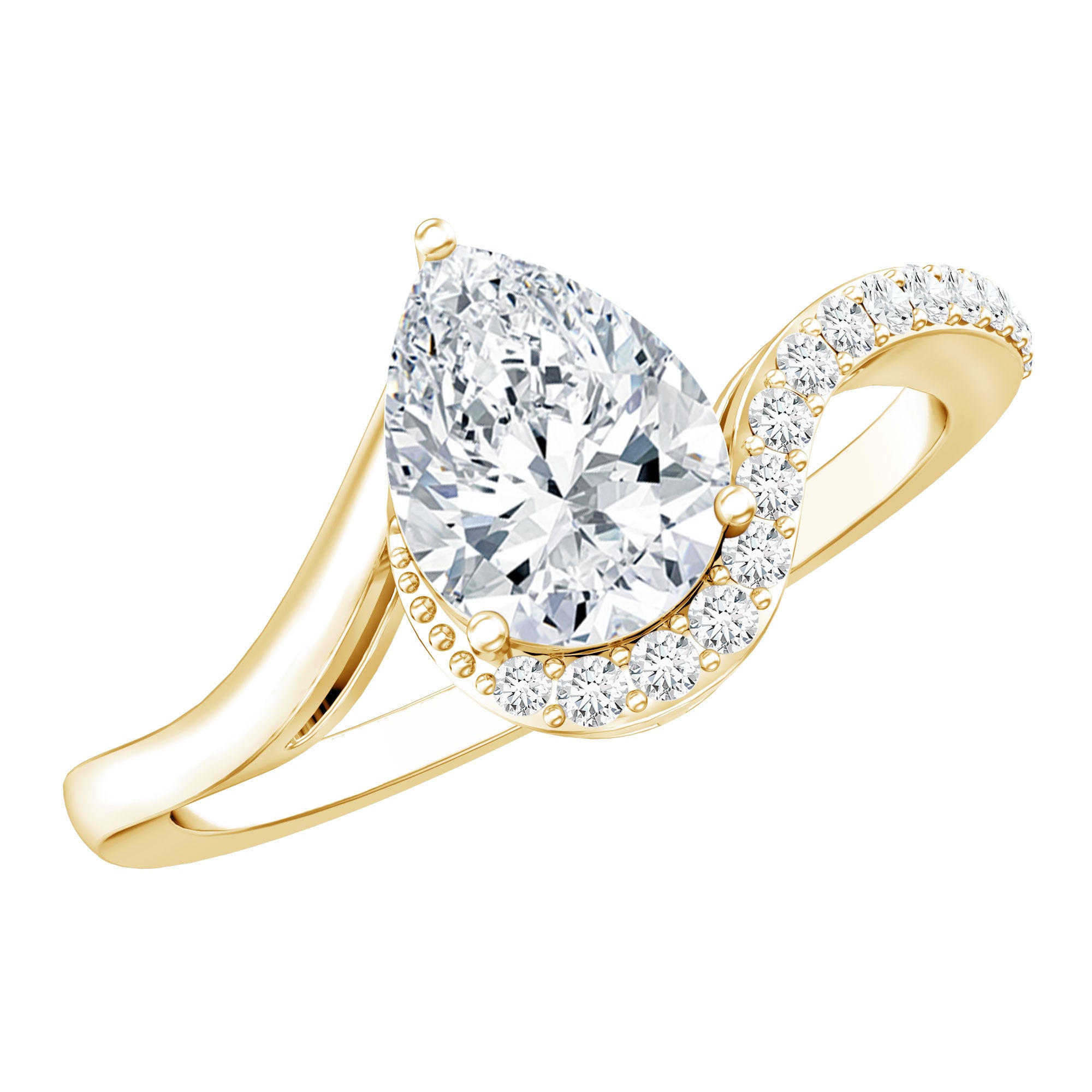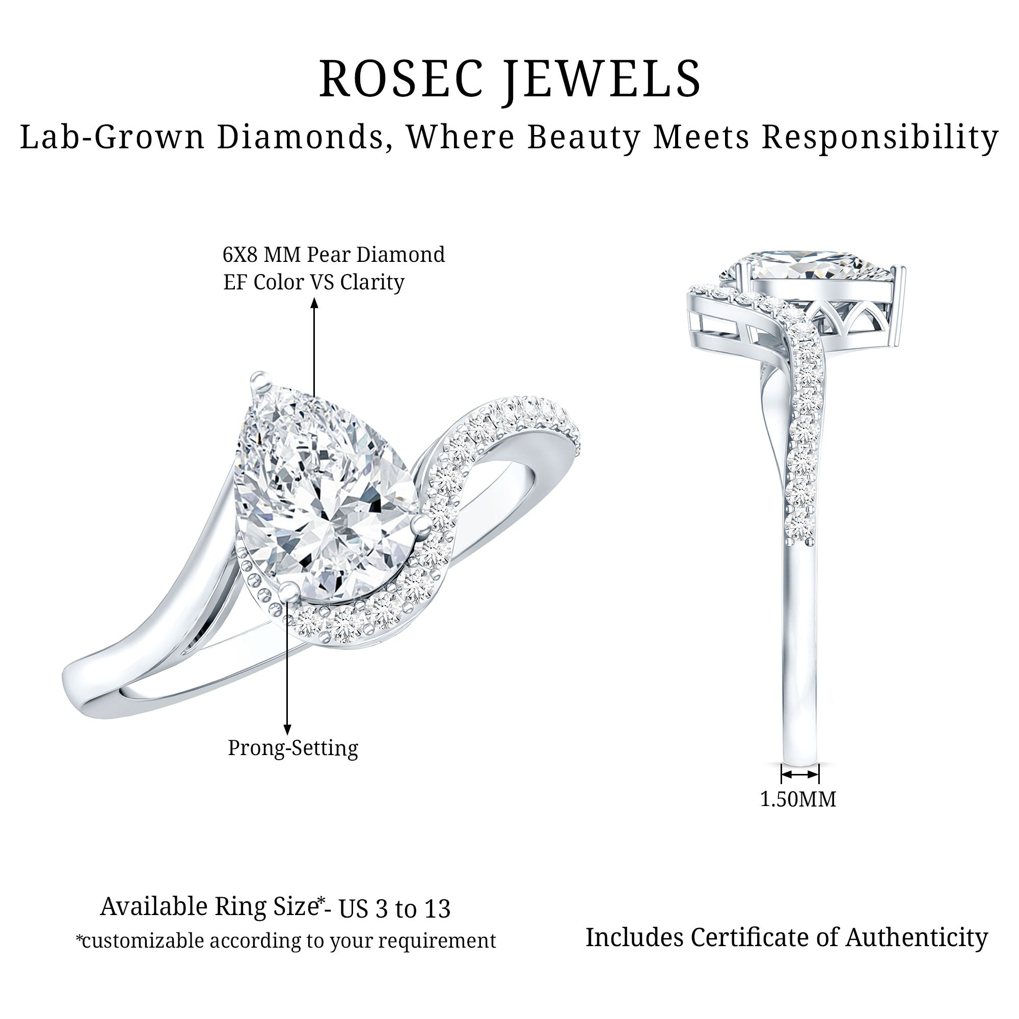 Our Teardrop Engagement Ring is a stunning creation that beautifully merges the unmatched brilliance of a lab-grown diamond with the classic charm of a bypass design. This delightful Solitaire Ring showcases a 6X8 MM pear shaped diamond securely held in prong setting on a bypass band, which is embellished with a row of round gemstones on one side. The EF-VS Quality Lab Created Diamond shines brilliantly, ensuring she is the focal point of any occasion. This Lab Grown Diamond Engagement Ring is an excellent option for your wedding day and is also perfect for proposals and anniversaries, embodying the essence of your bond with your partner. Presenting her with a Diamond Teardrop Ring is a meaningful emotional investment for the future of your relationship, as it encapsulates memories of cherished moments. The design of this 1 CT Diamond Ring is ideal for contemporary romance, appealing to those who value a hint of sparkle with personality. This Bypass Engagement Ring represents eternity, captured in a style that feels both classic and distinctly yours. Allow this breathtaking Pear Shaped Engagement Ring to be the one that makes your heart flutter and captivates everyone around you.