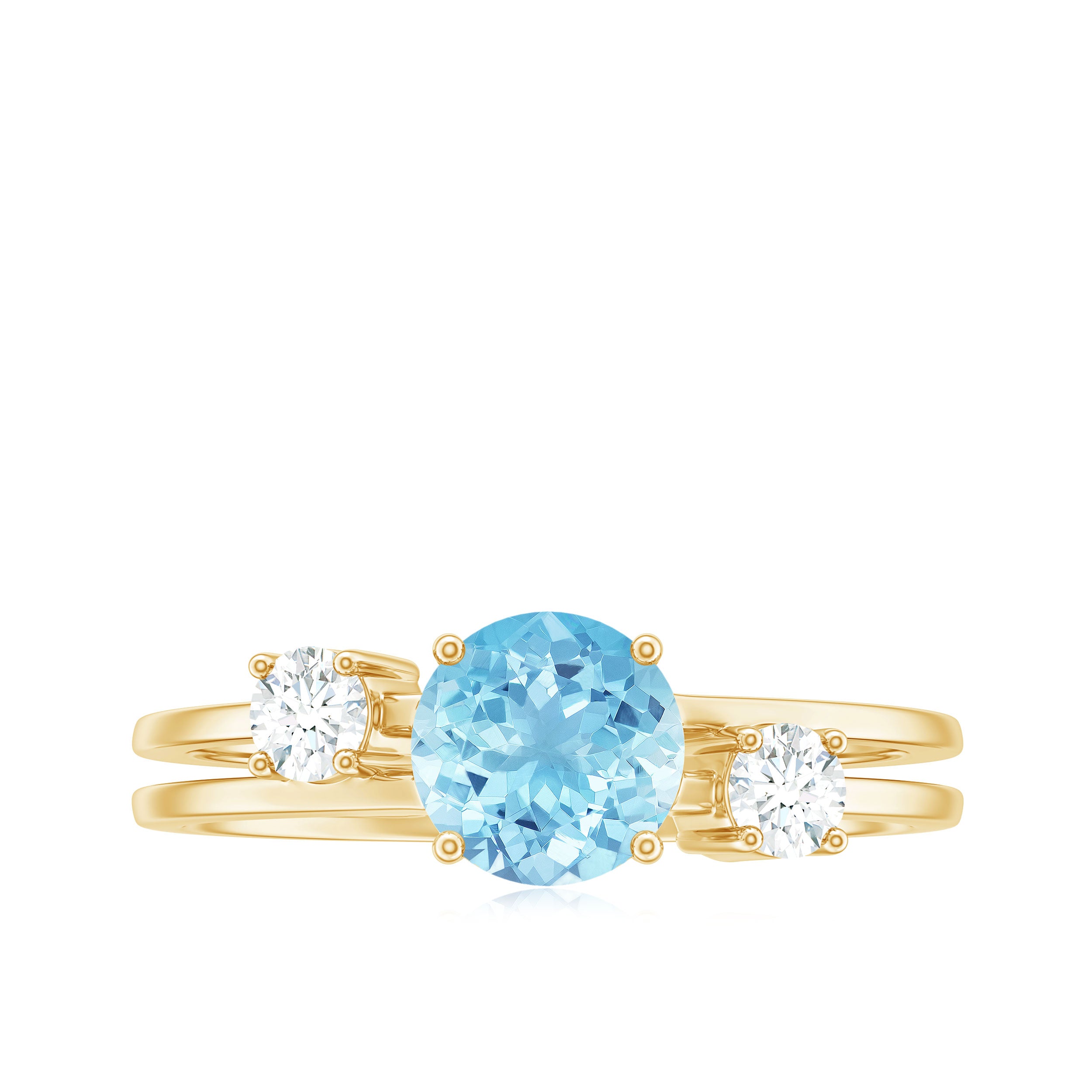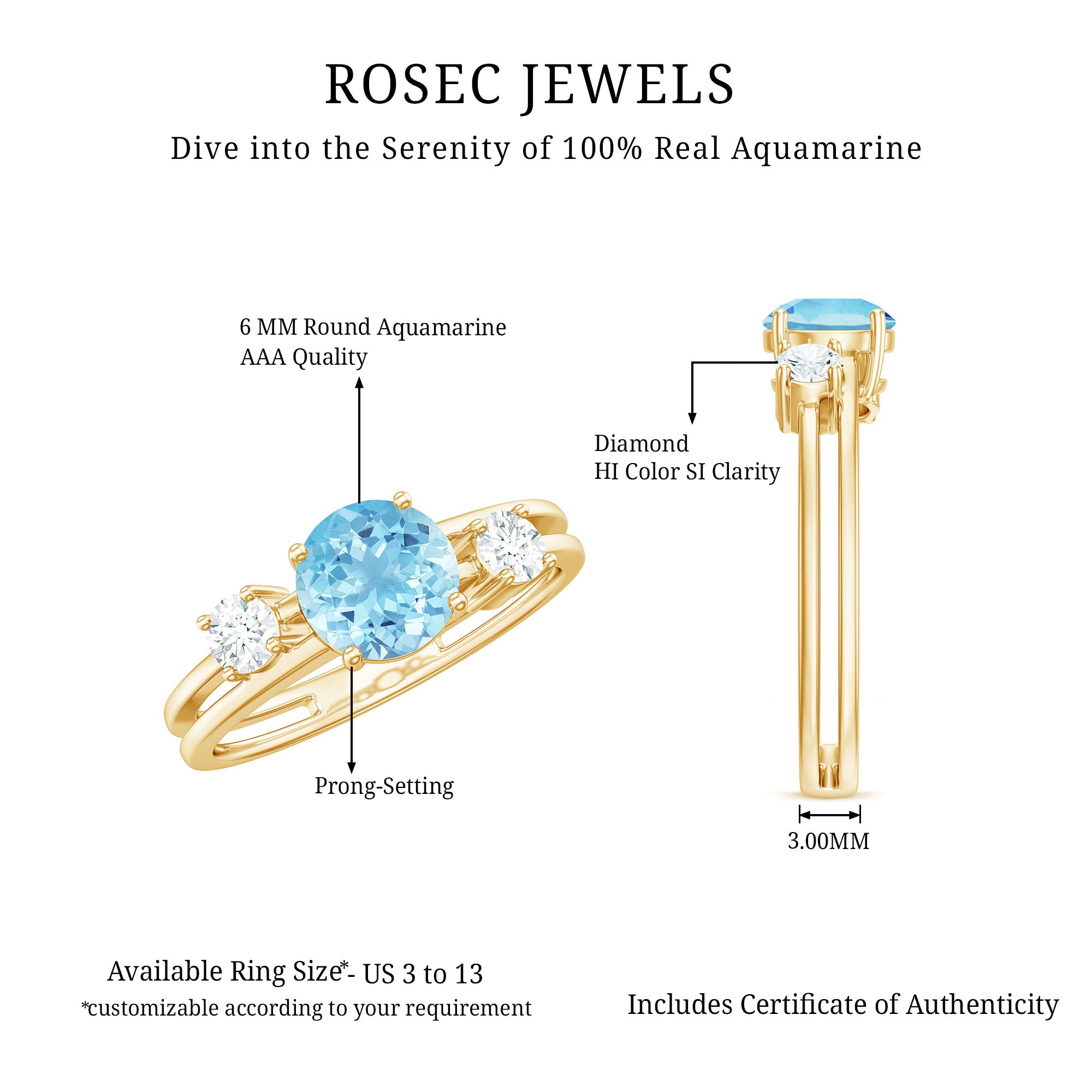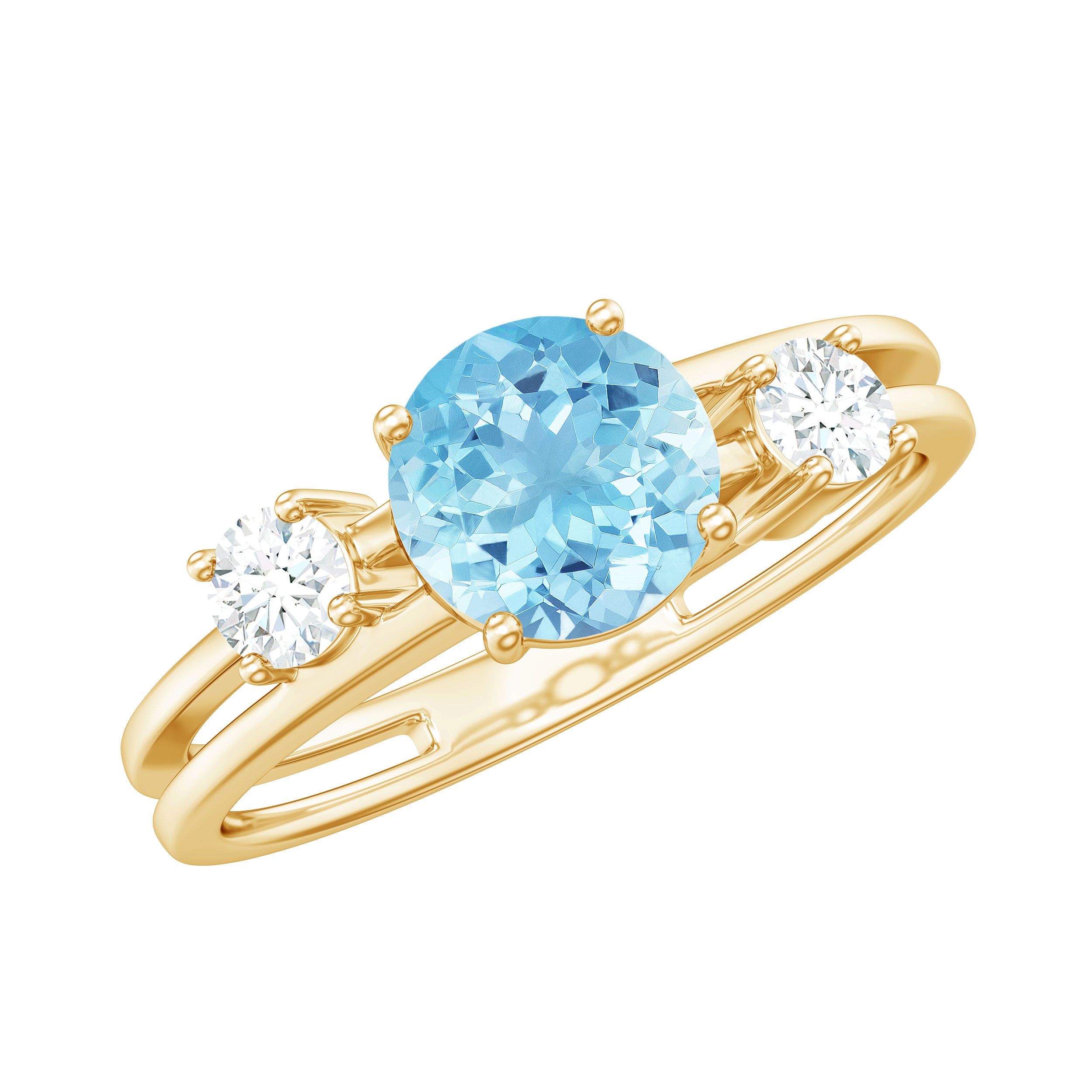This stylish Double Band Engagement Ring is the perfect gift for someone you love. A round Aquamarine is set in a prong setting in the center of this engagement ring, along with a round Diamond. This Aquamarine Engagement Ring is made from gold metal.