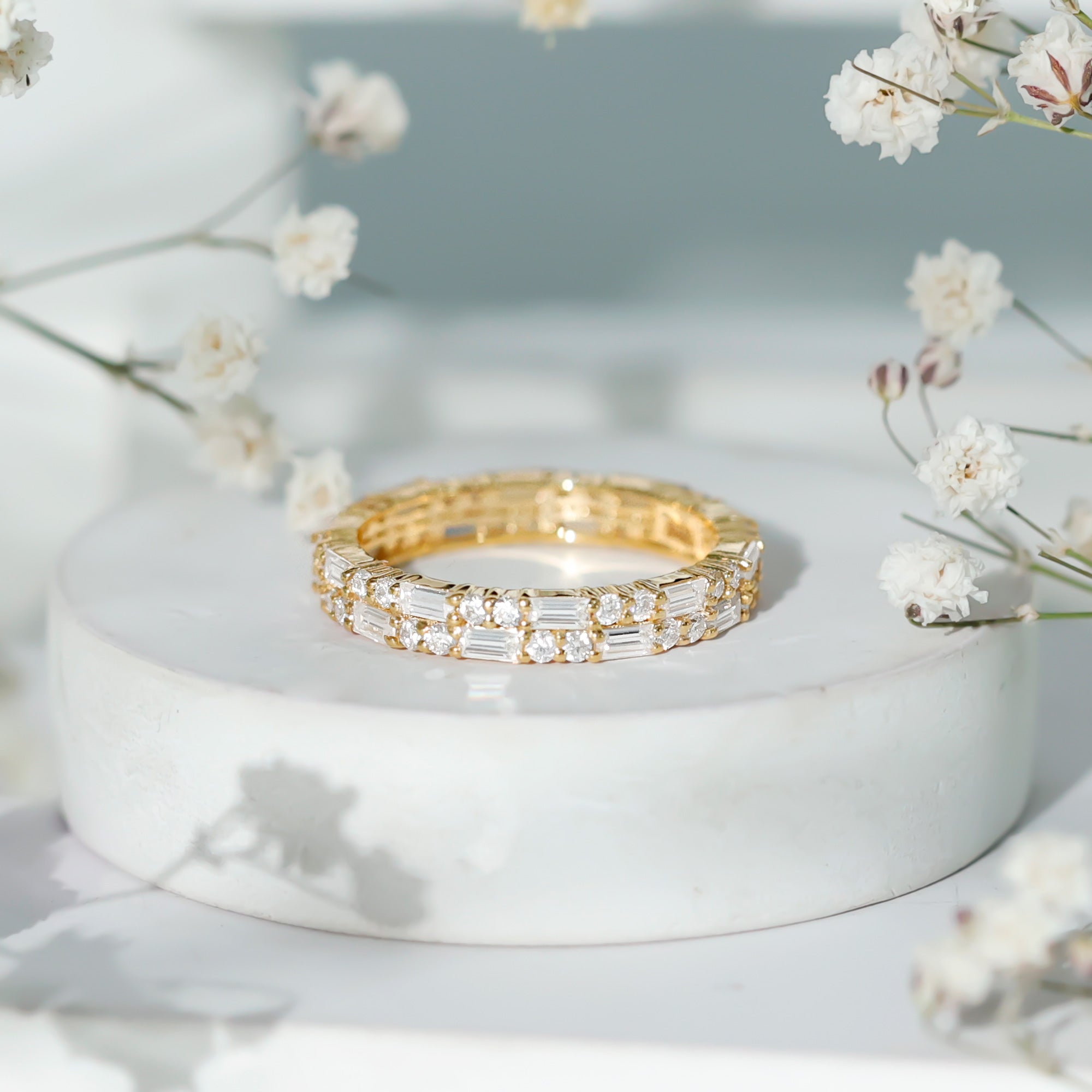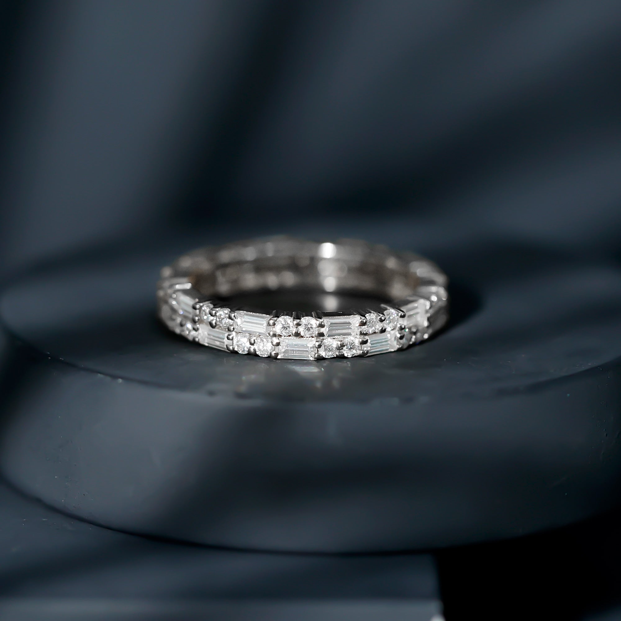 This Eternity Ring can light up the celebration with the classic shine of Baguette and Round Cut Moissanite beholding D-VS1 quality Certified Moissanites are securely placed in the Prong setting. This Full Eternity Ring features a continuous line of moissanites in two rows, making it more wider to grab the eyes. This Moissanite Band Ring beholds the elegant twist that adds radiance to the entire look of the ring. Ask her the most important question by presenting this Moissanite Eternity Band. Let the adorable shine of this Elegant Eternity Ring take the stage for your dream proposal.