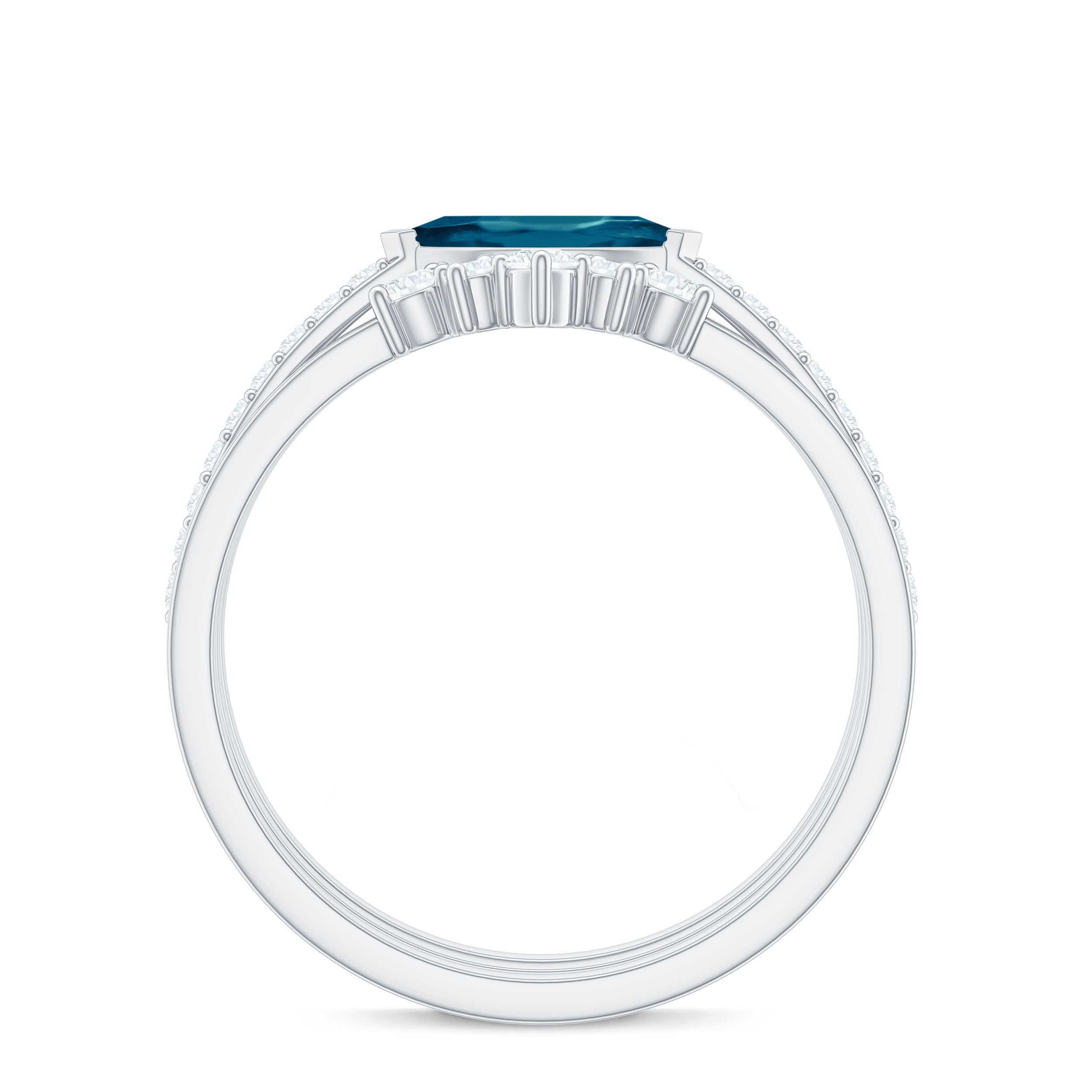 Embrace your new beginning with a ring set that embodies both contemporary style and profound significance. This exquisite Blue Topaz Wedding Ring Set is crafted to attract attention while carrying deep emotional resonance. Meticulously designed, this 3 Piece Bridal Set presents a harmonious blend of sophistication, fashion, and meaning. At the core of the set lies a 4X8 MM marquise cut london blue topaz, positioned in an east-west orientation within a secure prong setting. Flanking the center stone are round, sparkling diamonds that add a touch of brilliance, elegantly framing the blue topaz and enhancing the overall appearance of the engagement ring. Accompanying the main ring are two crown-shaped enhancer bands that infuse additional charm and intricacy into the Blue Topaz Engagement Ring Set. Each band is adorned with round diamond stones arranged in a graceful curve, forming a delicate border around the center ring. These bands not only accentuate the allure of the engagement ring but also impart a regal essence to the entire ensemble. Collectively, the three rings create a cohesive bridal aesthetic that is ideal for those who appreciate a fusion of traditional and modern design. You have the option to wear all three for a striking statement or to mix and match them for various occasions. Crafted for comfort and durability, this Natural London Blue Topaz Ring Set will serve as a daily reminder of your commitment.