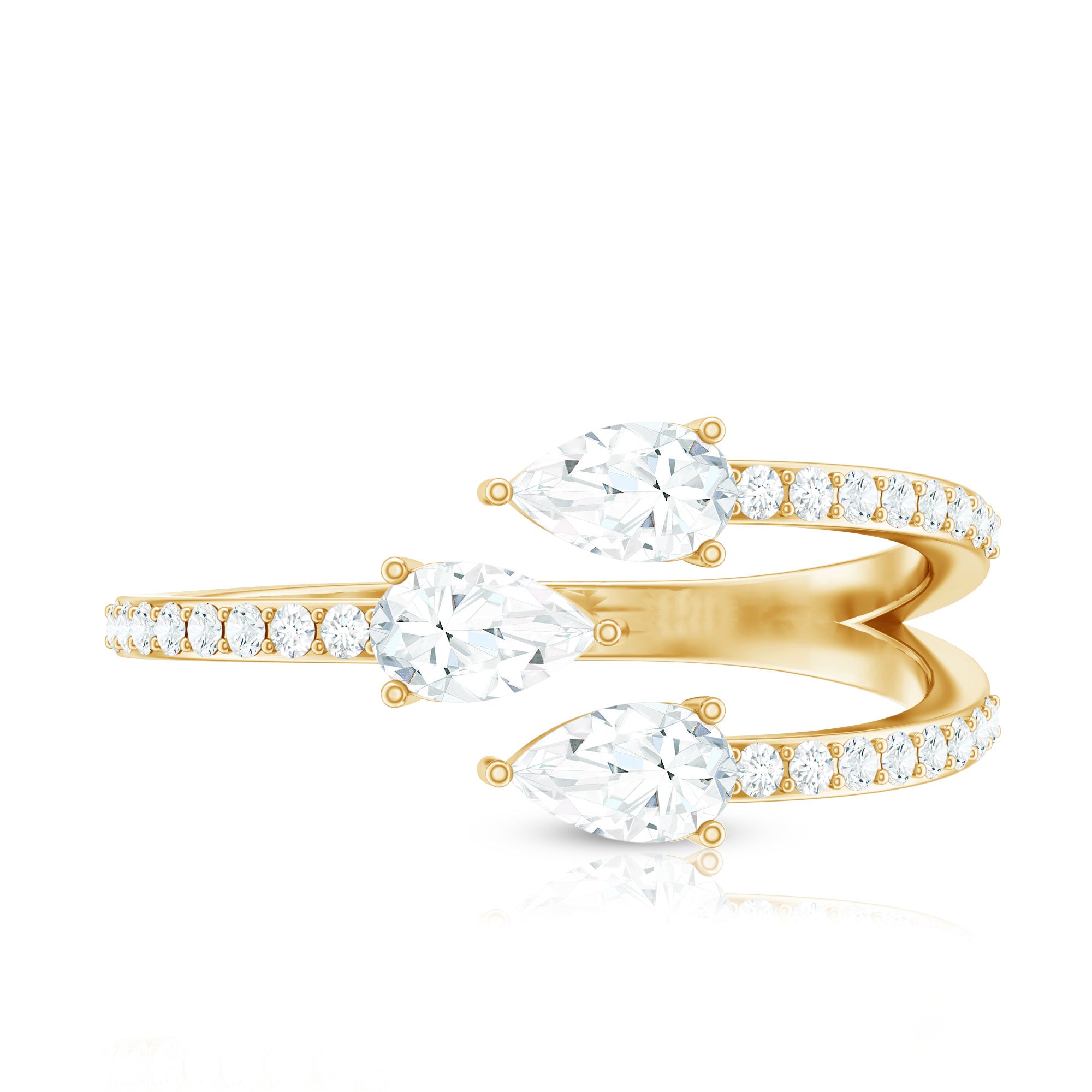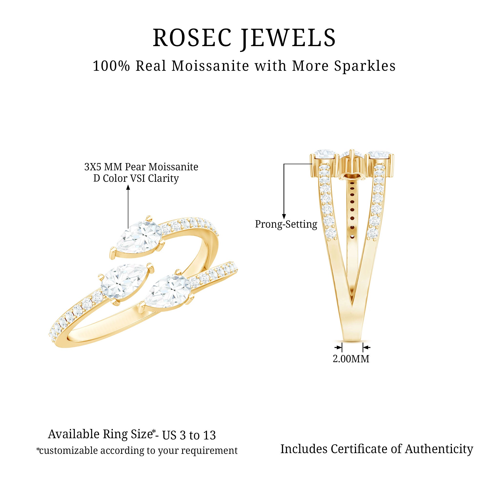 Bold style meets deep meaning in this eye catching Moissanite Wrap Ring, crafted to represent your unconditional love. With its elegant wrap around design, this Open Cuff Ring makes a powerful statement while holding a heartfelt message close. Three stunning 3X5 MM pear shaped moissanite stones sit gracefully at each end of the wrap in east west style, symbolizing the past, present, and the future. Nestled over the bands are round moissanite stones. All three stones are set securely in prong setting, allowing light to reflect beautifully from every angle. The open end style creates a flowing, modern look, adding extra brilliance and depth. The wrap shape gently curves around the finger, offering a bold yet graceful fit that feels both contemporary and meaningful. The symbolism of past, present, and future makes it a truly personal piece. Available in multiple sizes for a comfortable fit, this Moissanite Three Stone Ring is designed to feel as good as it looks. It comes with a certificate of authenticity and is beautifully packaged in a luxury jewelry box, ready for gifting or treasuring for yourself.