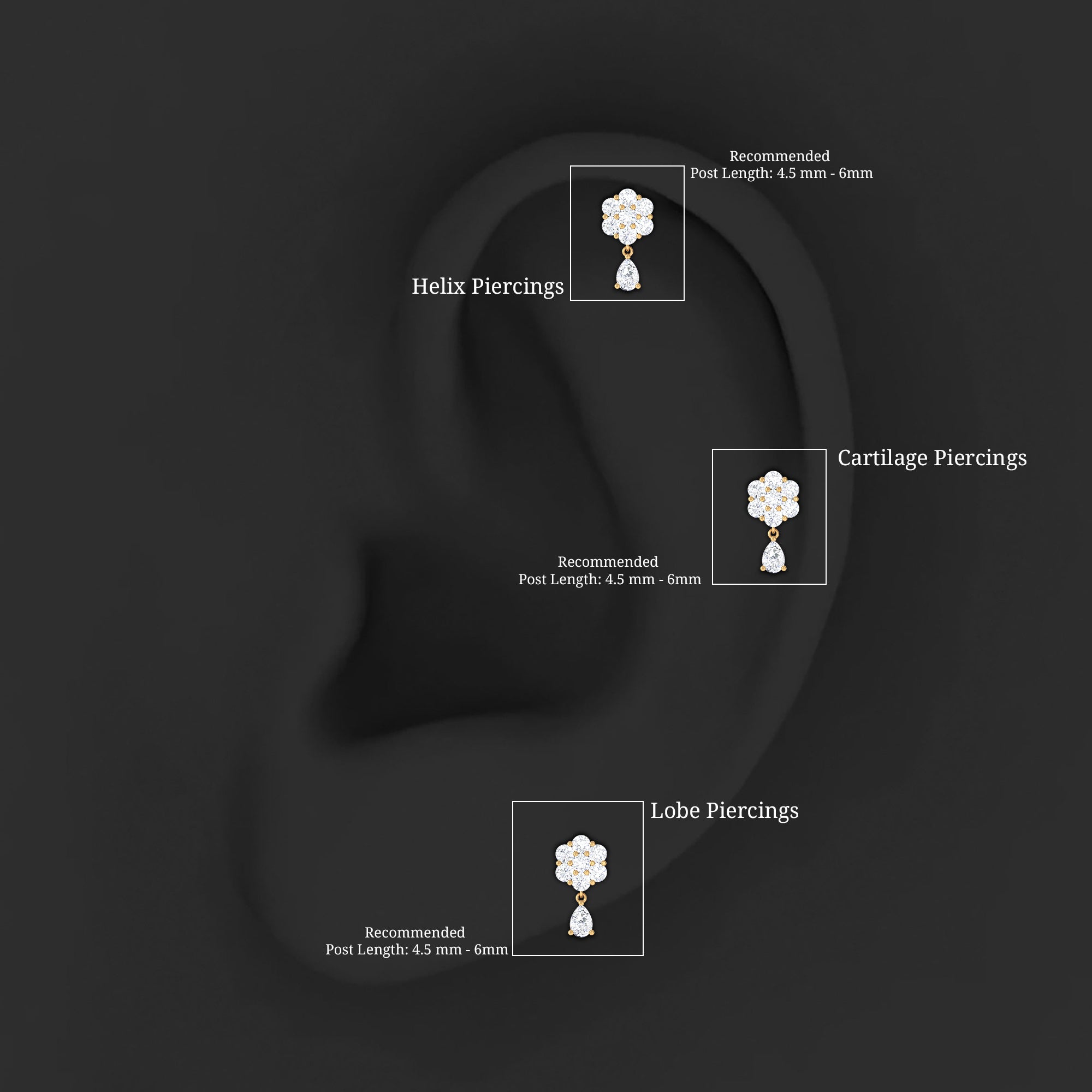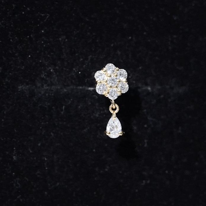- The piercing earring features round diamond cluster resembling as a flower this earring exudes beauty and uniqueness. While a pear shaped diamond in prong set, hanging as a drop.