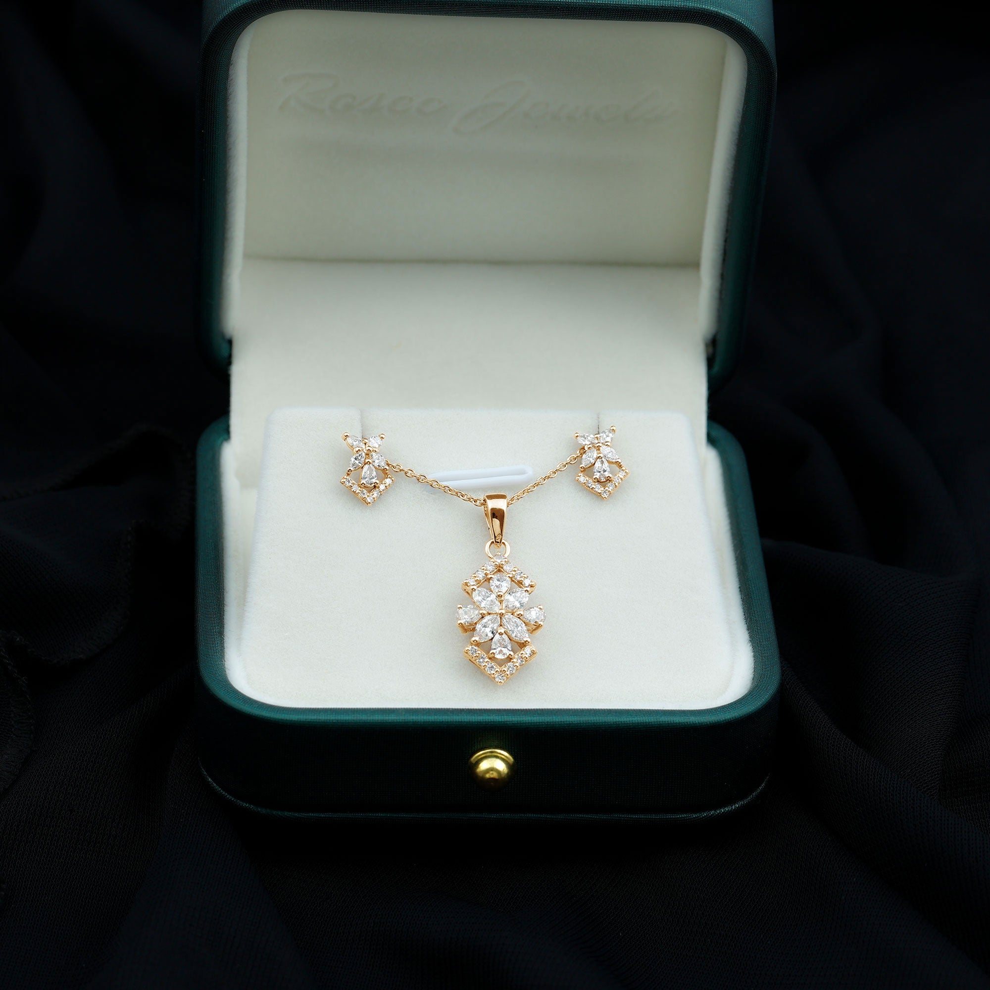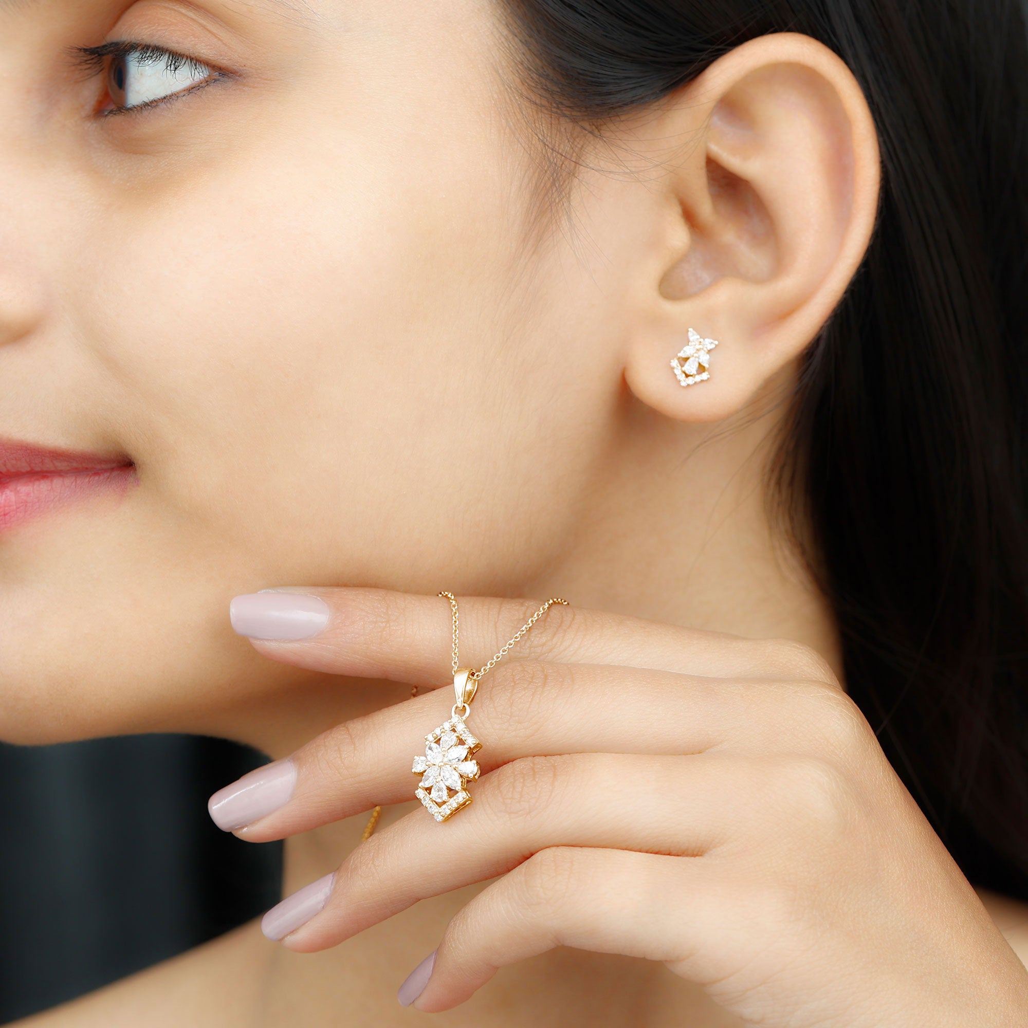 Capture the heart of your beloved and leave her in awe with this elegant Diamond Jewelry Set. The Floral Jewelry Set showcases the timeless beauty of Marquise, Round, and Pear Cut Diamond, delicately placed in a prong setting to enhance its charm. This enchanting Art Deco Pendant and Earrings Set is the epitome of fine jewelry, making it the perfect choice for a special occasion.