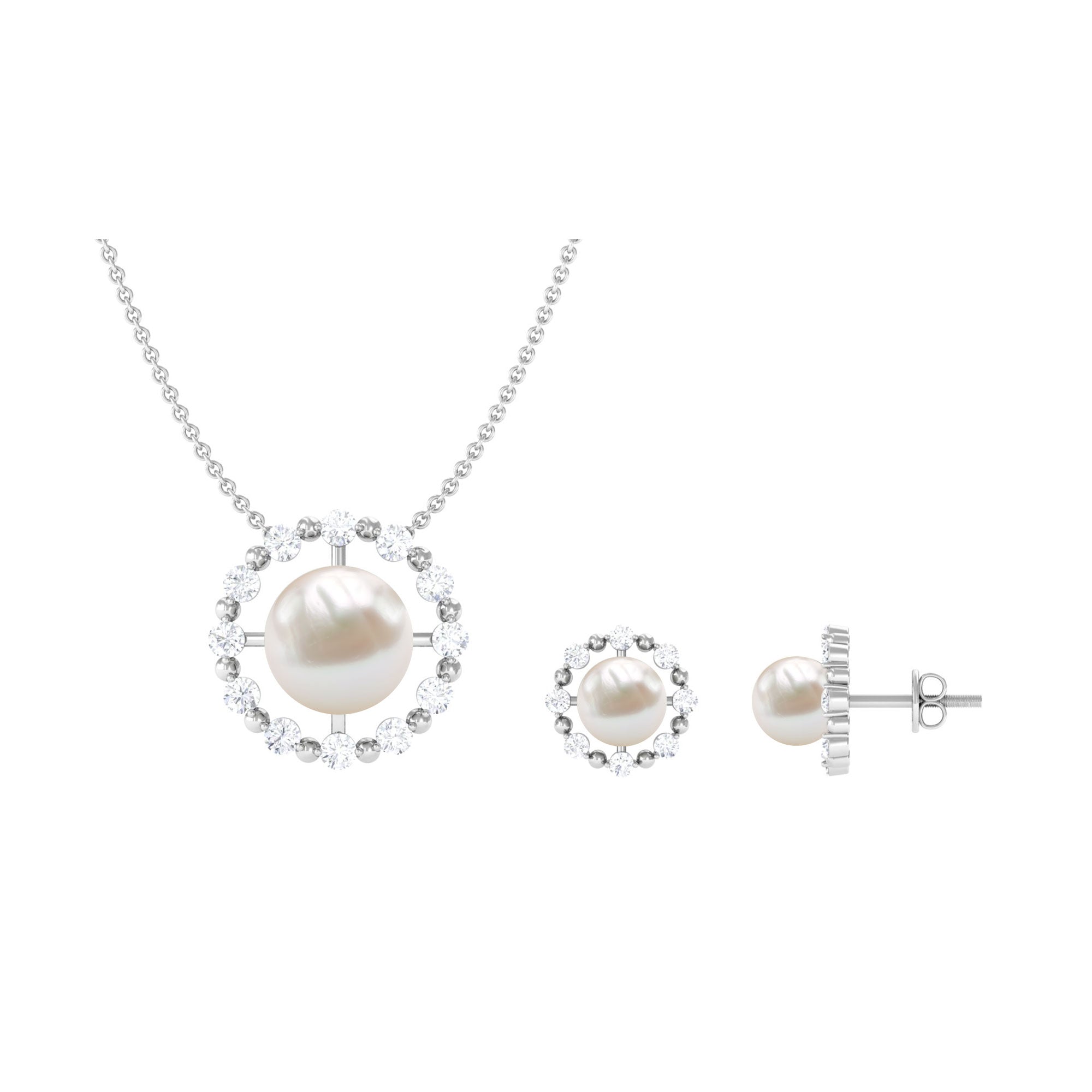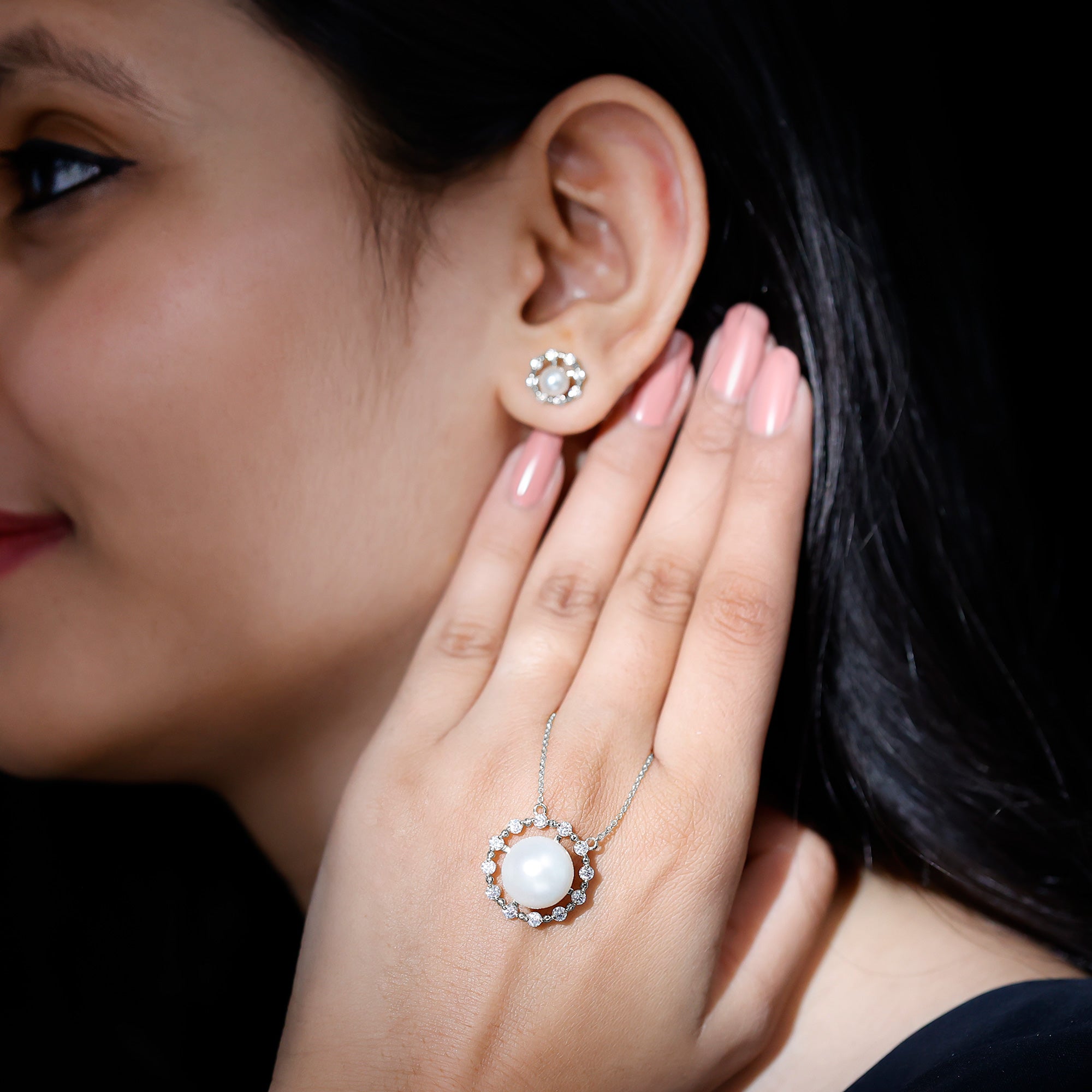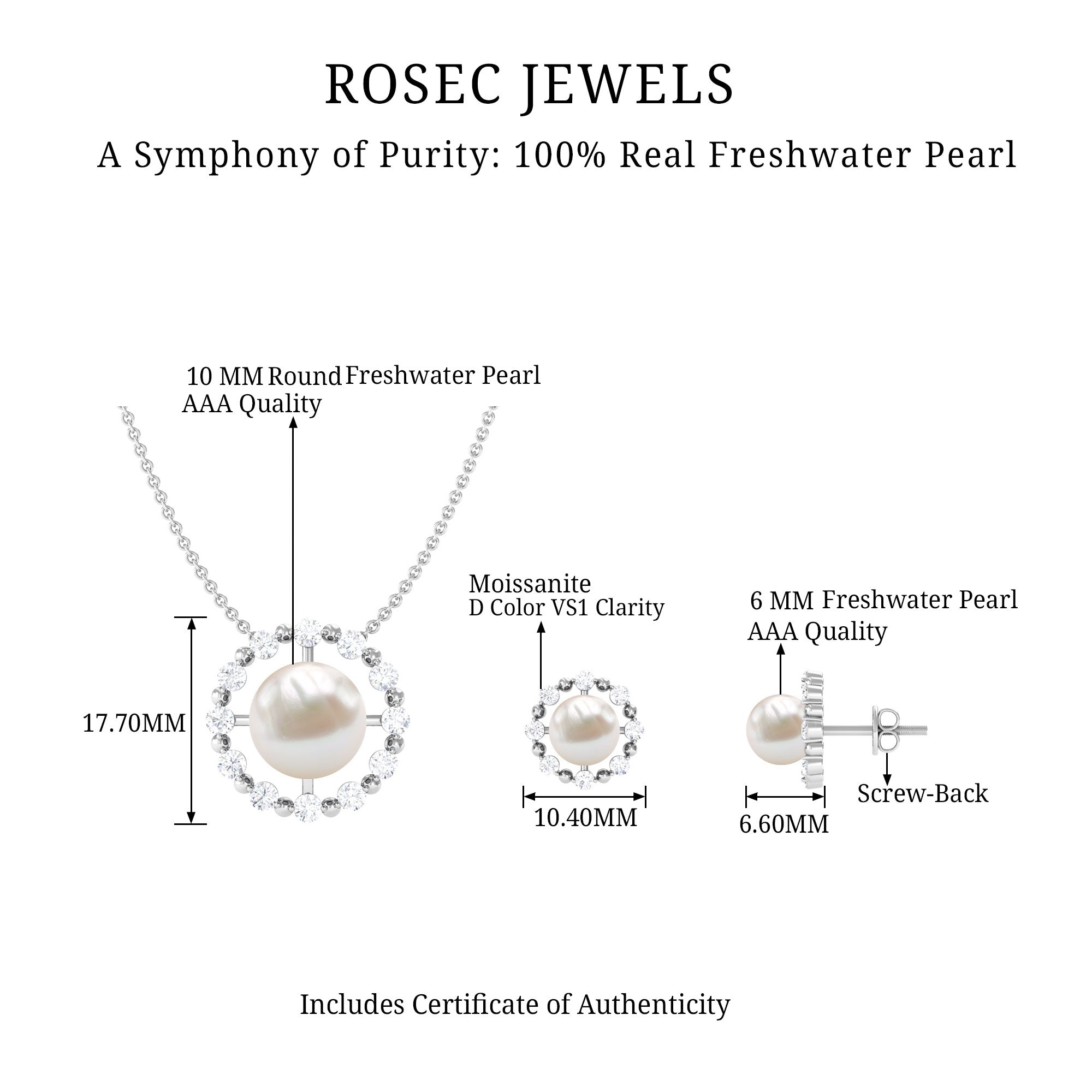 Embrace elegance by wearing this Classic Freshwater Pearl Jewelry Set wherever you go! It features a matching duo of Freshwater Pearl Halo Pendant and Earrings. Stealing all the attention with its royal allure, Round Shape Freshwater Pearl sits at the heart of this design. The sparkly Halo of alternately set Round Shape Moissanite and Beaded Metal make it all the more eye-striking.