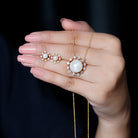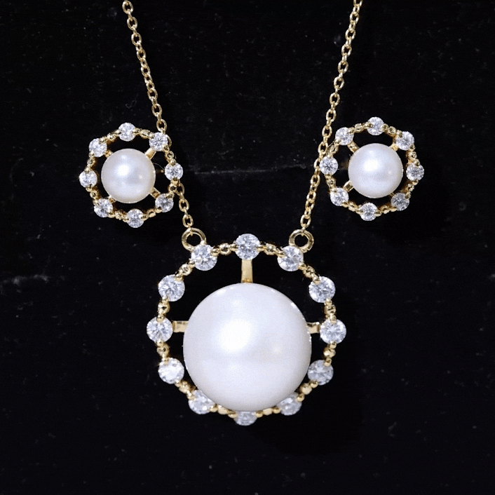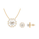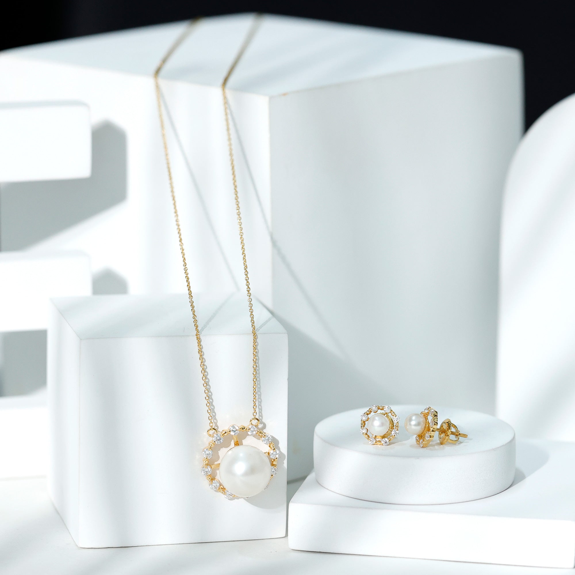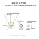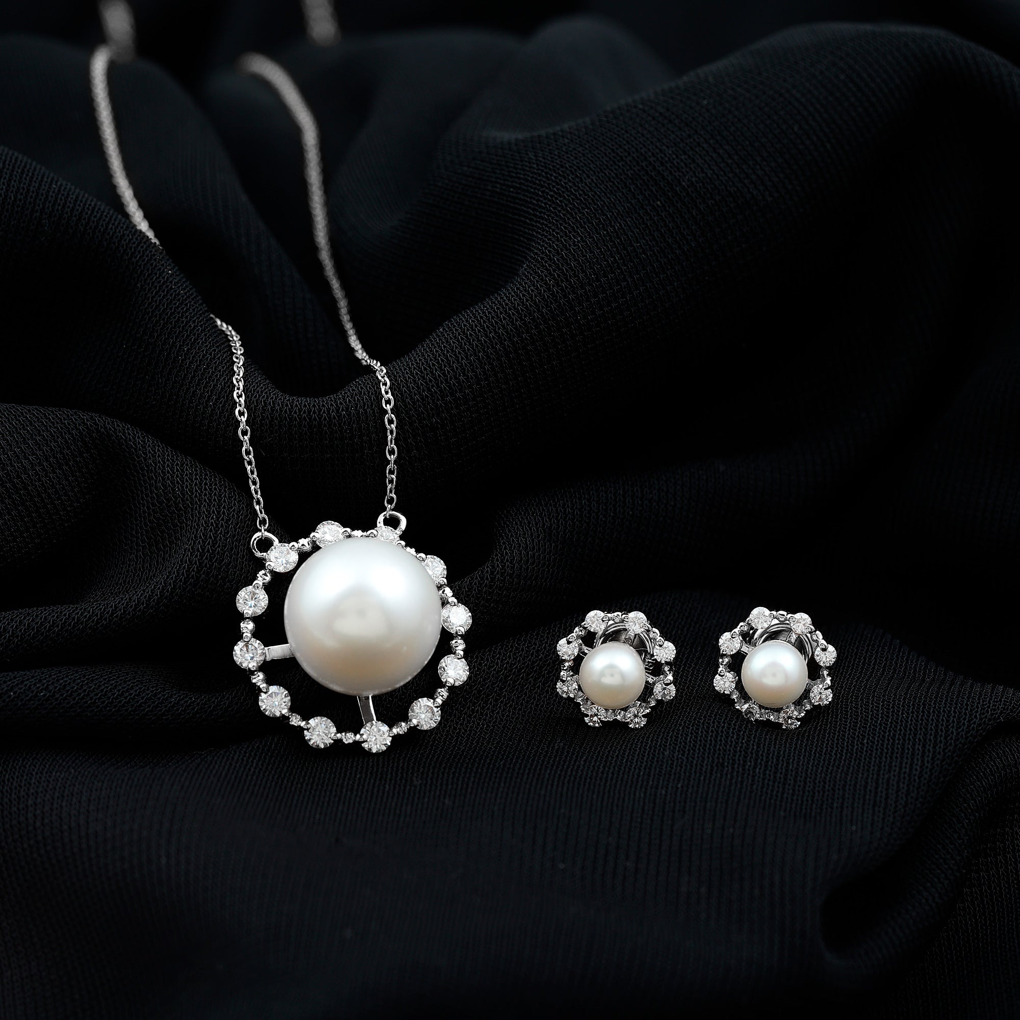 Embrace elegance by wearing this Classic Freshwater Pearl Jewelry Set wherever you go! It features a matching duo of Freshwater Pearl Halo Pendant and Earrings. Stealing all the attention with its royal allure, Round Shape Freshwater Pearl sits at the heart of this design. The sparkly Halo of alternately set Round Shape Moissanite and Beaded Metal make it all the more eye-striking.