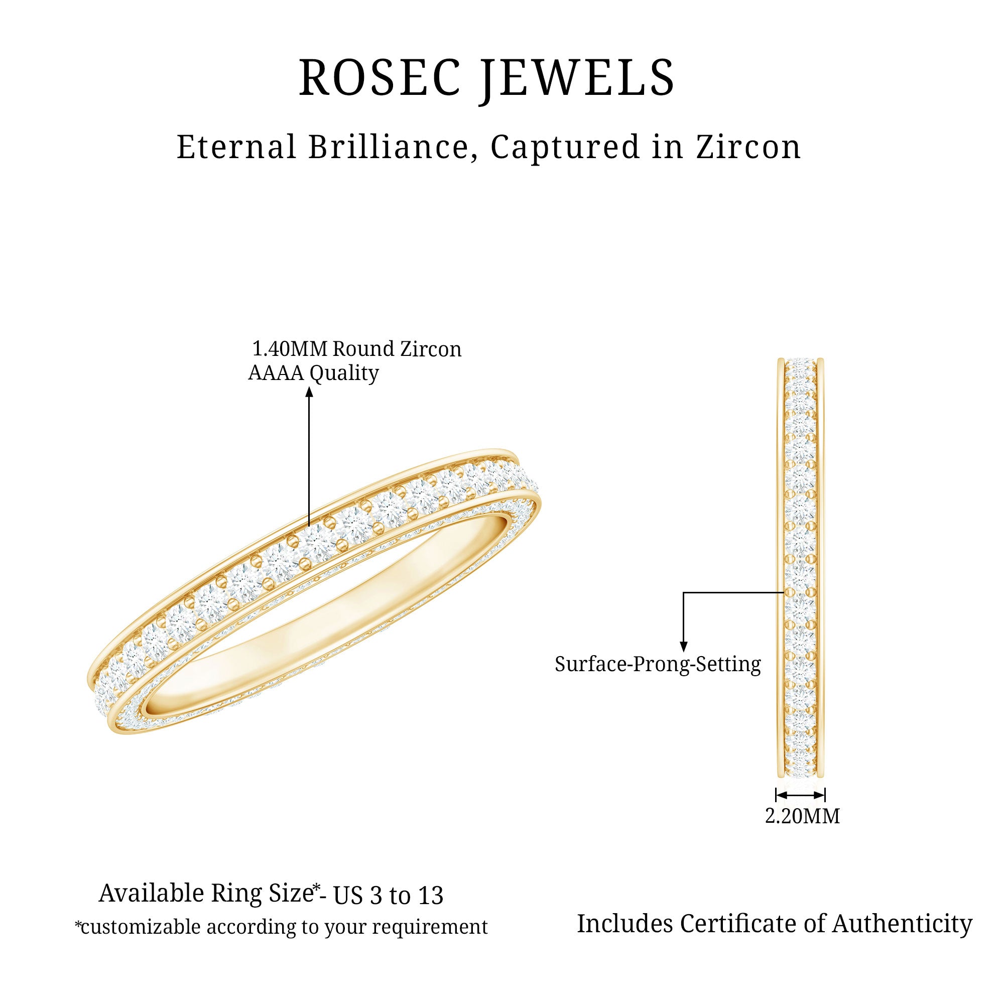 Express your feelings for your significant other with this gorgeous Full Eternity Ring, adorned with round shape cubic zirconia set in a surface prong setting. This elegant ring is crafted in gold, making it a perfect symbol of your love.