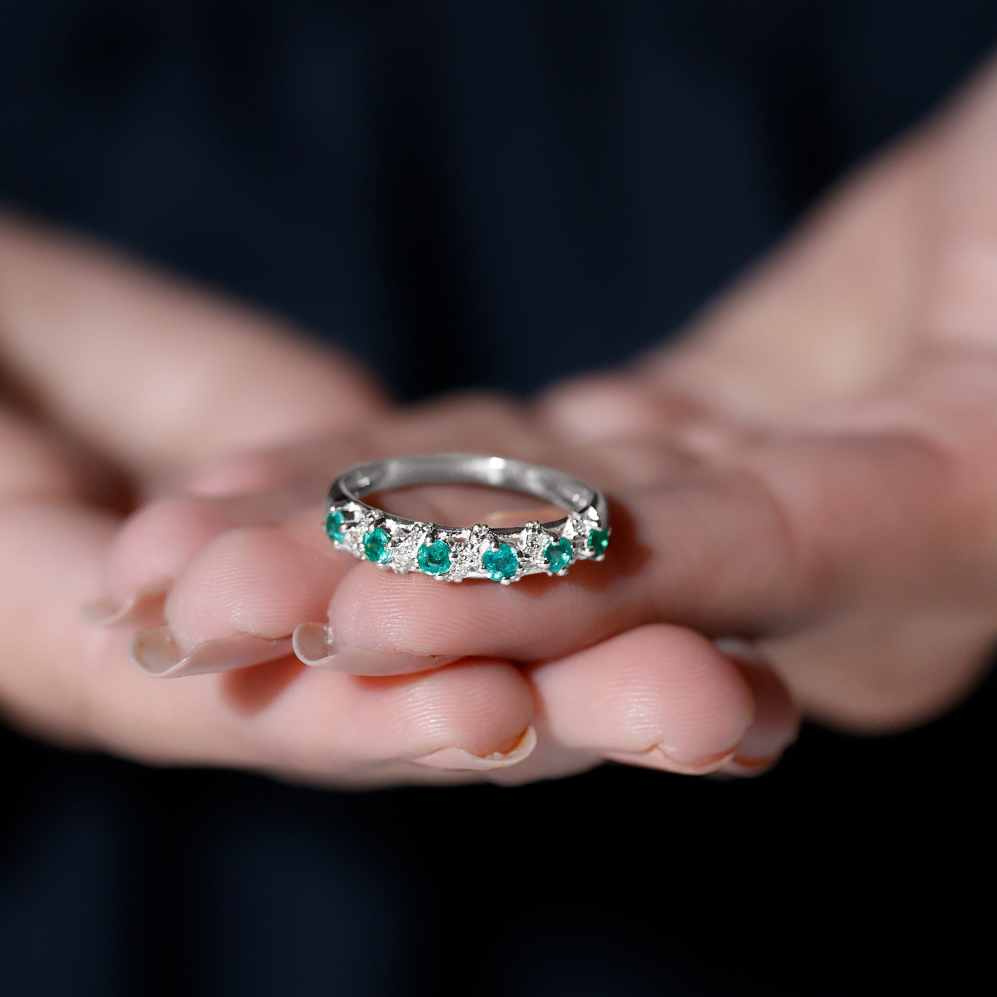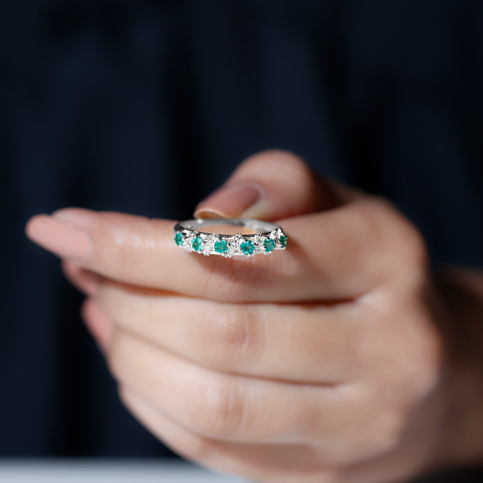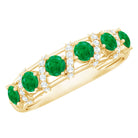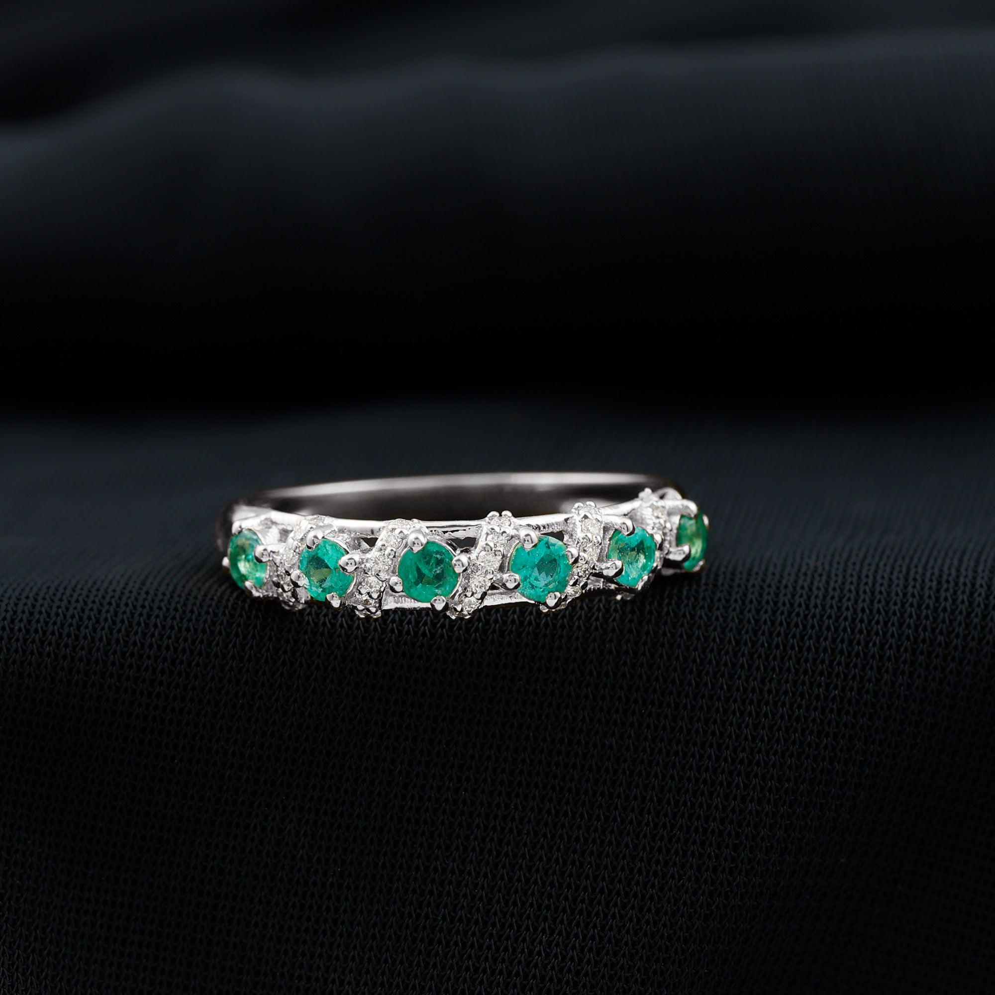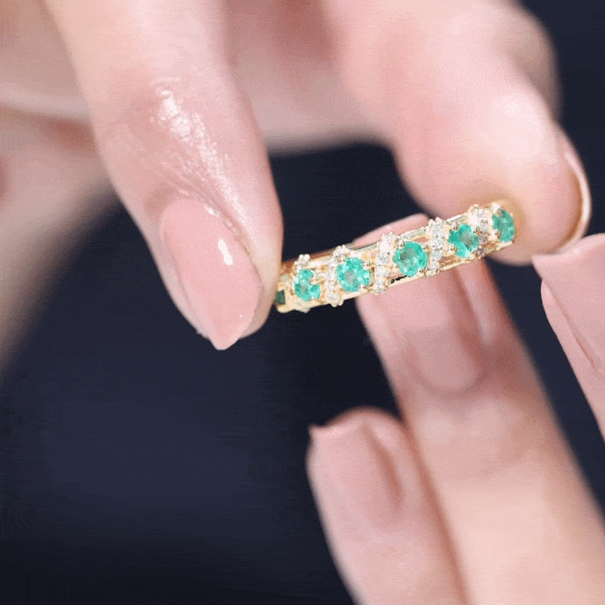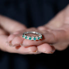Capture the essence of love and elegance with this stunning Emerald Eternity Ring. Designed to symbolize togetherness and lasting bonds, this Half Eternity Ring features a row of vibrant round cut lab created emeralds set in prong setting along the band. Between each emerald, sparkling diamond rows are carefully placed in the center, creating a beautiful contrast that enhances the brilliance and rich green color of the gemstones. The combination of glowing AAA quality emeralds and dazzling HI-SI quality diamonds gives the Wedding Anniversary Ring a timeless yet modern appeal. Its half eternity design allows the Emerald Wedding Band to shine gracefully while remaining comfortable for everyday wear. Perfect for weddings, anniversaries, or special occasions, this Emerald Band Ring is also versatile enough to be worn alongside an engagement ring or stacked with other rings for a personalized style. Its balanced design ensures it looks stunning whether worn alone or paired with other jewelry, making it a must-have piece for anyone who appreciates fine craftsmanship and timeless beauty. Thoughtfully designed and carefully crafted, this Emerald and Diamond Band Ring brings together sophistication, elegance, and meaningful symbolism.