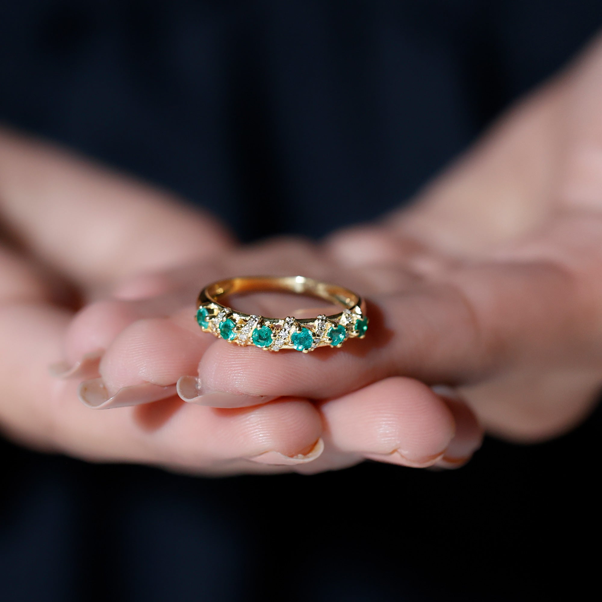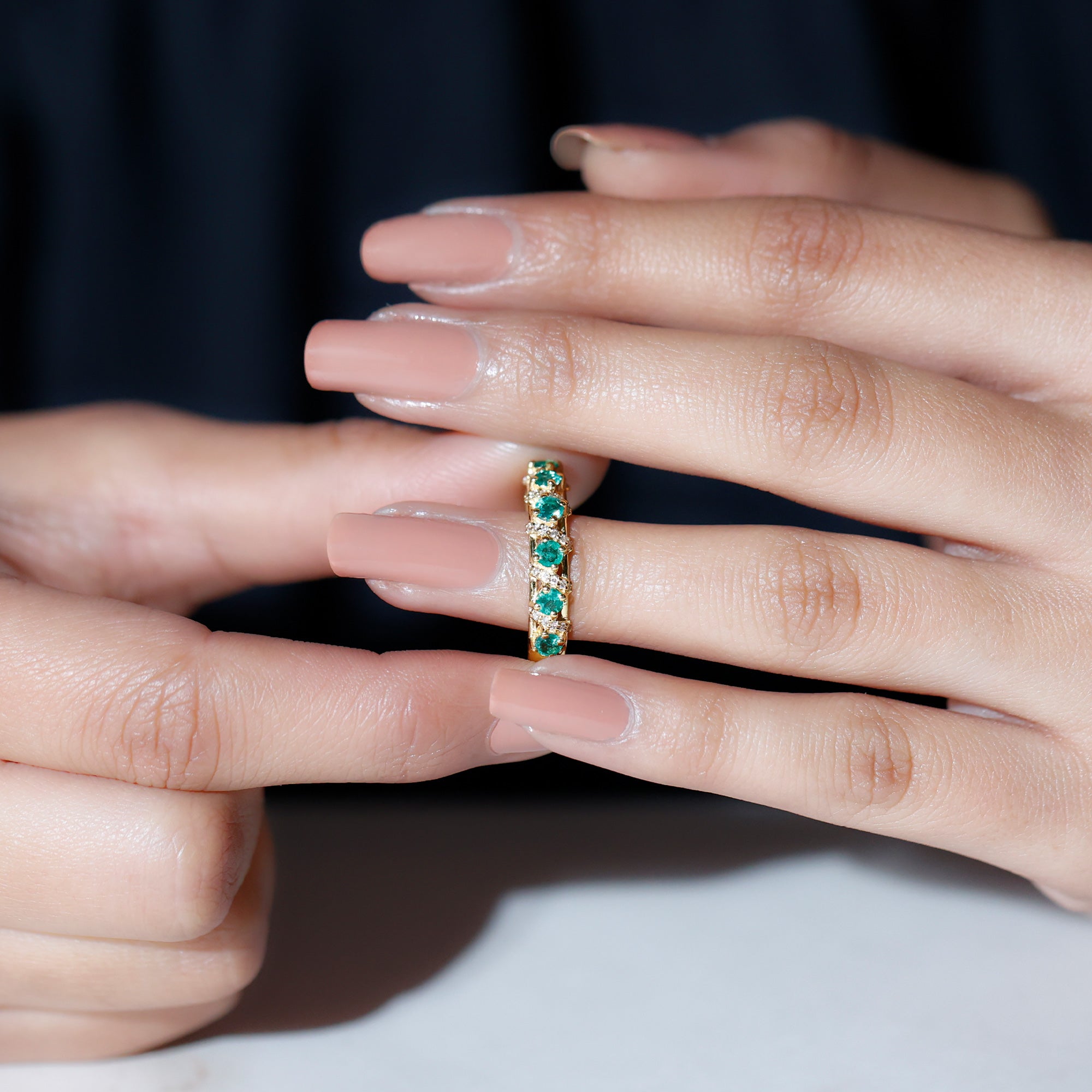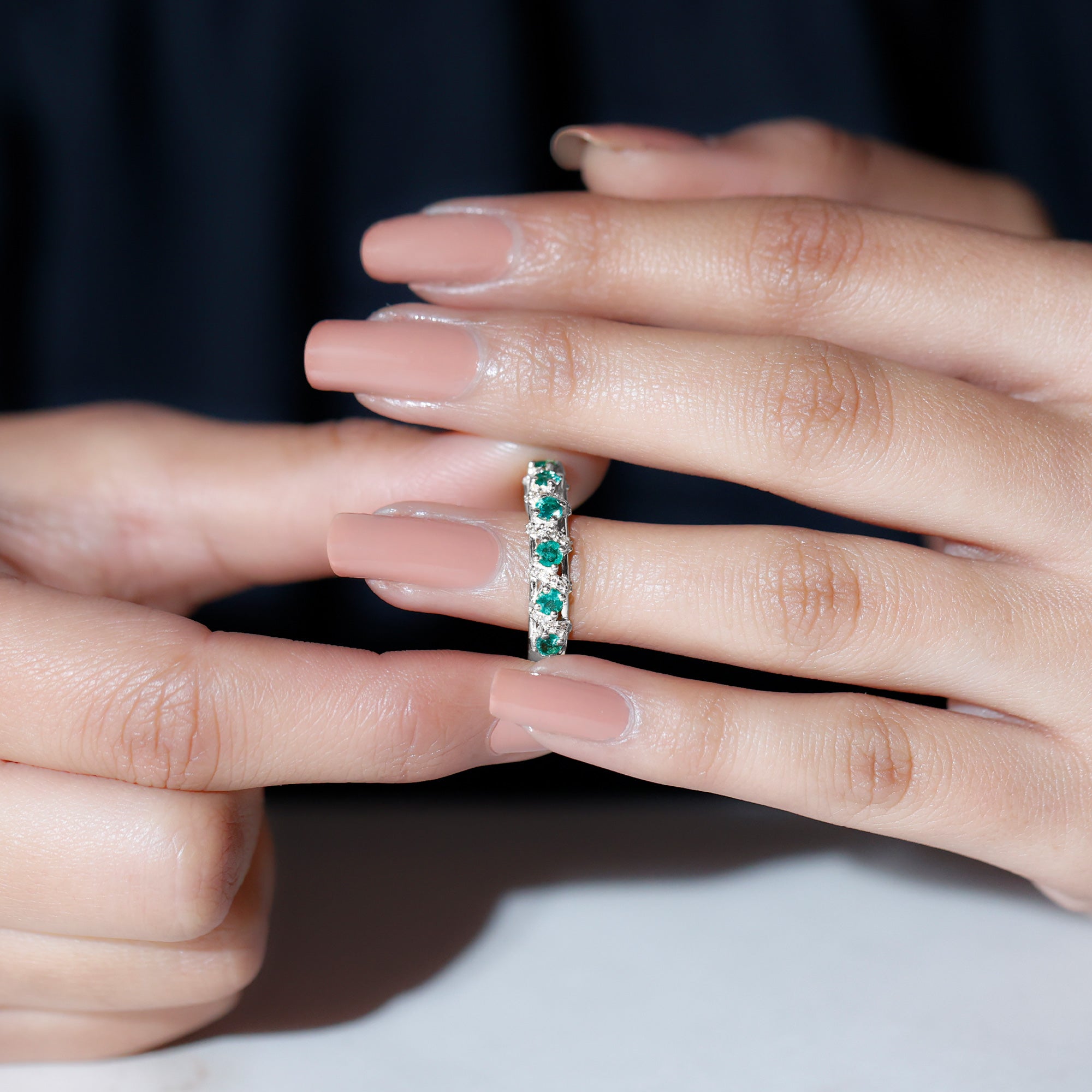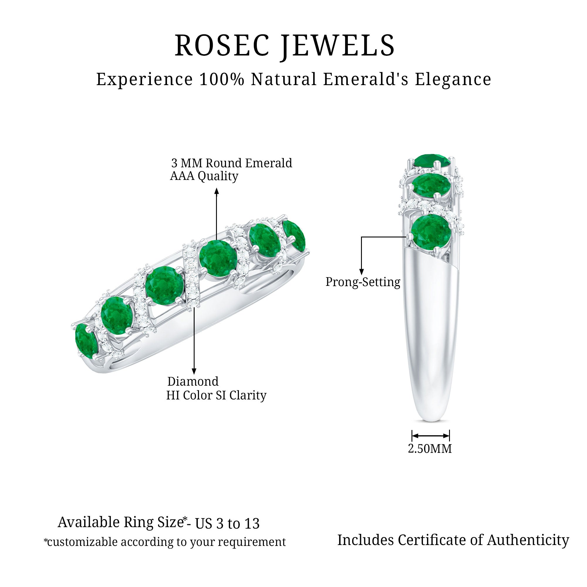 Capture the essence of love and elegance with this stunning Emerald Eternity Ring. Designed to symbolize togetherness and lasting bonds, this Half Eternity Ring features a row of vibrant round cut lab created emeralds set in prong setting along the band. Between each emerald, sparkling diamond rows are carefully placed in the center, creating a beautiful contrast that enhances the brilliance and rich green color of the gemstones. The combination of glowing AAA quality emeralds and dazzling HI-SI quality diamonds gives the Wedding Anniversary Ring a timeless yet modern appeal. Its half eternity design allows the Emerald Wedding Band to shine gracefully while remaining comfortable for everyday wear. Perfect for weddings, anniversaries, or special occasions, this Emerald Band Ring is also versatile enough to be worn alongside an engagement ring or stacked with other rings for a personalized style. Its balanced design ensures it looks stunning whether worn alone or paired with other jewelry, making it a must-have piece for anyone who appreciates fine craftsmanship and timeless beauty. Thoughtfully designed and carefully crafted, this Emerald and Diamond Band Ring brings together sophistication, elegance, and meaningful symbolism.