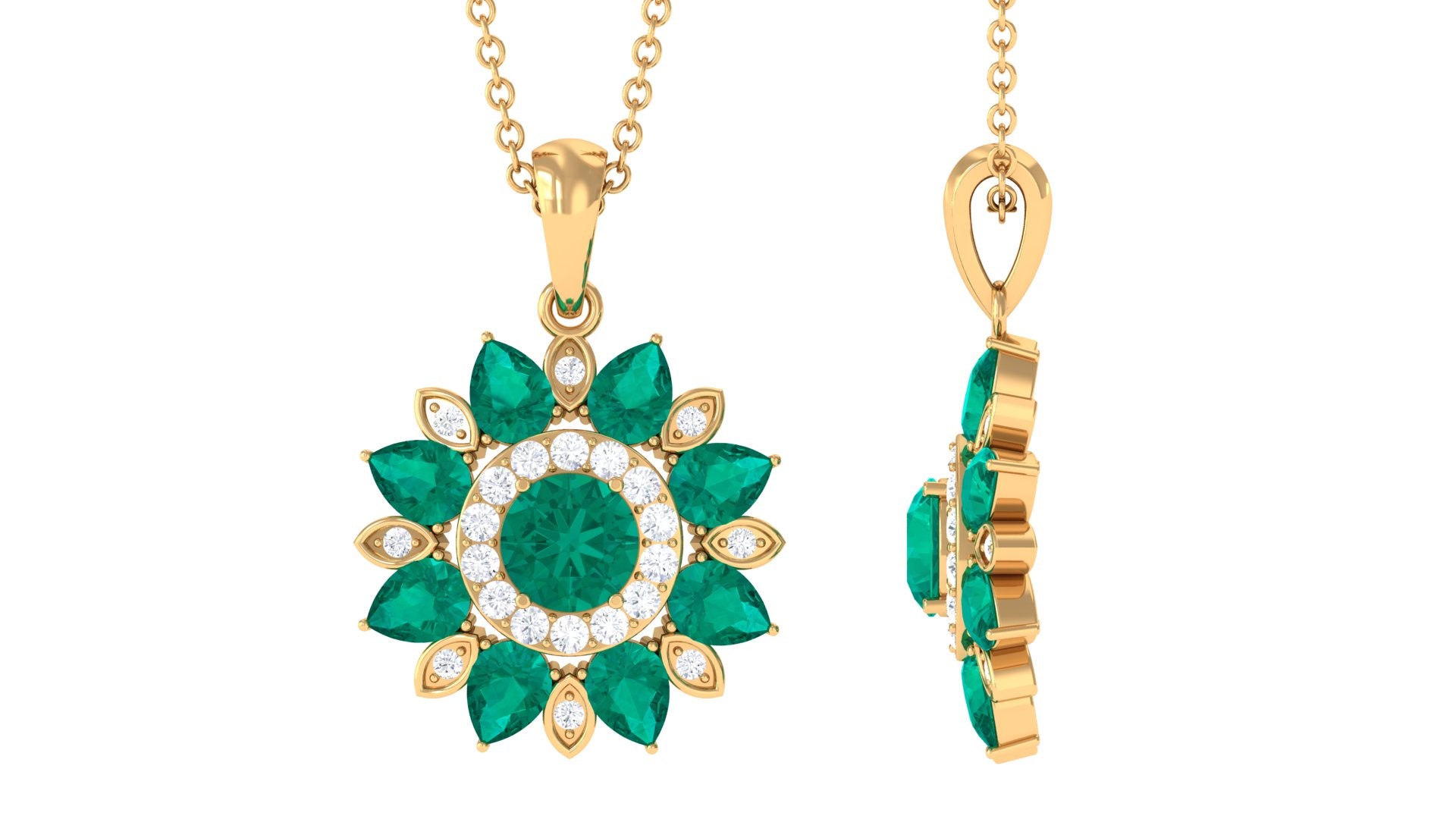 This breathtaking Floral Pendant Necklace is a mesmerizing masterpiece of elegance and sophistication. Crafted with perfection, this Pendant Necklace features Round and Pear Shape Emerald gemstones meticulously arranged in the shape of a blooming flower, accentuated by sparkling Diamond gemstones that add a touch of opulence. Elevate your style with this exquisite Emerald Pendant Necklace, showcasing natures beauty.
