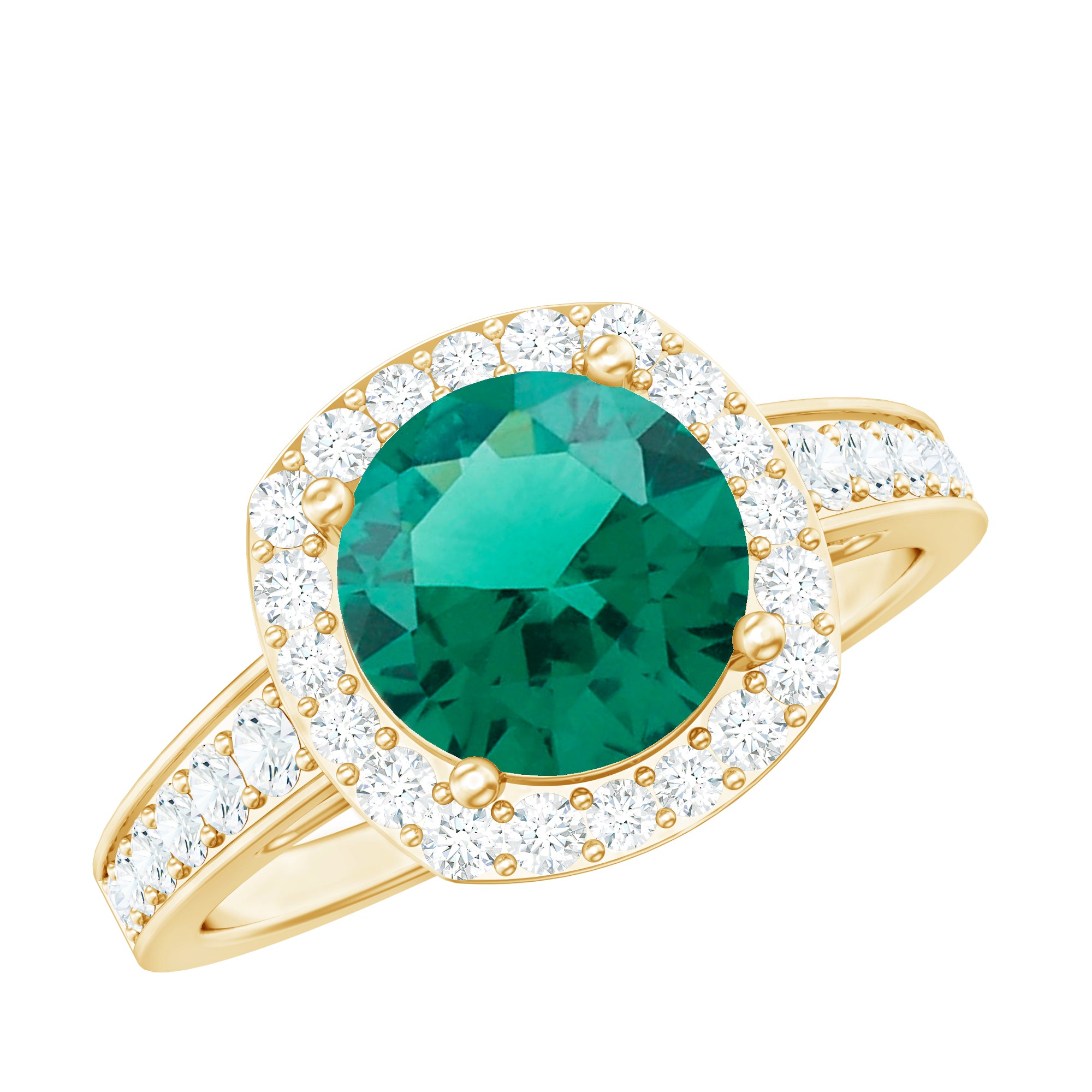 Discover the perfect blend of vintage charm and modern brilliance with this Lab Grown Emerald Engagement Ring. Designed to capture hearts, this Vintage Style Engagement Ring features a stunning 8 mm Round Lab Created Emerald, radiating a rich green hue. Surrounding the AAAA Quality Lab Emerald is a delicate Halo of sparkling Diamond, designed to amplify its color and brilliance while adding a touch of classic elegance. This Emerald Halo Engagement Ring is adorned with additional Diamond side stones, carefully placed to enhance the intricate design of the ring and create a timeless appeal. Handcrafted with meticulous attention to detail, this Lab Emerald Diamond Engagement Ring captures the romance of a bygone era while embracing today’s ethical standards. Its intricate design makes it a standout piece, perfect for the bride who cherishes history, elegance and unique style. Packaged in a Signature Jewelry Box and available in various ring sizes, this Lab Grown Emerald Ring is ready to symbolize a love that is both timeless and forward-looking, a true celebration of commitment.