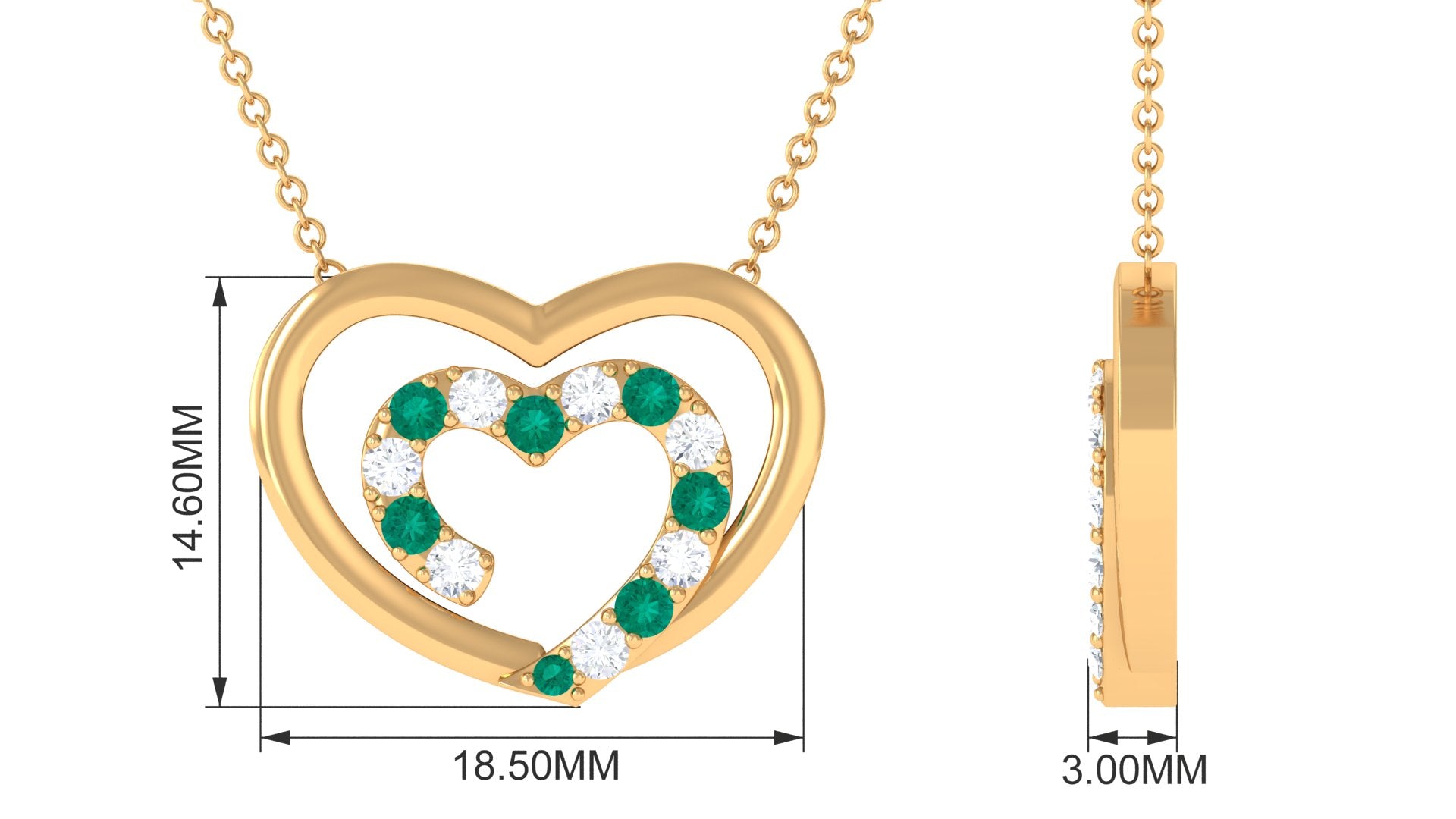 This exquisite heart necklace features twin open hearts, crafted in shimmering gold and encrusted with dazzling moissanite stones and luscious emerald gemstones. The delicate design creates a sense of elegance and romance, making this emerald necklace a perfect gift for a loved one or a cherished addition to any jewelry collection. With its exquisite craftsmanship and stunning combination of precious gems, this emerald gold necklace is sure to impress.