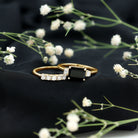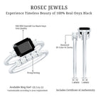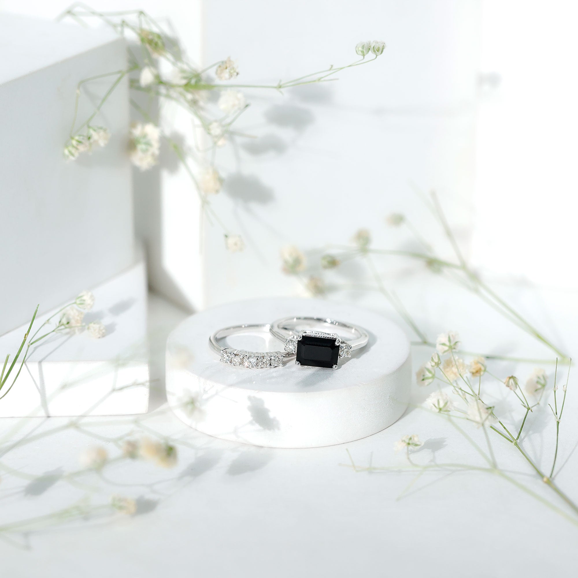 This striking Black Onyx Bridal Ring Set combines boldness and elegance, perfect for those who want something unique yet timeless. At its heart is a 6X8 MM emerald cut Black Onyx, set sideways in an east-west style that adds a modern twist to a classic shape. The horizontal placement of the onyx draws attention to its deep, rich color and makes the design stand out. Flanking the center stone are two smaller round real diamonds, adding just the right amount of sparkle to balance the strong presence of the onyx. The sparkling wedding band features five round diamonds arranged closely together, designed to fit perfectly alongside the engagement ring. The mix of bold Black Onyx and sparkling diamonds creates a fresh and meaningful combination, ideal for couples looking for an Engagement Ring with Wedding Band that reflects their unique bond. Crafted with care, this set blends modern design with timeless charm. It is perfect for those who want their jewelry to tell a story of strength, love, and individuality. This Black Onyx Wedding Ring Set is more than just a beautiful accessory, it is a symbol of your lasting commitment and personal style.