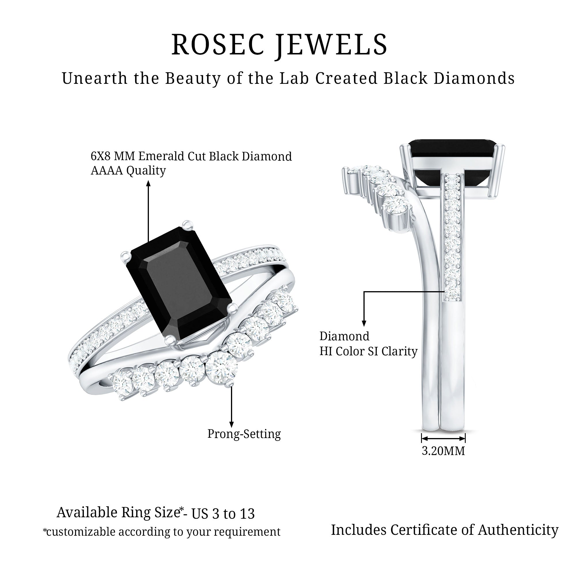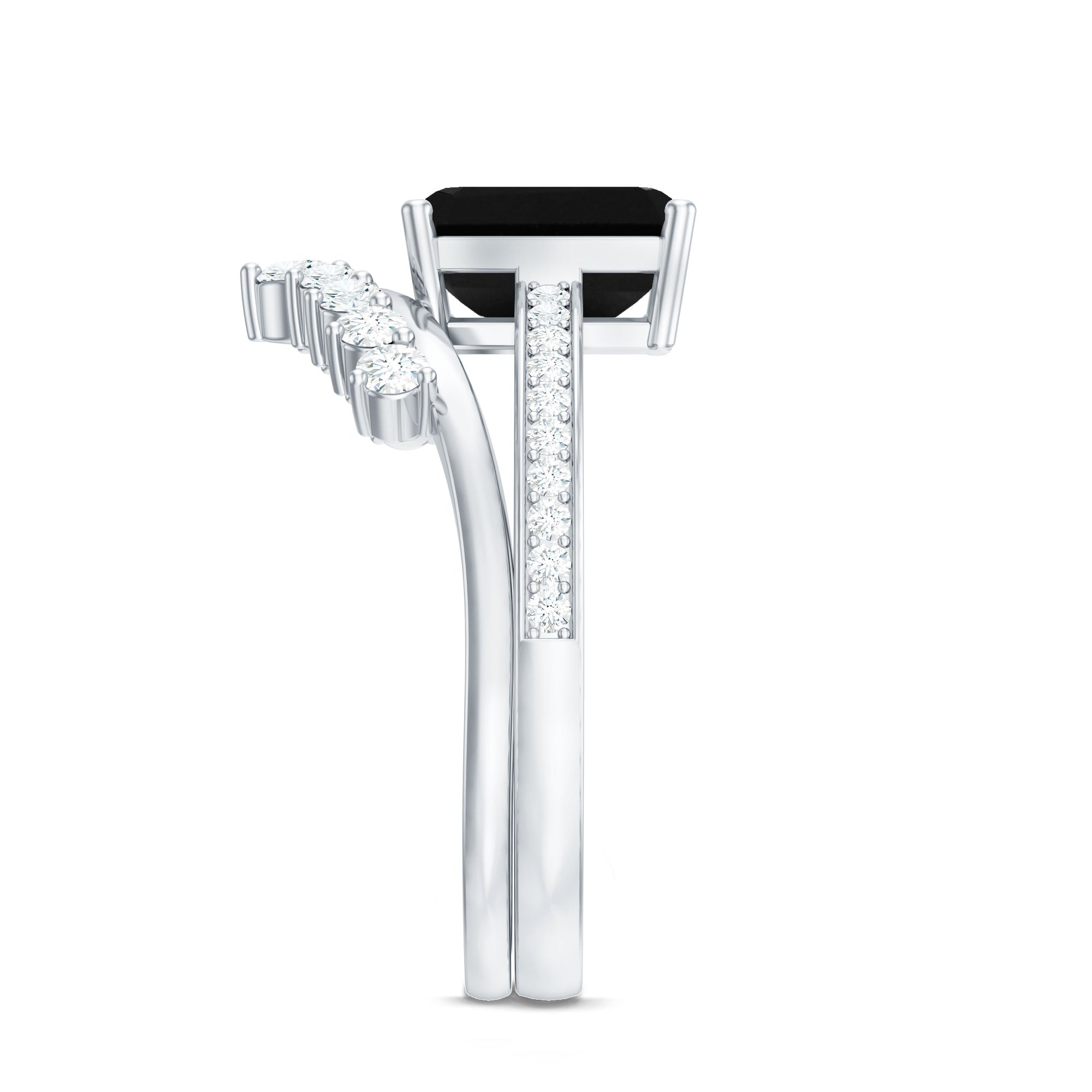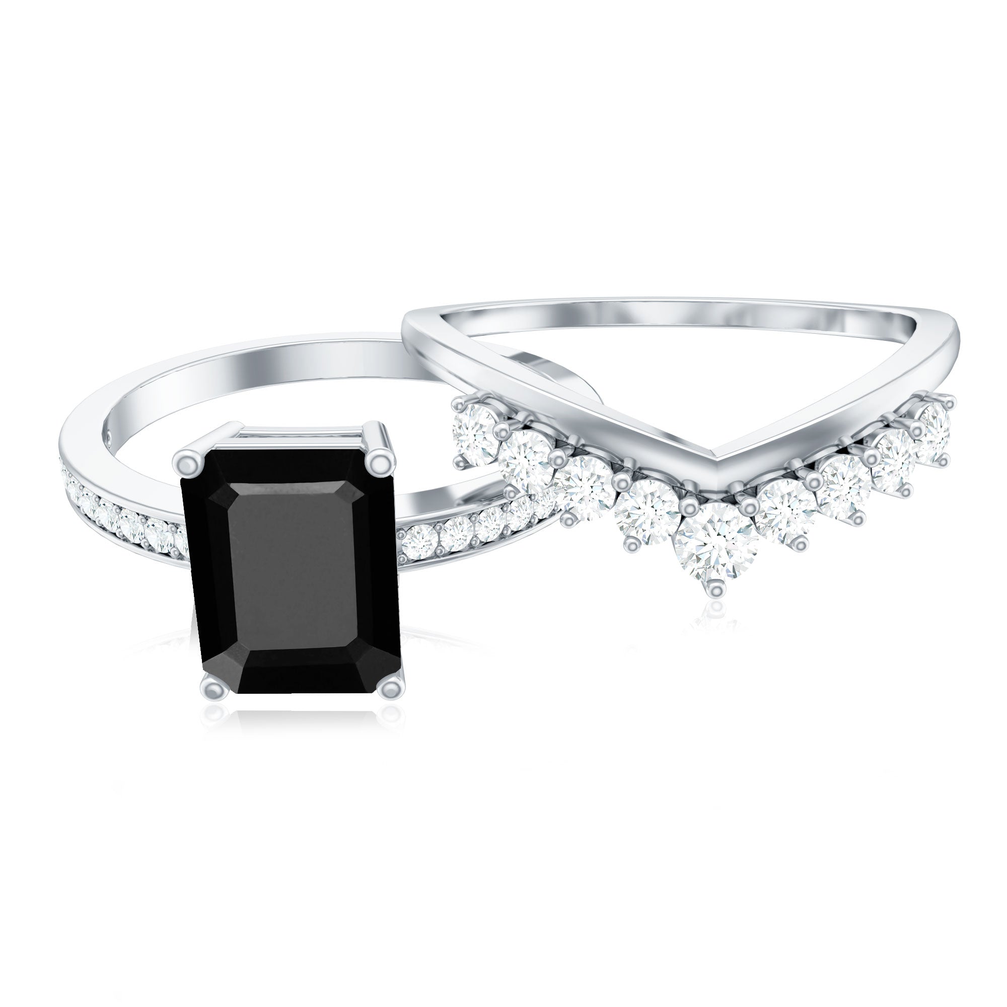 The splendid and unique Engagement Ring Set features an Emerald Cut Lab Created Black Diamond secured in 4 Prong Setting while dainty Round Diamonds add the right touch of sparkle. While Round Shape Diamonds studded on the enhancer ring. This Created Black Diamond Ring Set will complement her beautiful dress on her big day and will make her stand out from the crowd.