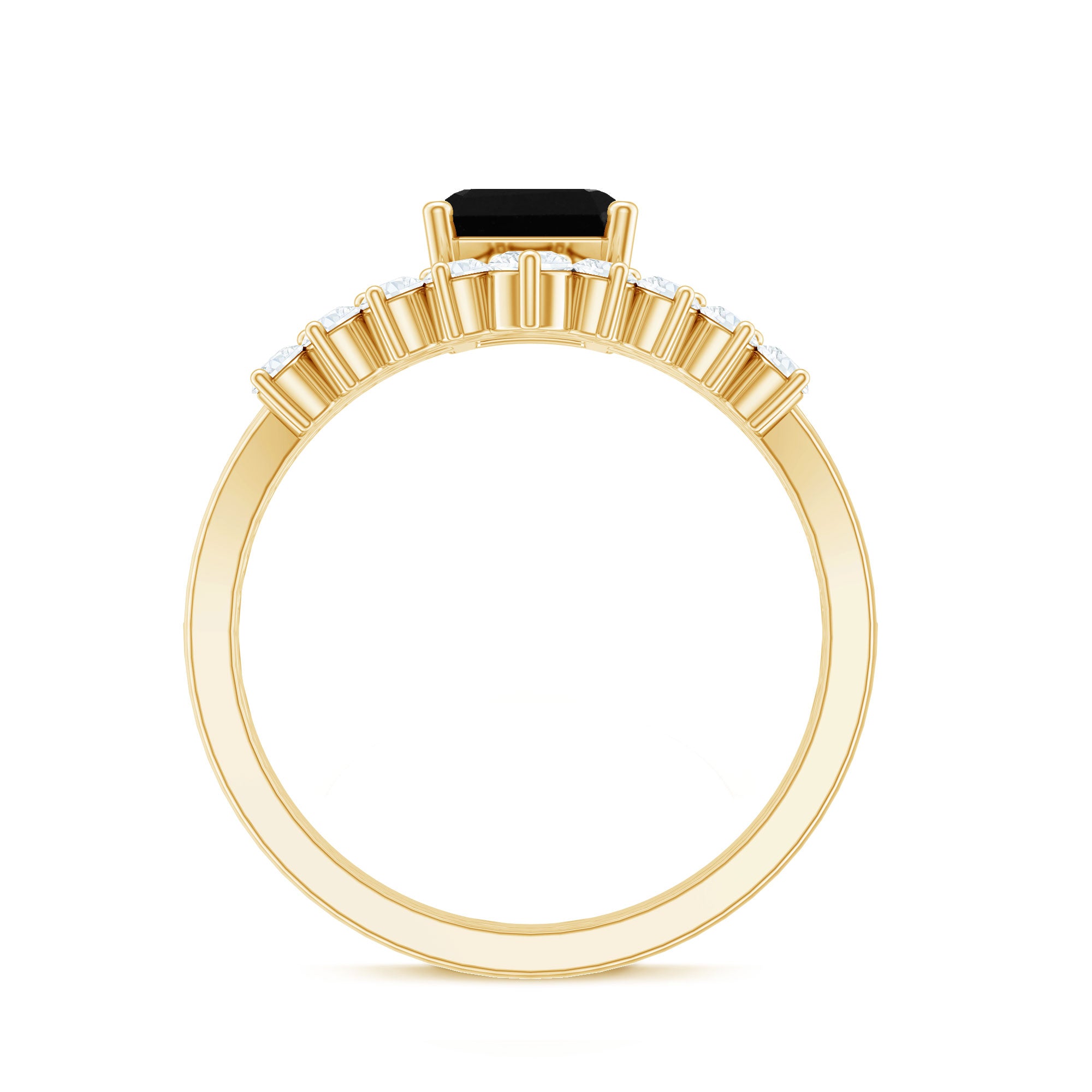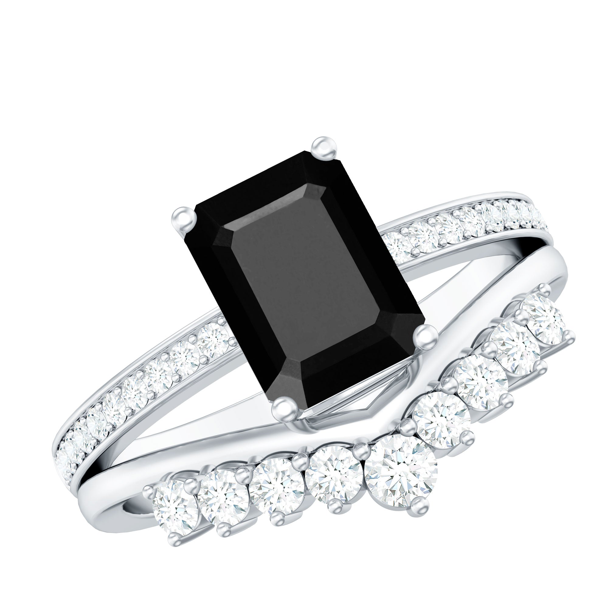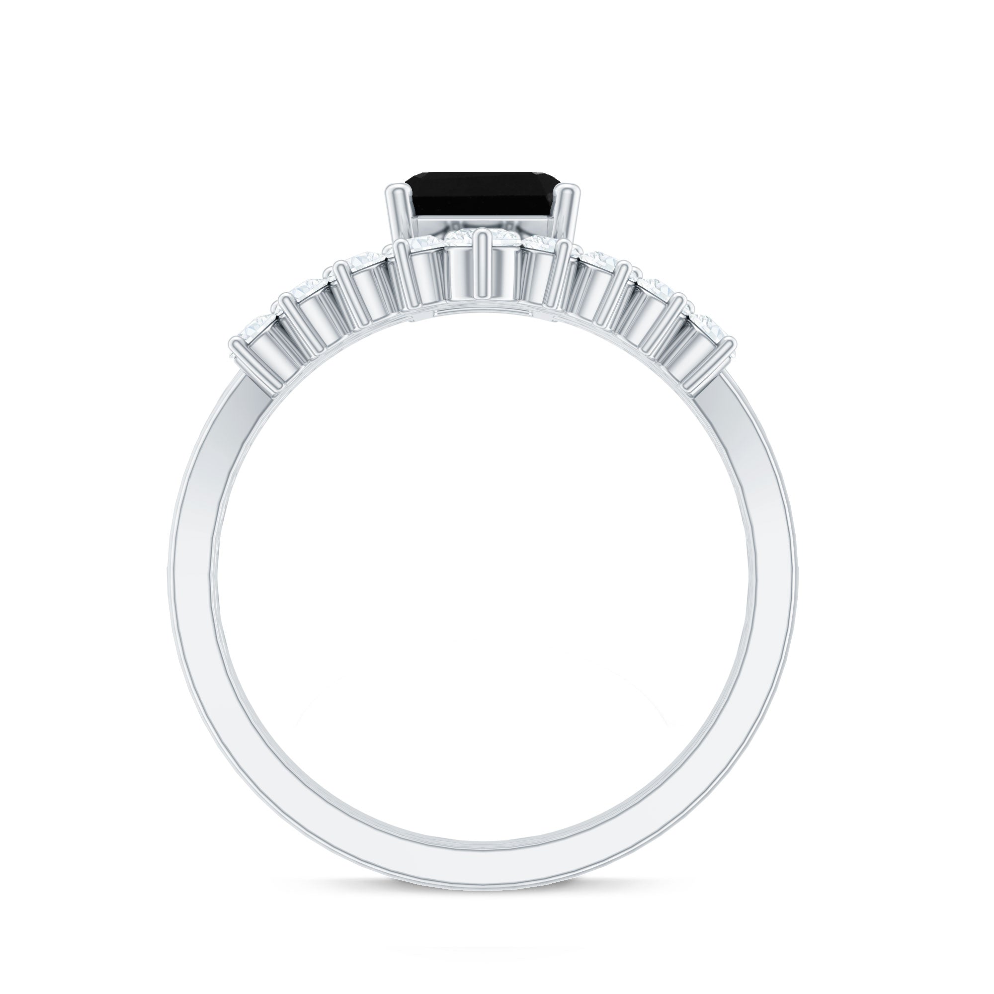 The splendid and unique Engagement Ring Set features an Emerald Cut Lab Created Black Diamond secured in 4 Prong Setting while dainty Round Diamonds add the right touch of sparkle. While Round Shape Diamonds studded on the enhancer ring. This Created Black Diamond Ring Set will complement her beautiful dress on her big day and will make her stand out from the crowd.