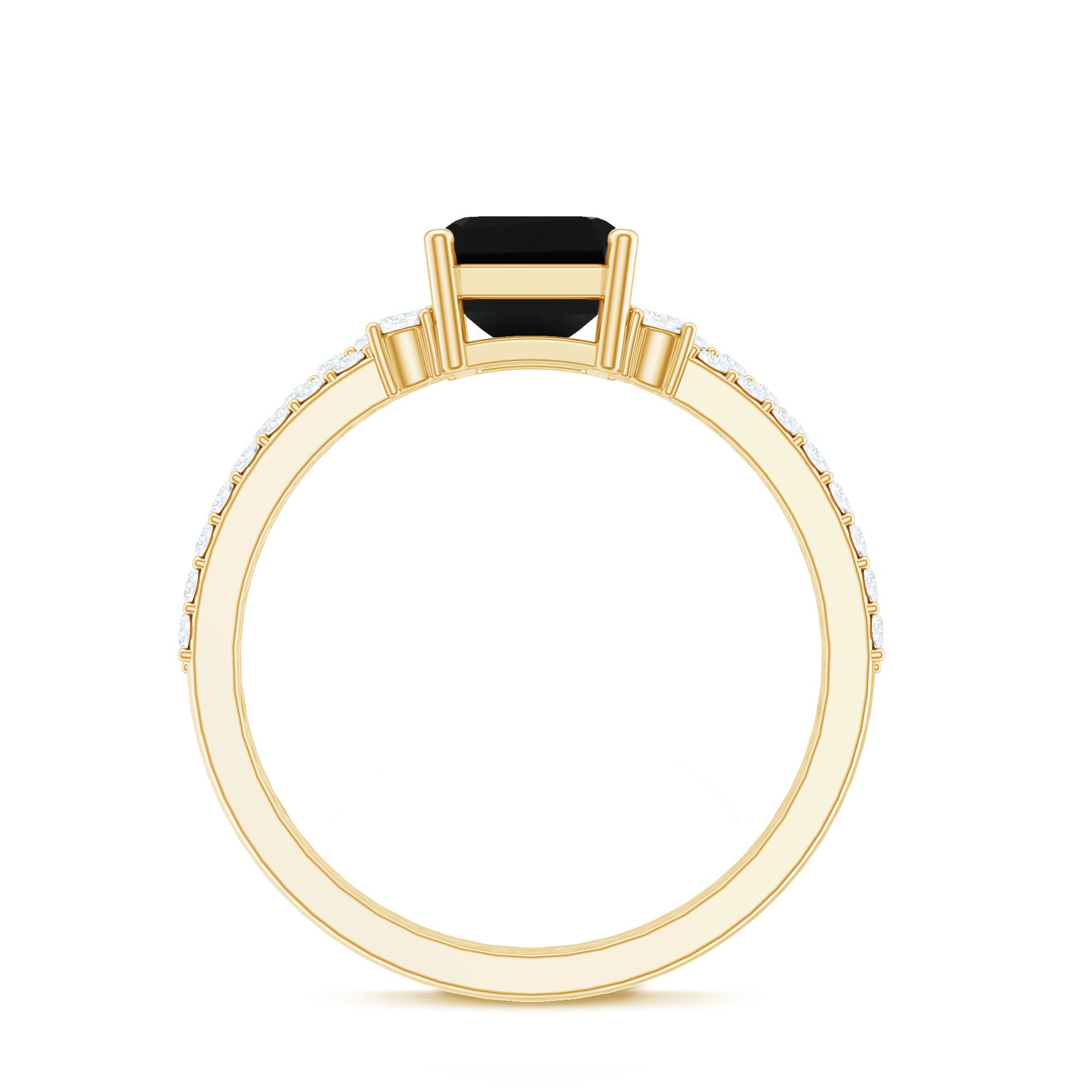 The stunning Engagement Ring Set features Emerald Cut Lab Created Black Diamond secured in 4 Prong Setting while dainty Round Shape Diamonds studded on the shank. This Created Black Diamond Ring Set will surely steal the spotlight of any event when paired with everyday or party attires.