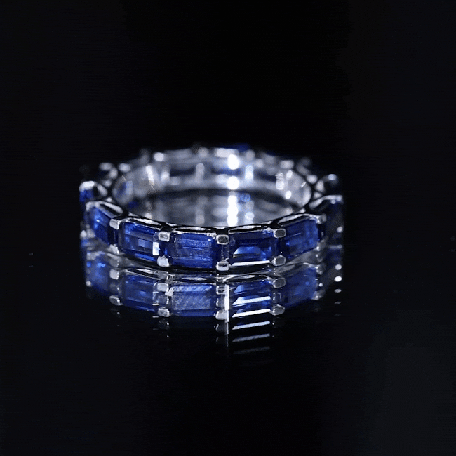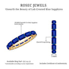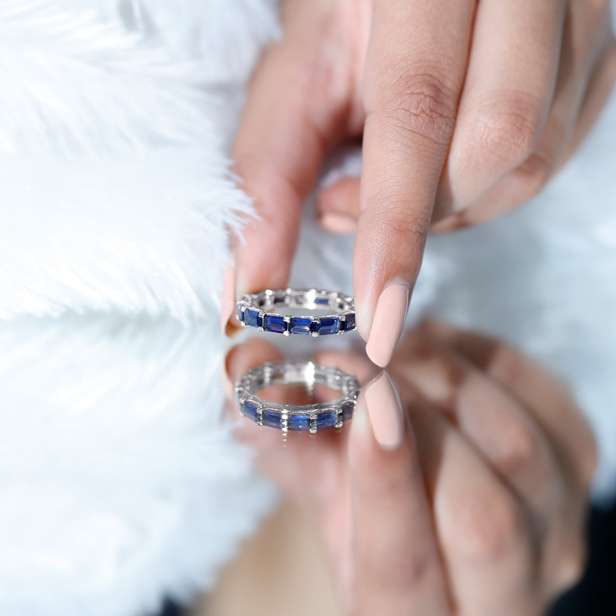 Radiate beauty and sophistication with this stunning Lab Created Blue Sapphire Ring, designed to shimmer in the light. Featuring an Octagon Cut Lab Created Blue Sapphire set in a Shared Prong Setting on a Full Eternity Ring, this piece of jewelry is truly exquisite. Crafted with Solid Gold, this East West Band Ring adds a touch of elegance and class to any outfit. Dont miss out on the opportunity to own this beautiful ring.