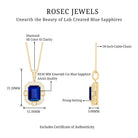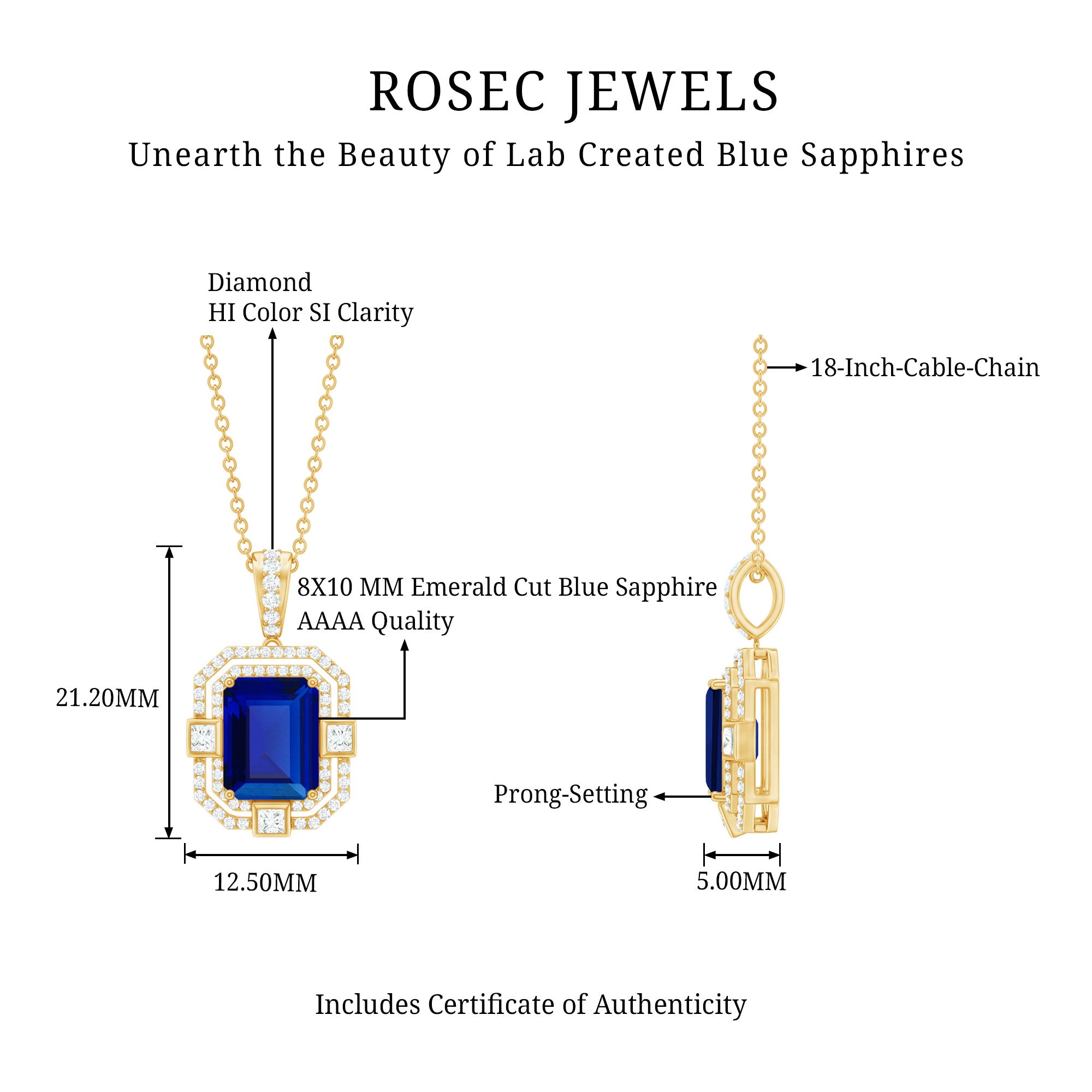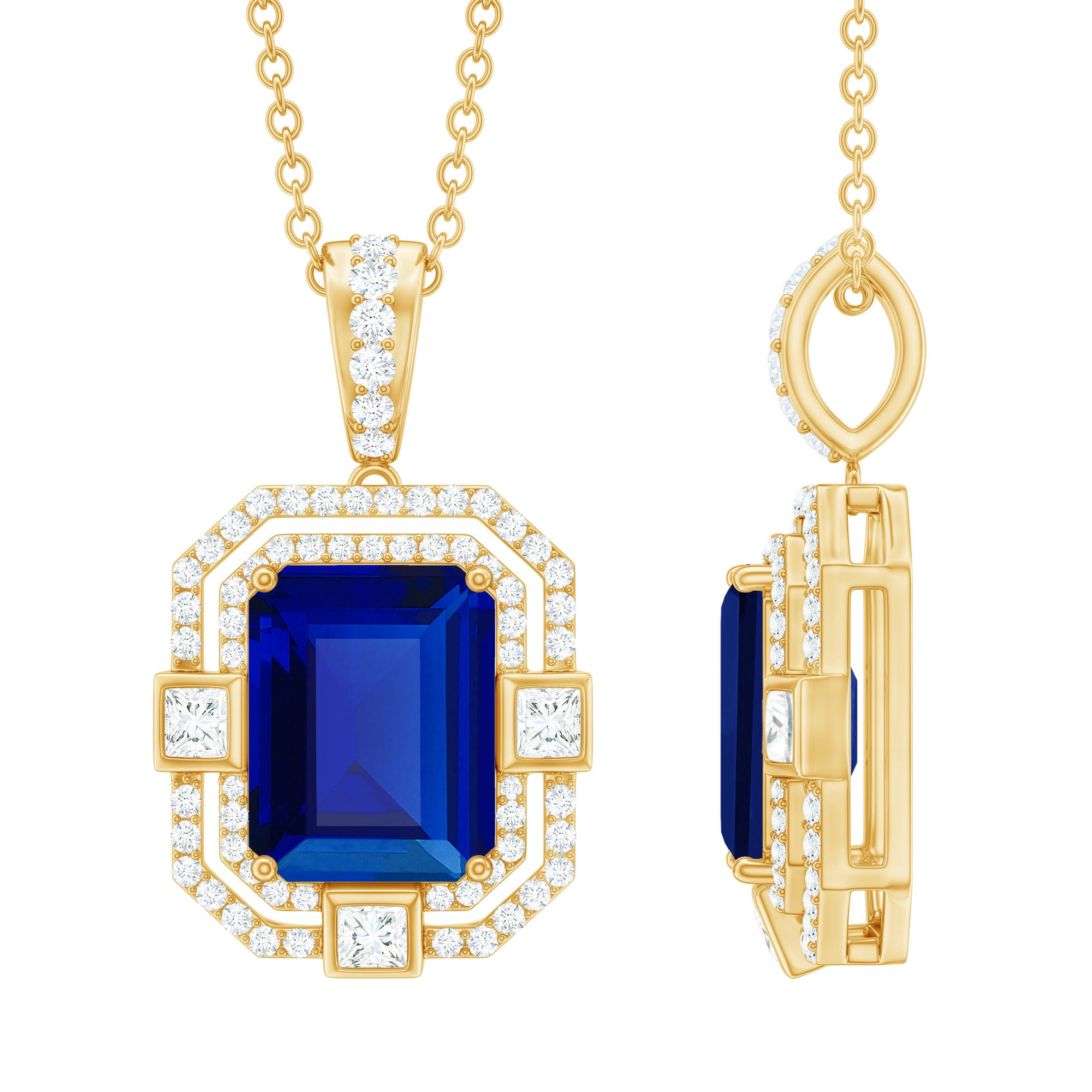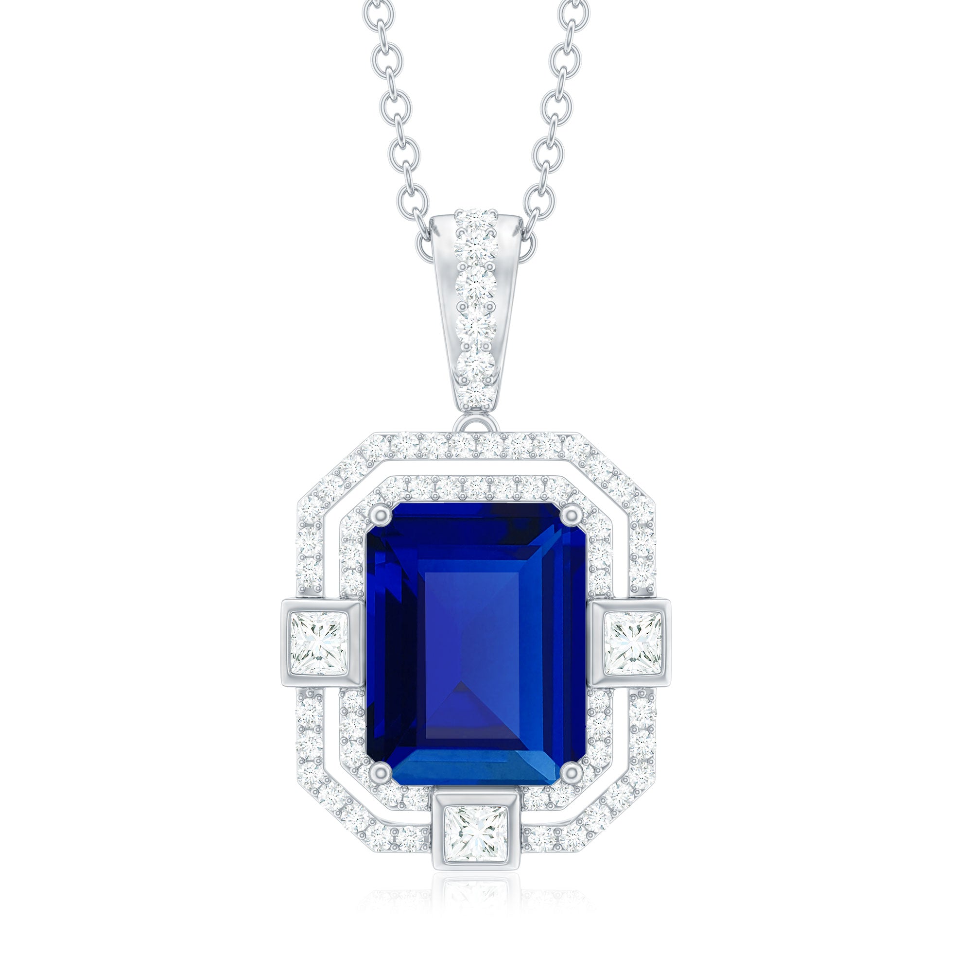 Emerald Cut Created Blue Sapphire Vintage Pendant Necklace with Diamond