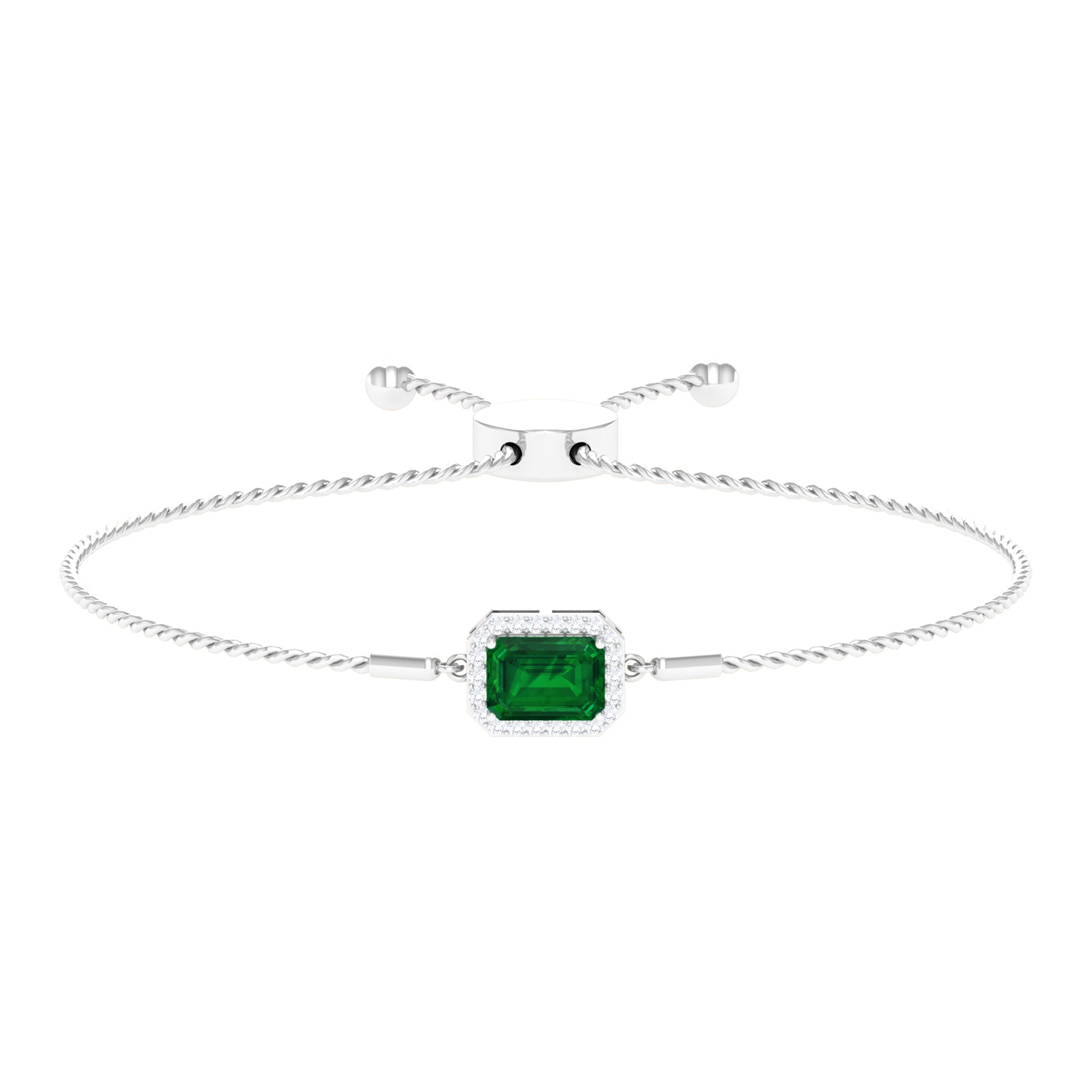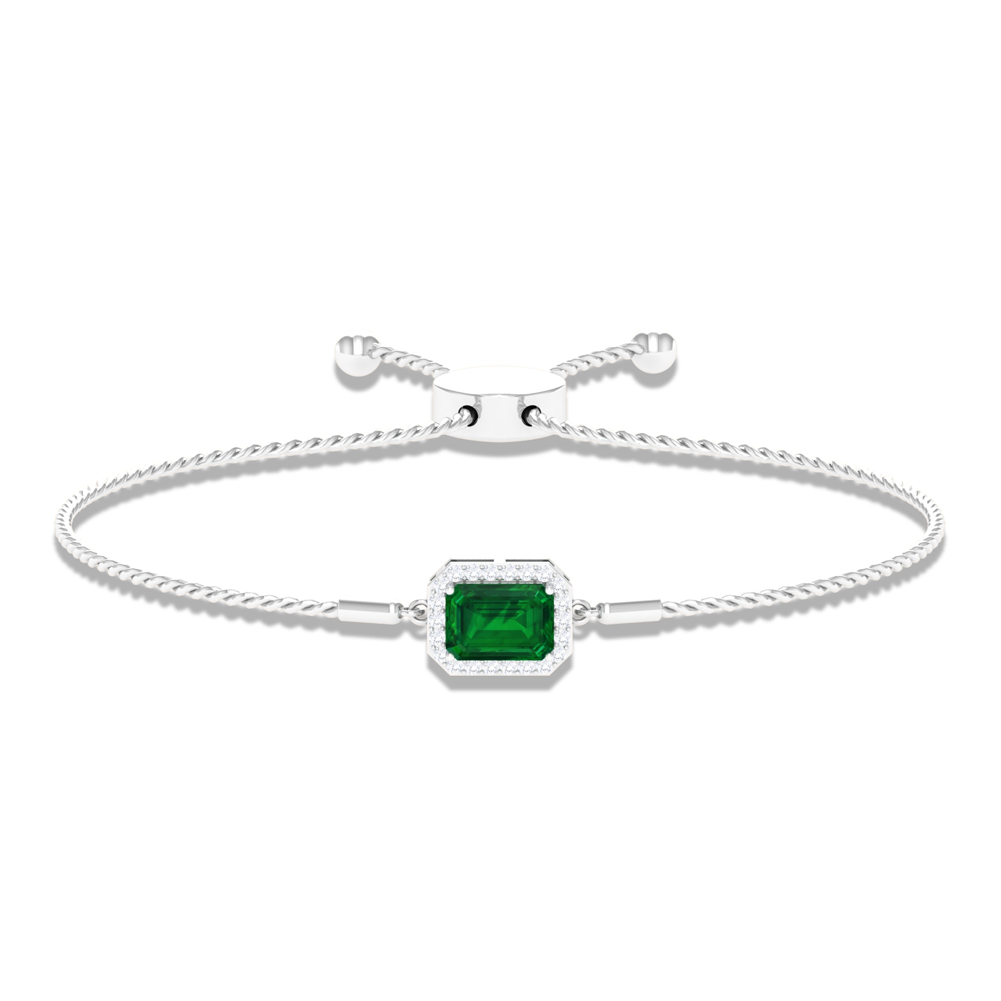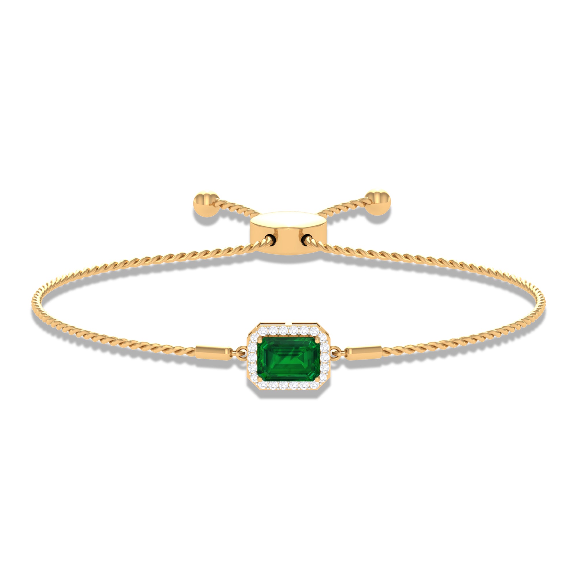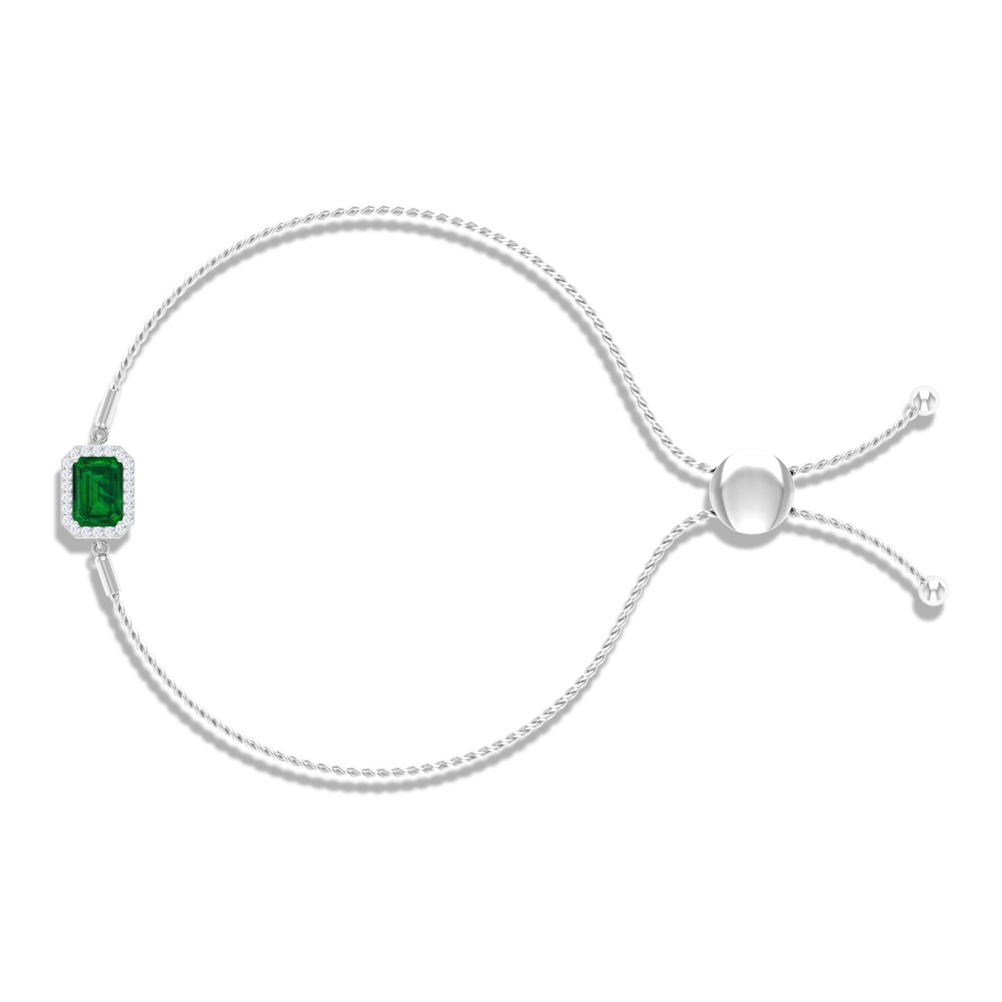 Designed for those who cherish elegance, the Lab Grown Emerald Bracelet radiates grace, luxury, and allure with every detail. Embellished with a 6X8 MM emerald cut lab created emerald, set securely in prong setting. Surrounding the main gem, a delicate halo of sparkling round diamonds amplifies its brilliance, creating a luminous contrast that draws the eye effortlessly. The adjustable bolo chain of the Emerald Cut Bracelet ensures a secure and comfortable fit while offering versatility for layered styling or standalone glamour. Crafted with meticulous attention to detail, this Halo Chain Bracelet exudes refined luxury while remaining versatile enough for both daytime elegance and evening sophistication. Perfect for birthdays, anniversaries, weddings, or any special occasion, this Emerald and Diamond Bracelet is a thoughtful way to celebrate someone dear or indulge yourself with lasting beauty. The fusion of the string chain design with the enchanting brilliance of HI-SI quality diamonds and the striking AAAA quality lab made emerald ensures this piece becomes a cherished treasure in any jewelry collection.