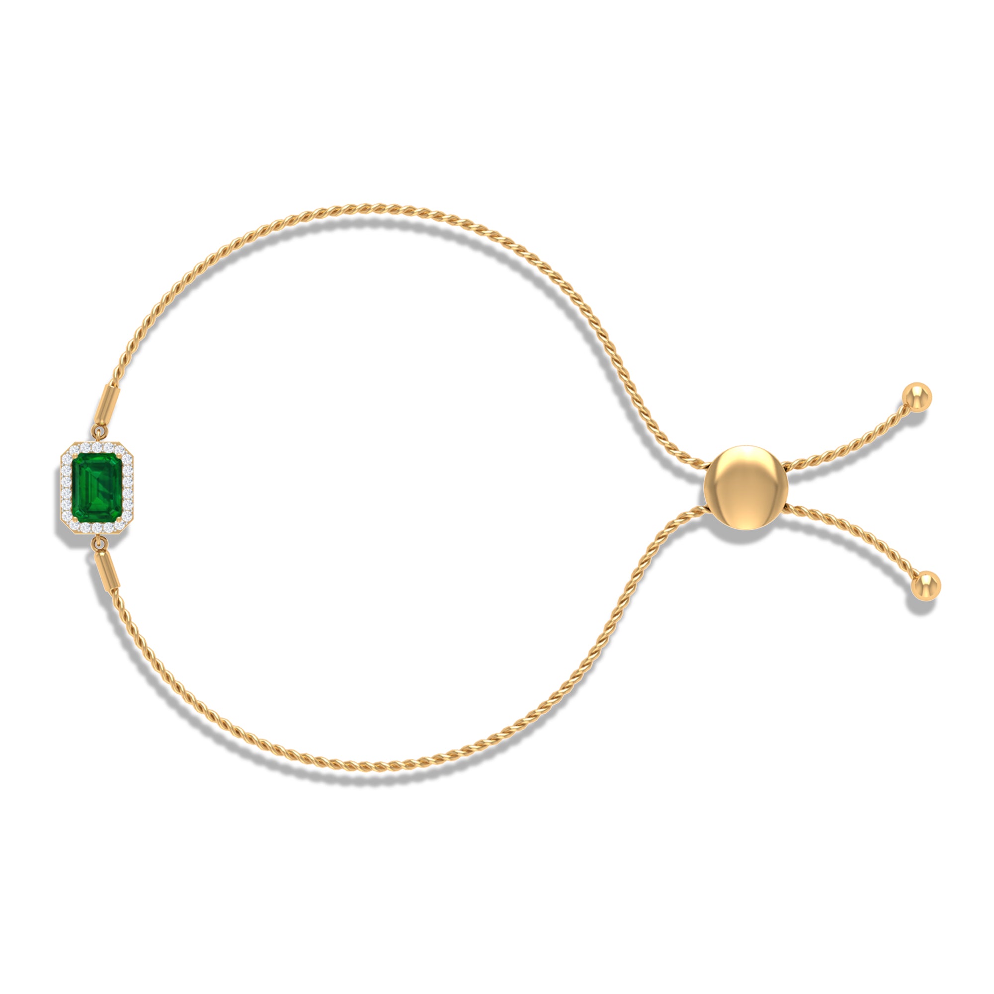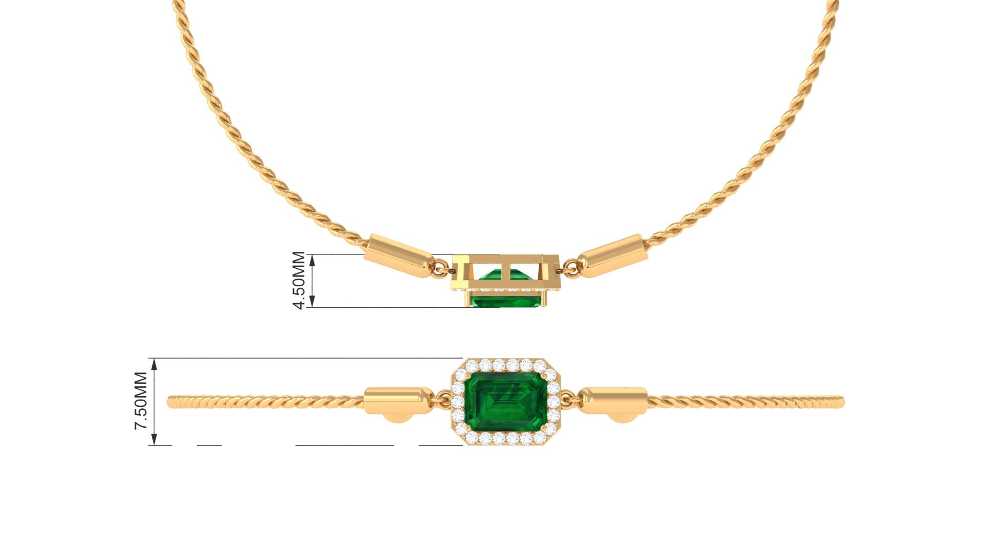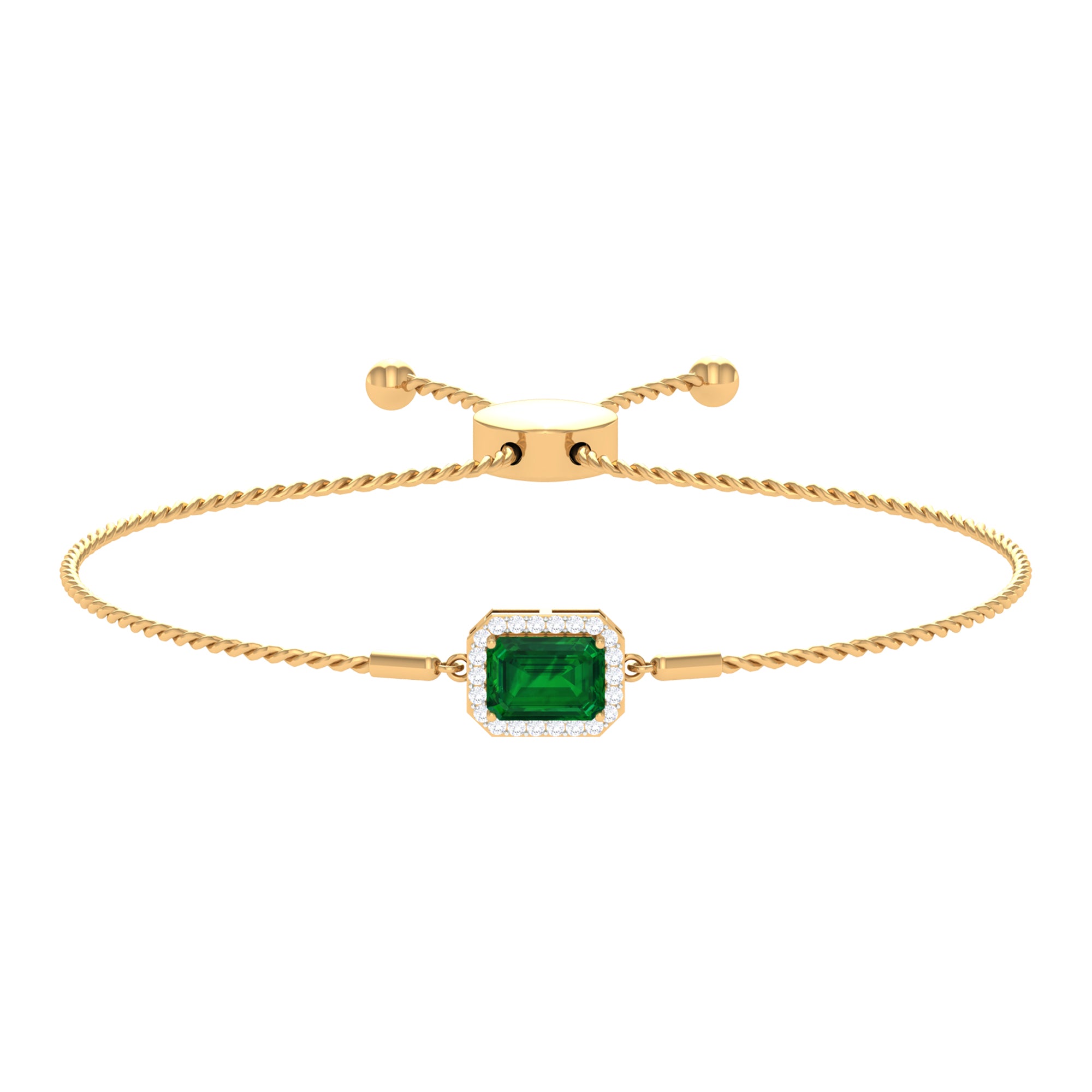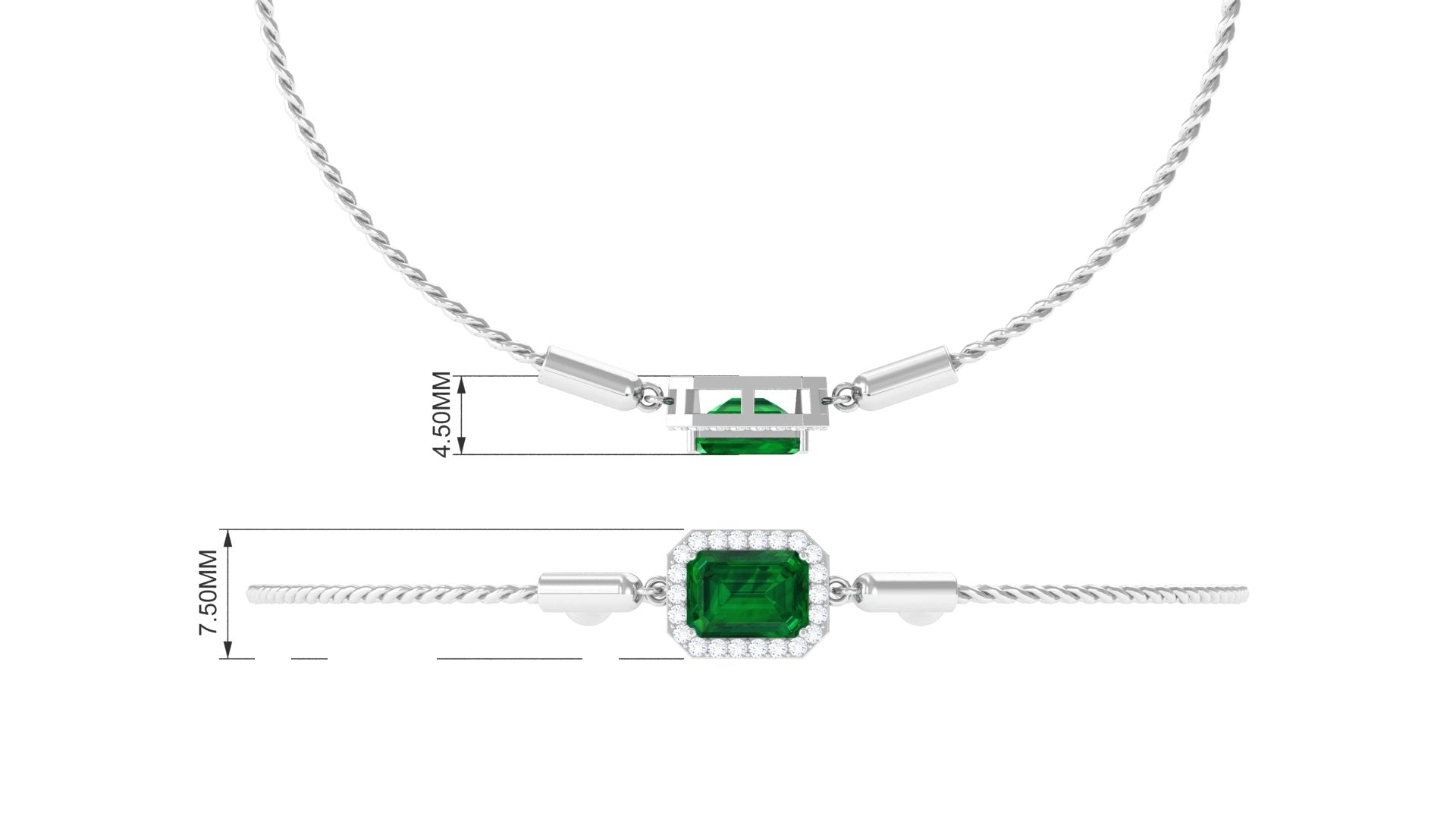 Designed for those who cherish elegance, the Lab Grown Emerald Bracelet radiates grace, luxury, and allure with every detail. Embellished with a 6X8 MM emerald cut lab created emerald, set securely in prong setting. Surrounding the main gem, a delicate halo of sparkling round diamonds amplifies its brilliance, creating a luminous contrast that draws the eye effortlessly. The adjustable bolo chain of the Emerald Cut Bracelet ensures a secure and comfortable fit while offering versatility for layered styling or standalone glamour. Crafted with meticulous attention to detail, this Halo Chain Bracelet exudes refined luxury while remaining versatile enough for both daytime elegance and evening sophistication. Perfect for birthdays, anniversaries, weddings, or any special occasion, this Emerald and Diamond Bracelet is a thoughtful way to celebrate someone dear or indulge yourself with lasting beauty. The fusion of the string chain design with the enchanting brilliance of HI-SI quality diamonds and the striking AAAA quality lab made emerald ensures this piece becomes a cherished treasure in any jewelry collection.