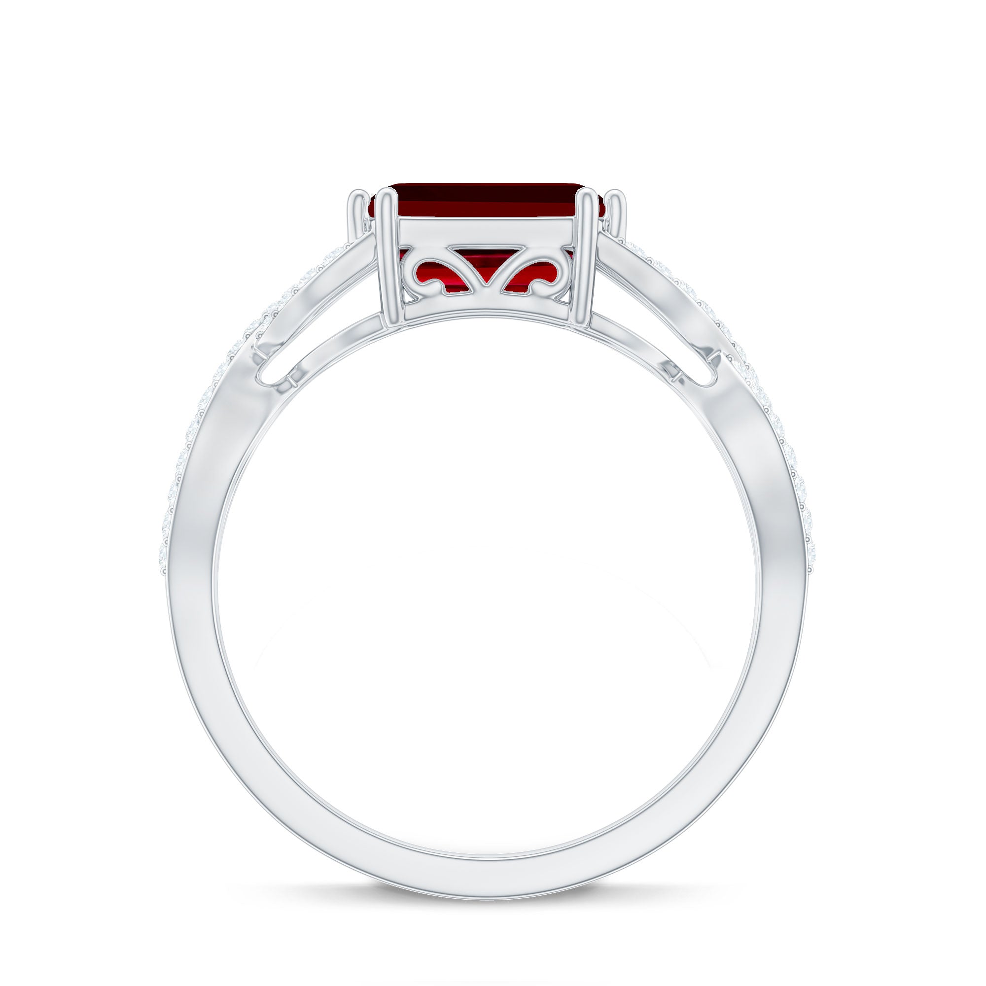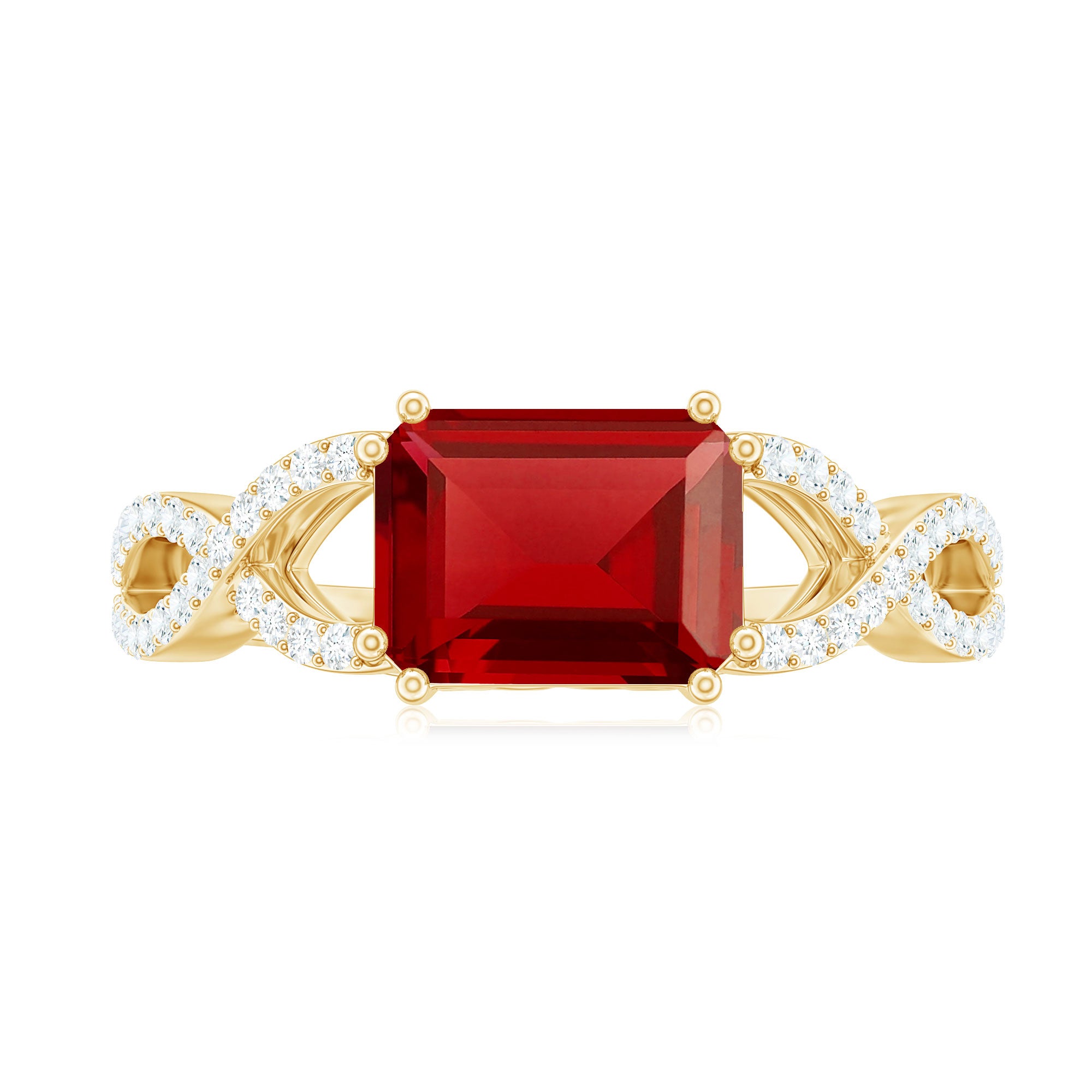 Introducing a stunning Designer Created Ruby Engagement Ring to enhance your beauty with its captivating bright red hue. Featuring an exquisite Emerald Cut Created Ruby gemstone set as a solitaire in an East-West style and embellished with Diamond on a Gold Crossover Shank, this Solitaire Ring is the perfect choice for your lovely lady.