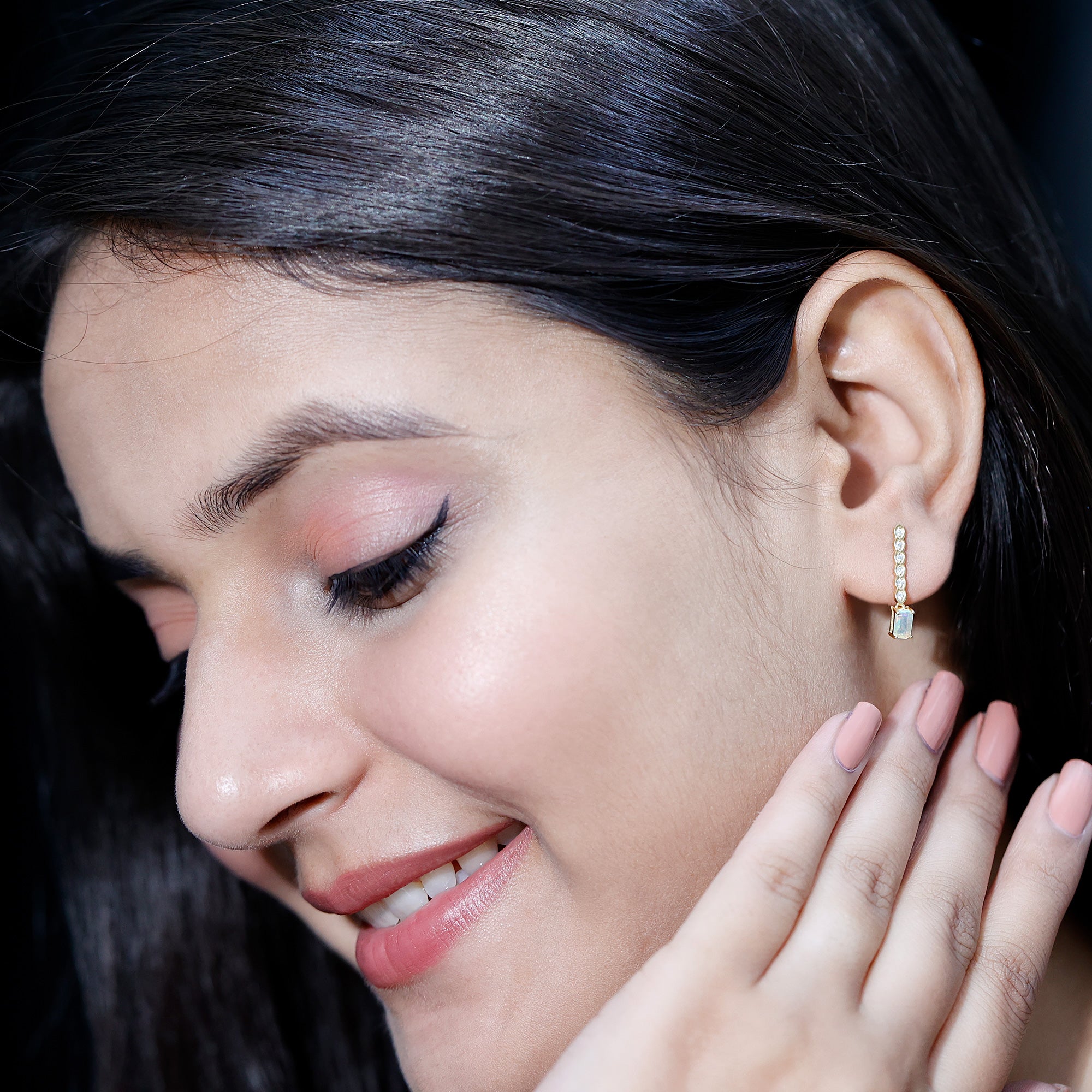 Add a graceful glow to your every moment with these elegant Ethiopian Opal Earrings, a refined balance of color, charm, and classic design. Crafted in 14k yellow gold plated silver, these Drop Earrings feature a stunning 3X5 MM emerald cut Ethiopian opal as the centerpiece. Above the opal, a vertical row of dainty round cut lab grown diamonds adds just the right amount of sparkle. Ethiopian Opals are known for their captivating play of colors and rich symbolism. They are the official birthstone of October, making these Minimalist Earrings a meaningful gift for October born women or anyone drawn to their magical shimmer. The contrast between the fiery opal and the brilliant diamonds results in a visual harmony that is luxurious yet lightweight. Whether you are dressing up for a romantic dinner, marking a birthday, or looking for a unique accessory with a deeper story, these Opal and Diamond Earrings offer effortless elegance with an eco-conscious twist. The secure screw-back ensures they stay comfortably in place while making a lasting impression. A beautiful fusion of natural beauty and mindful craftsmanship, these October Birthstone Earrings are a subtle celebration of femininity and individuality. Gift-ready and made to be treasured, they are a radiant expression of personal style and grace, perfect for life’s everyday sparkle or once-in-a-lifetime moments.