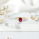 Start your forever story with a ring that speaks louder than words. Thoughtfully designed and full of timeless charm, this Lab Created Ruby Promise Ring is a beautiful way to celebrate love, commitment, or any meaningful milestone. Crafted in 14K yellow gold plated silver, it brings together elegance, craftsmanship, and a hint of bold expression. At the center of this ring is a 4X6 MM emerald cut lab created ruby, set in prong setting that holds the gemstone securely. On either side of the center stone, you will find a graceful trio of round and marquise cut lab grown diamonds that subtly catch the light and enhance the overall brilliance of the piece. The band is smooth and comfortable for daily wear, yet it makes enough of a statement to stand out on special occasions. With AAAA quality ruby and EF-VS quality lab created diamonds, this Pre Engagement Ring shows its ethical sourcing. Each detail, from the emerald shape to the flawless trop design, has been crafted with love and precision. Whether you are proposing, gifting, or celebrating your own journey, this Ruby and Diamond Ring is a symbol of strength, love, and new beginnings. Its design is heartfelt, timeless, and made to be treasured.