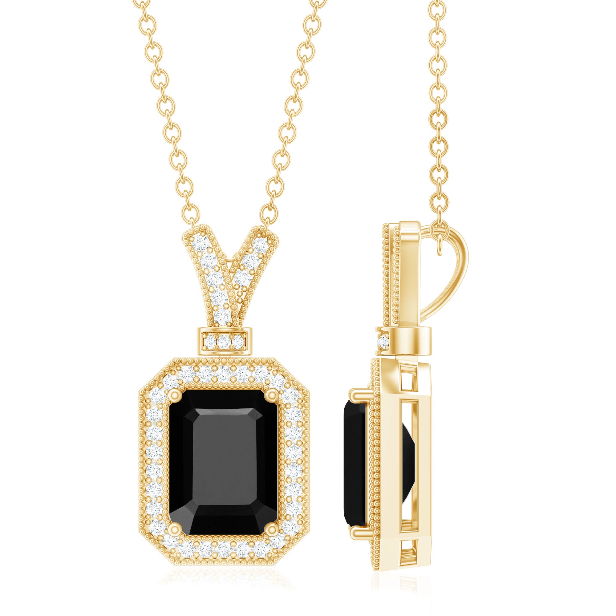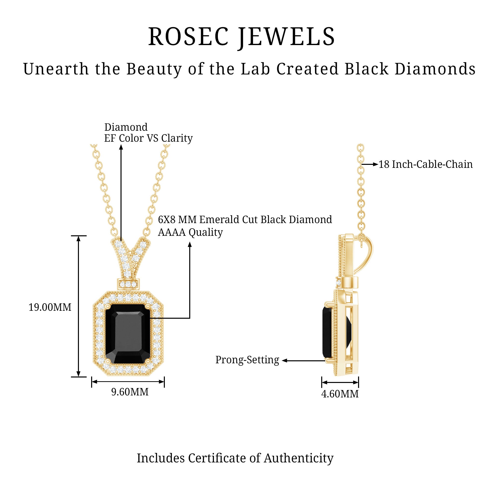 Meticulously crafted, this lab grown Black and White Diamond Necklace epitomizes timeless elegance. The 6x8 mm Emerald Cut Black Diamond takes center stage, exuding sophistication and allure. Encircled by a dazzling Halo of round shaped White Diamond gemstones and Beaded Detailing the Halo Pendant exudes luxury and modernity. This Black Diamond Pendant Necklace (Unnatural) is a testament with Aaaa Quality Black Diamond and Ef-Vs Quality Diamond which reflects the essence of Rosec Jewels dedication to both style and conscience.