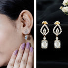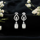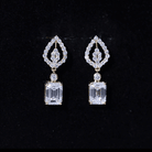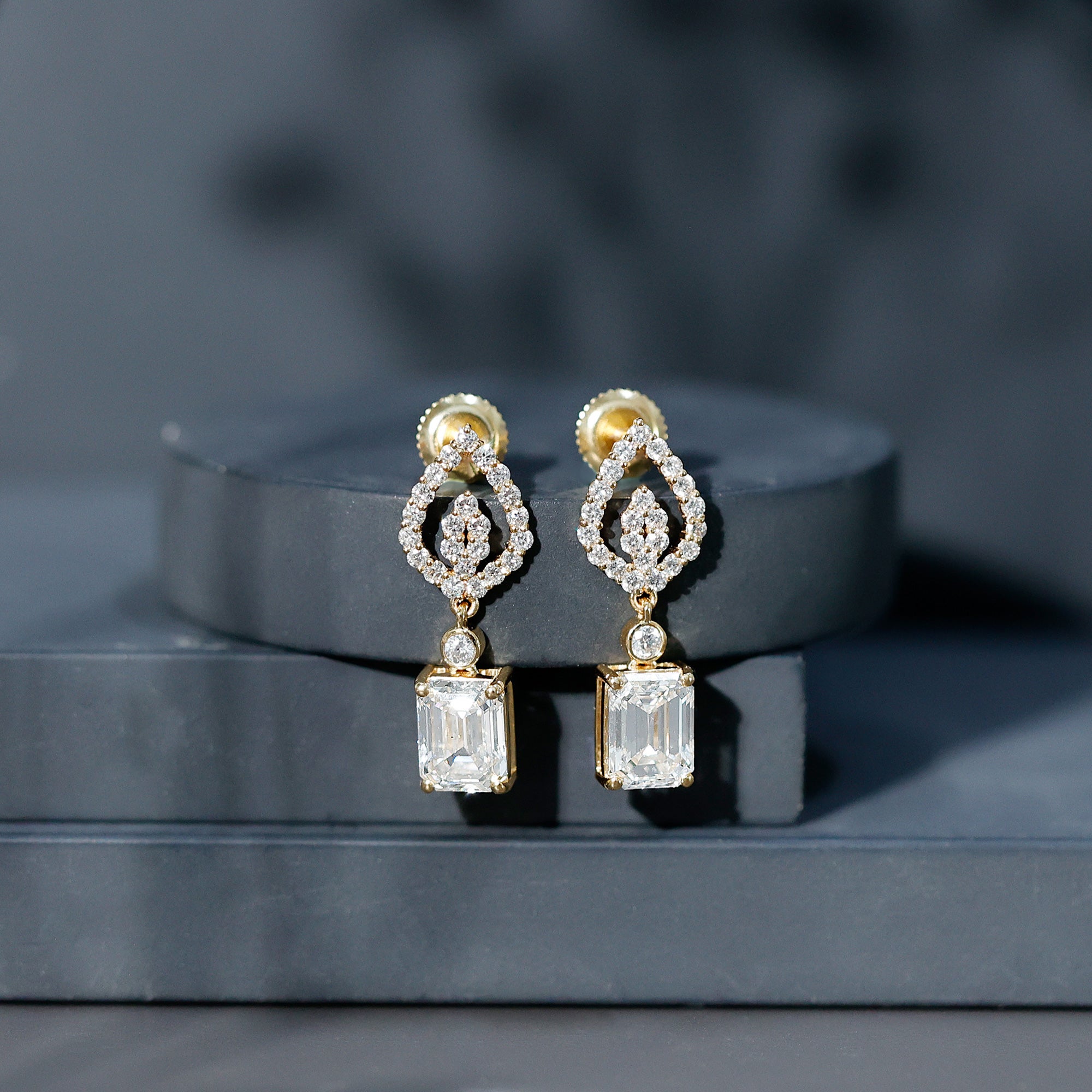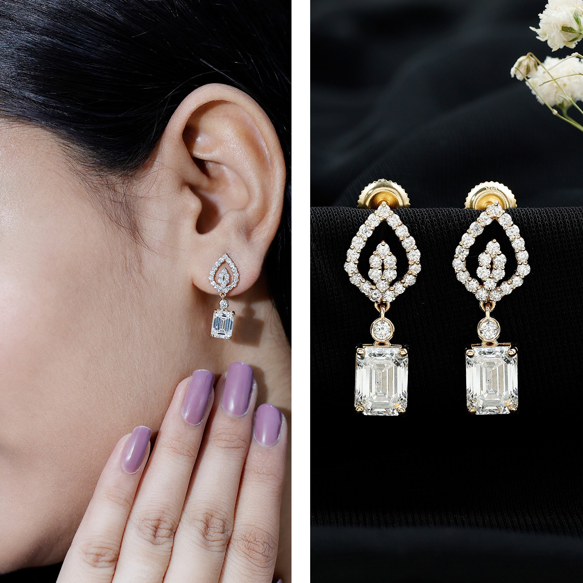 These Drop Earrings are designed to make an impression, featuring a stunning 6X8 MM emerald cut lab-grown diamond elegantly set in prong setting. They dangle gracefully from a delicate drop-shaped design adorned with sparkling round cut gemstones. With a screw back finding, these Emerald Cut Earrings ensure a comfortable and secure fit for all-day wear. The lab-created diamonds provide the same breathtaking beauty as natural ones but at a more budget-friendly price. If youre searching for a meaningful gift for someone born in April, these Synthetic Diamond Earrings are a perfect choice. Whether youre a bride seeking vintage elegance or a romantic soul looking for jewelry to enhance your date night, these Wedding Earrings will undoubtedly add a distinctive flair to your style.