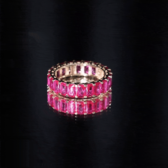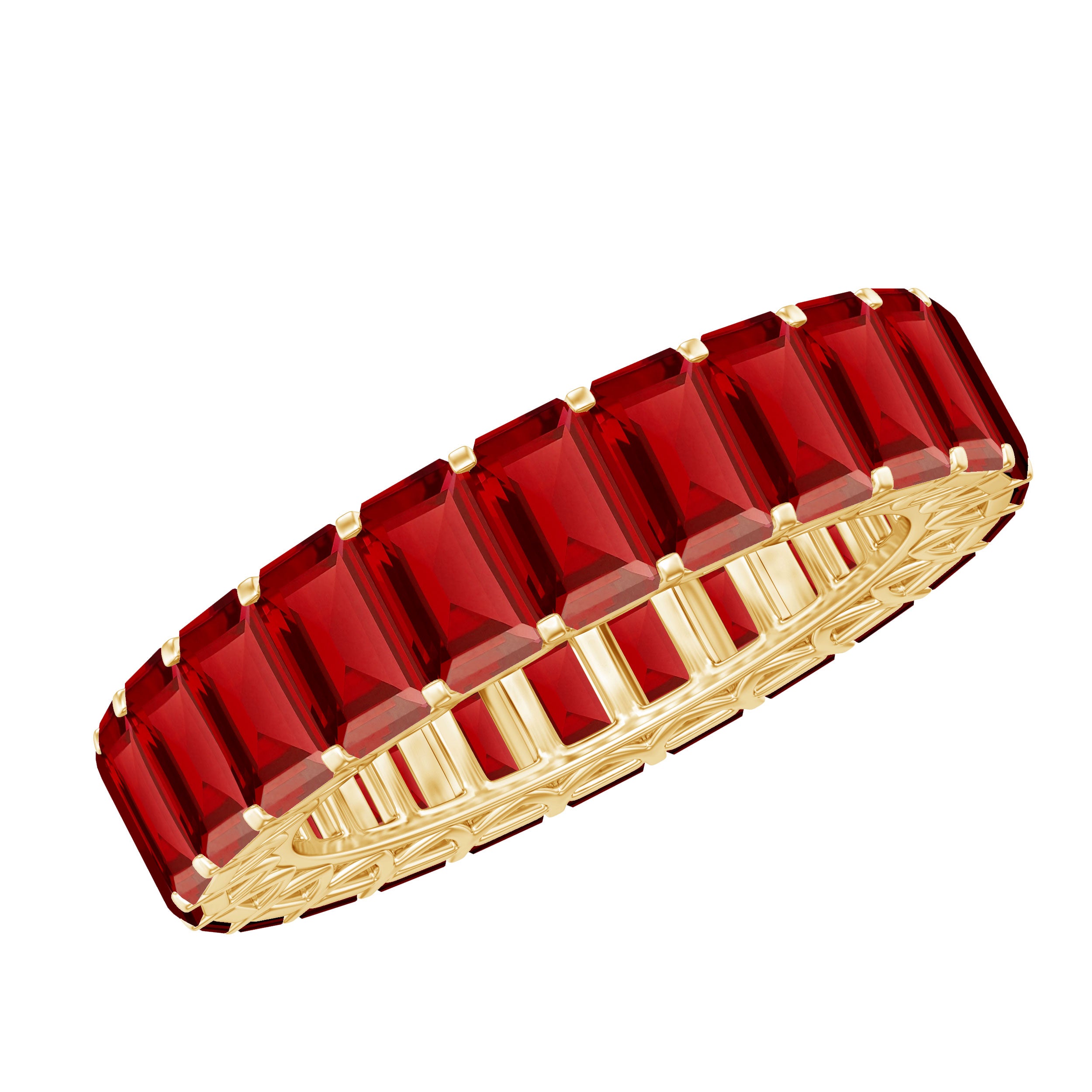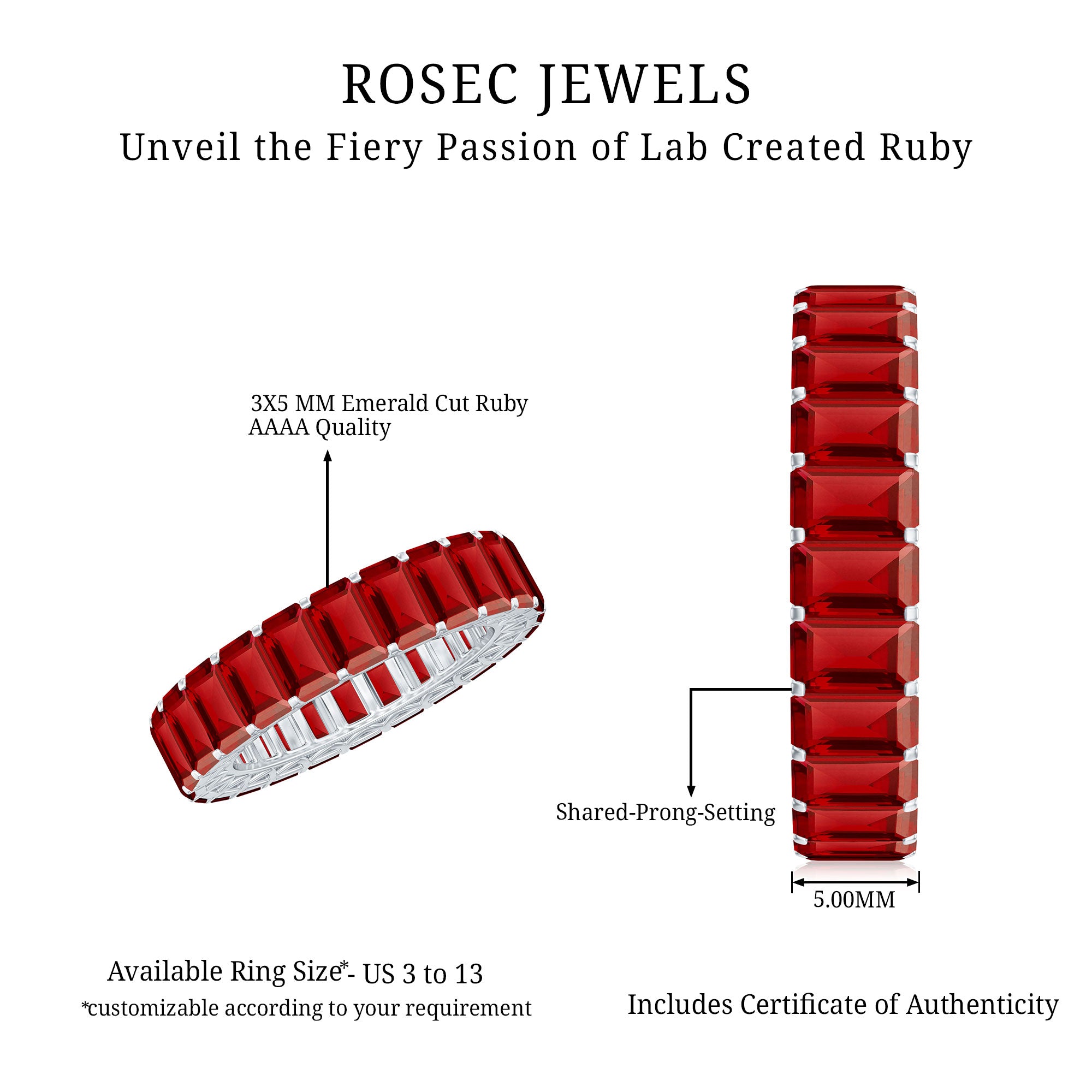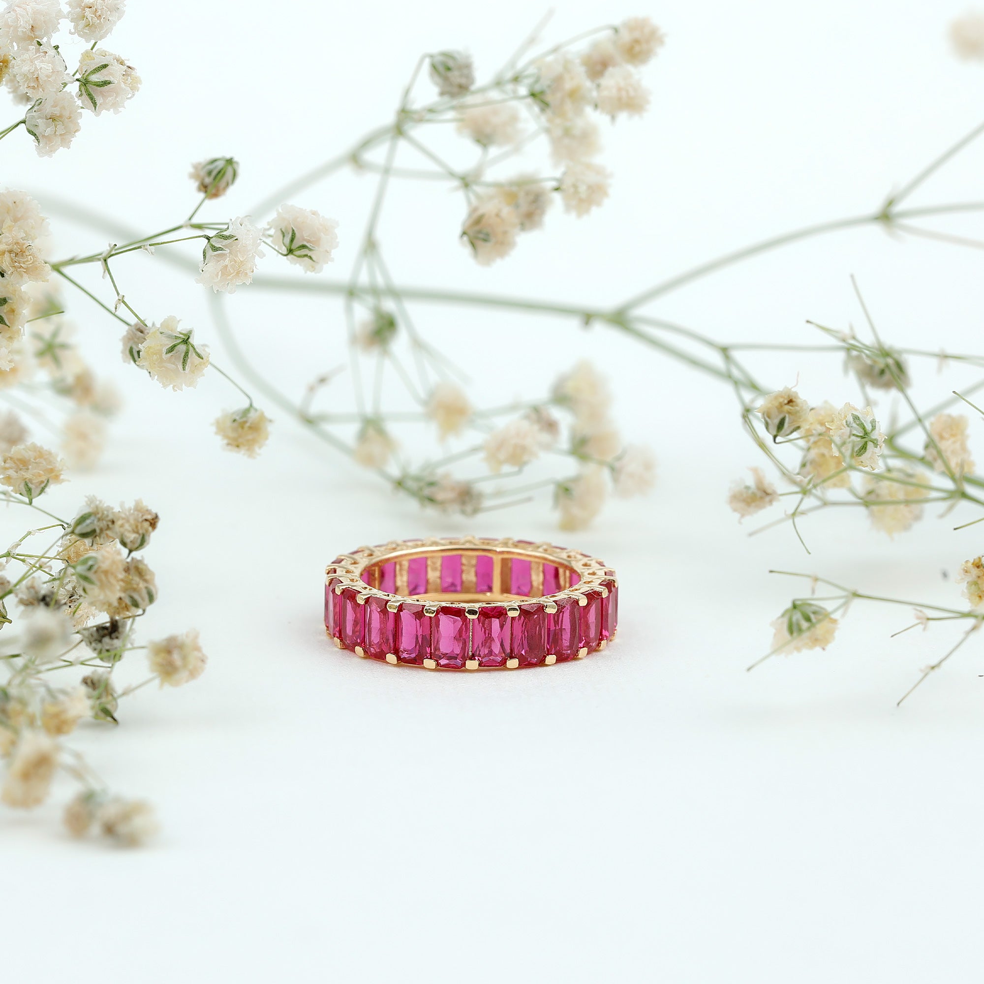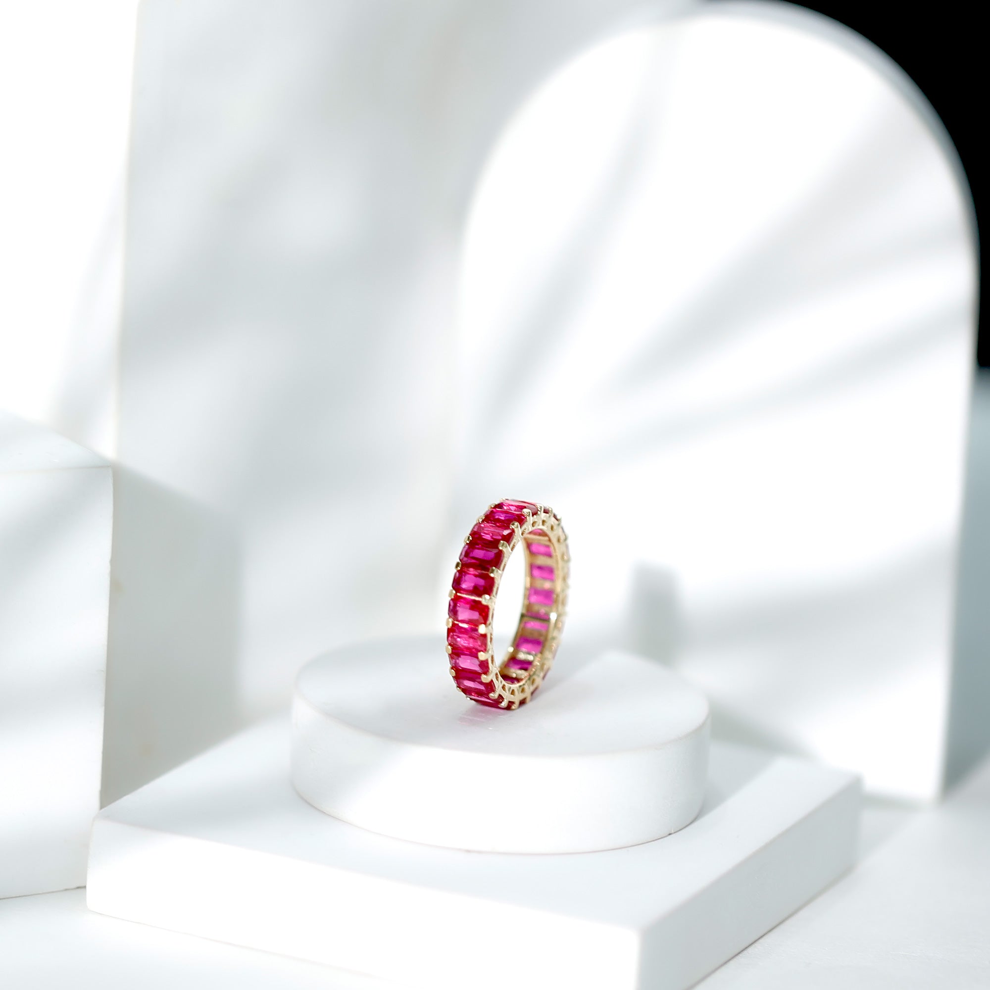 * Adorn your hand with this eye catching Red Ruby Band Ring and make a bold statement while complementing your look.* Multiple Lab Created Ruby in Emerald Cut are set closely over the unending circle in Shared Prong Setting, making a perfectly classy Full Eternity Ring.* The Elongated Emerald Cut Ruby Band is a Wide Ring which is self enough to grab all eyes, but it can also be stacked with a Sleek Stacking Ring to create more stylish look.* The striking Red Color of this Certified Ruby Eternity Ring will add compliments to your look for special dates, cocktails nights, random parties.